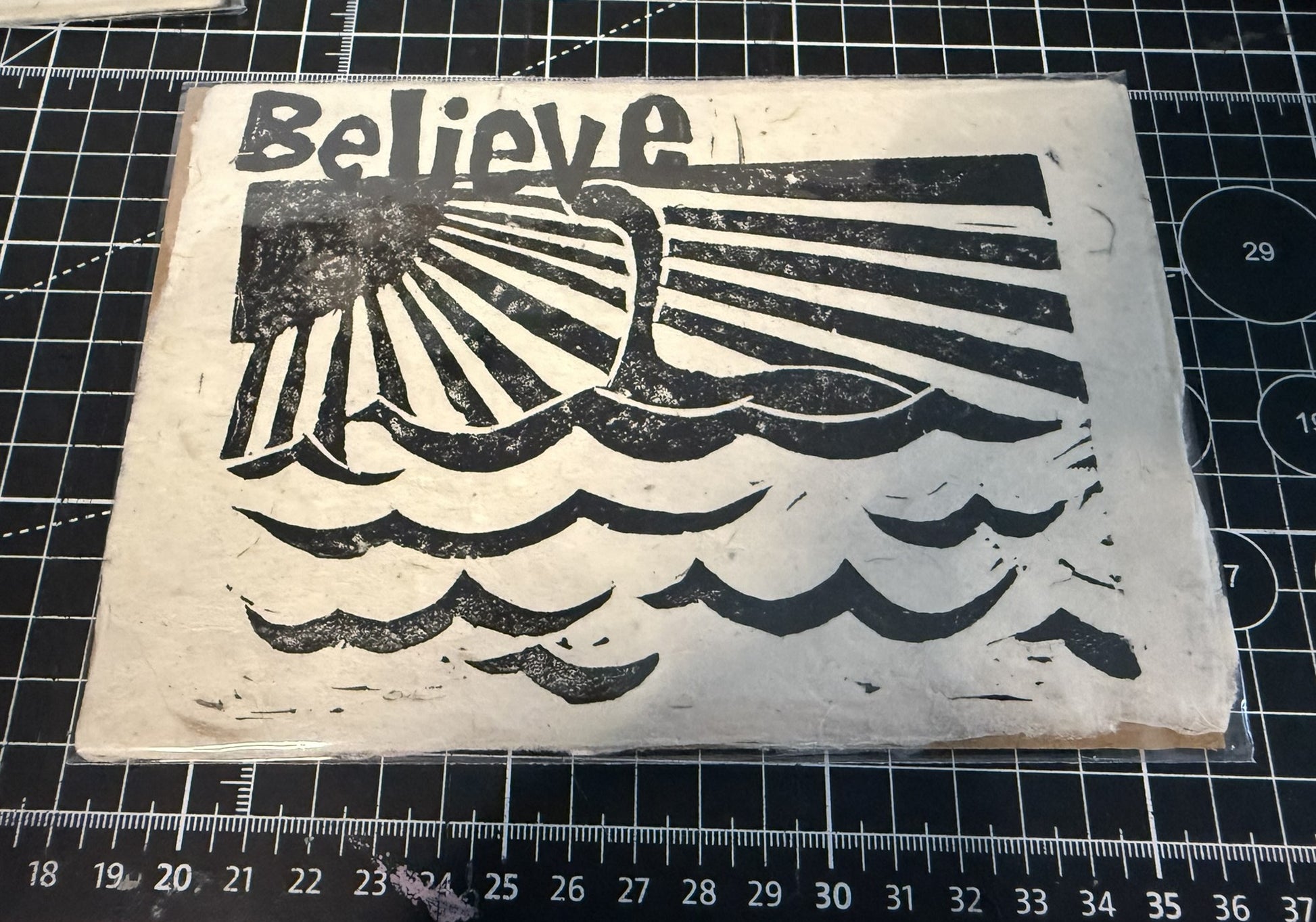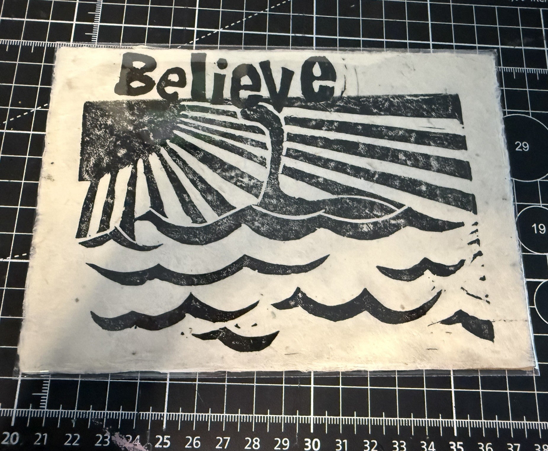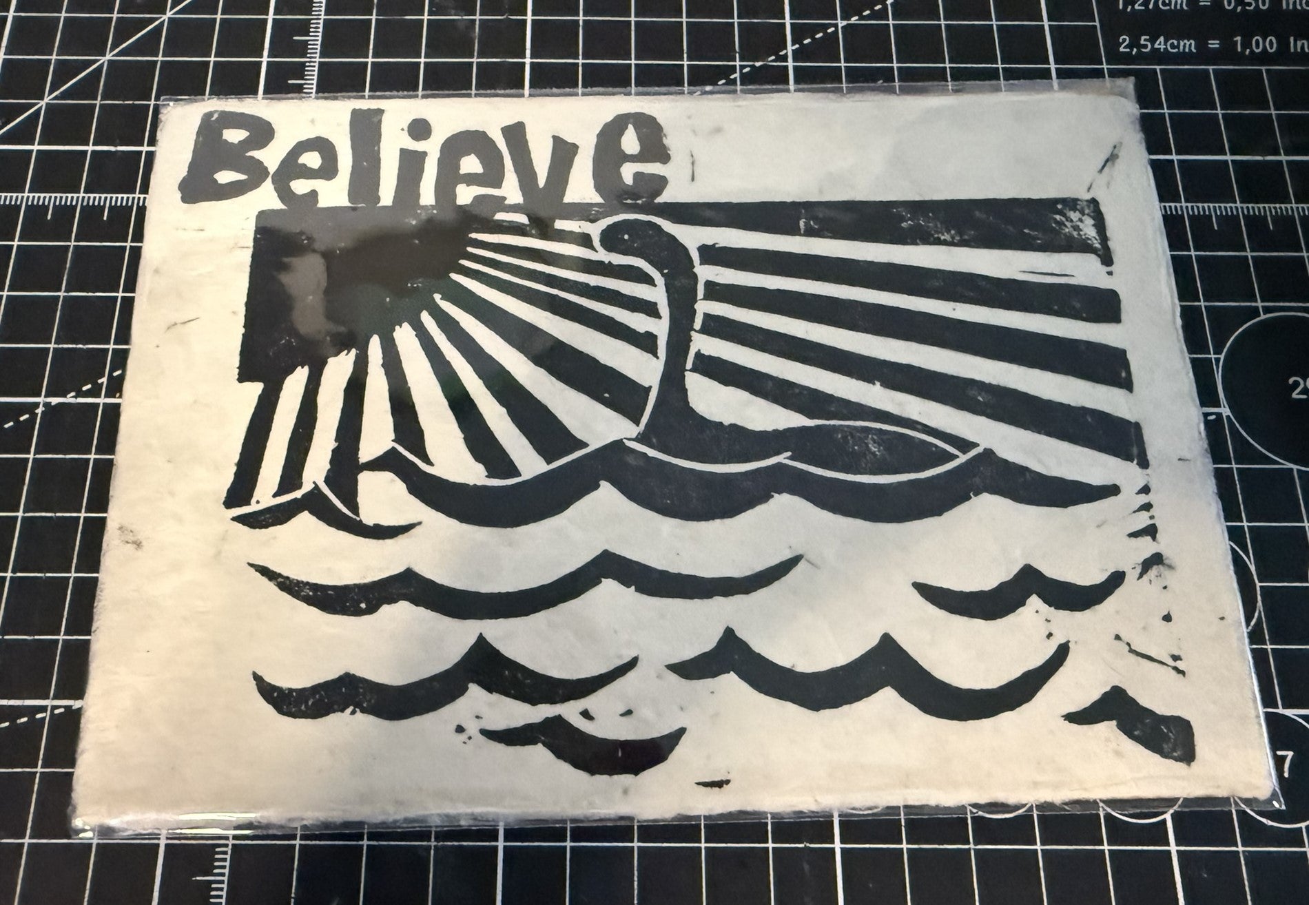 Is it faith? Hope? A very charming sea creature with radiant sunbeams? Yes. This 5x7 linocut print features Nessie gliding through stylized waves under a banner that reads “Believe.” Hand-carved and hand-printed on textured lokta paper, it’s a tribute to curiosity, cryptids, and maybe even optimism.