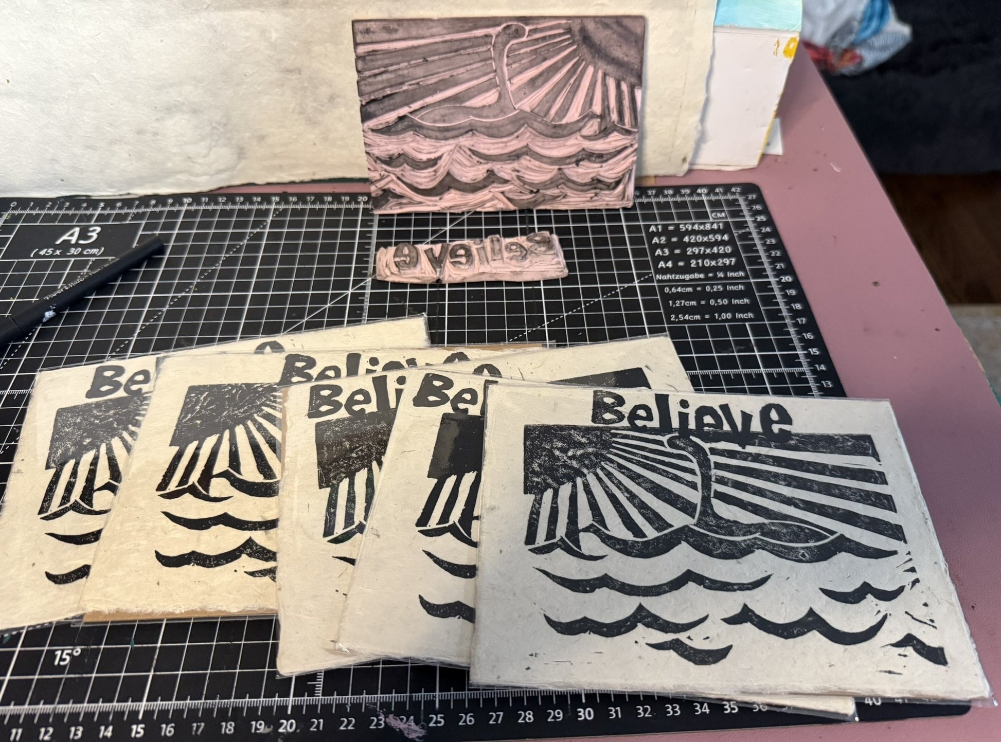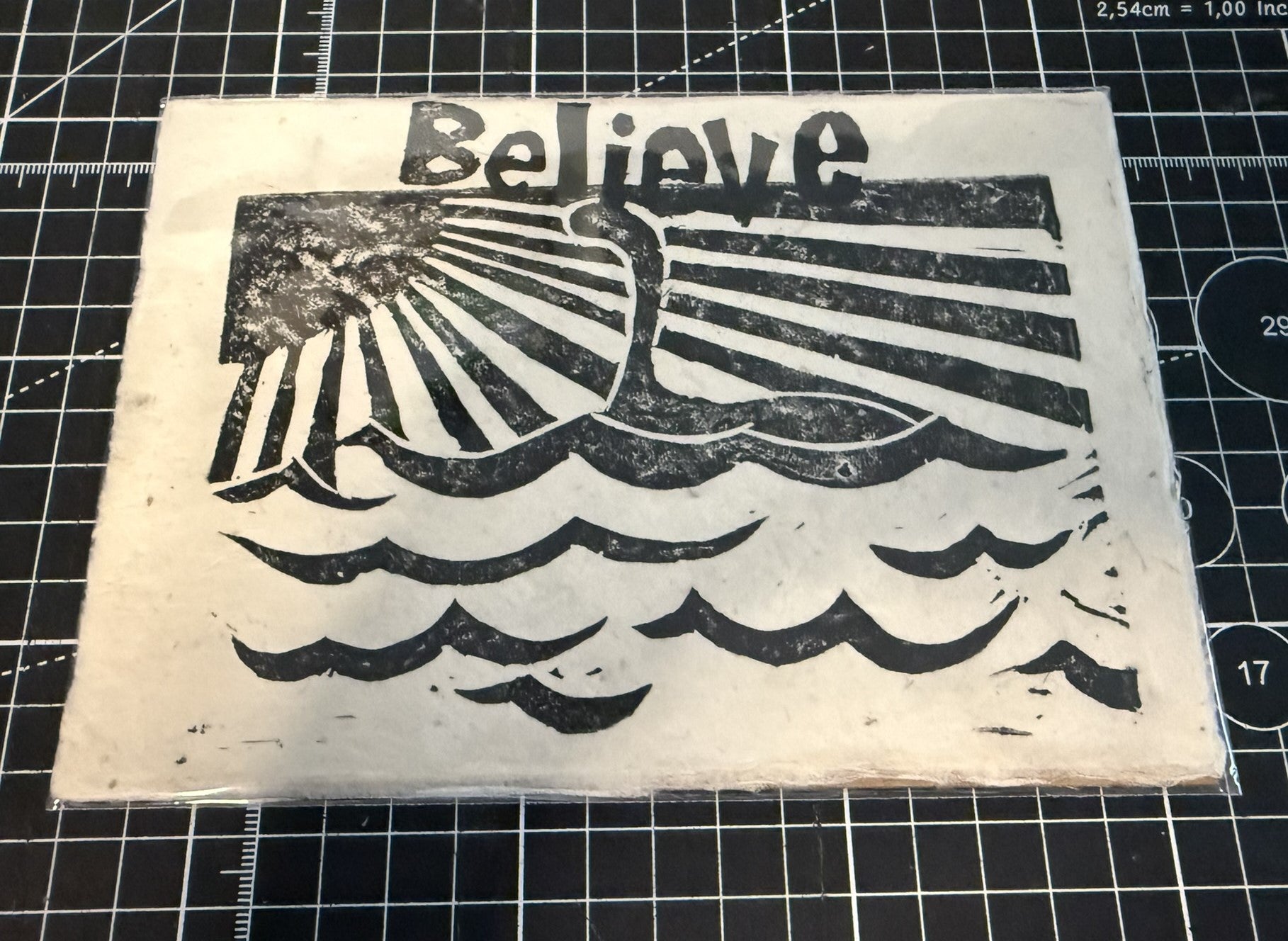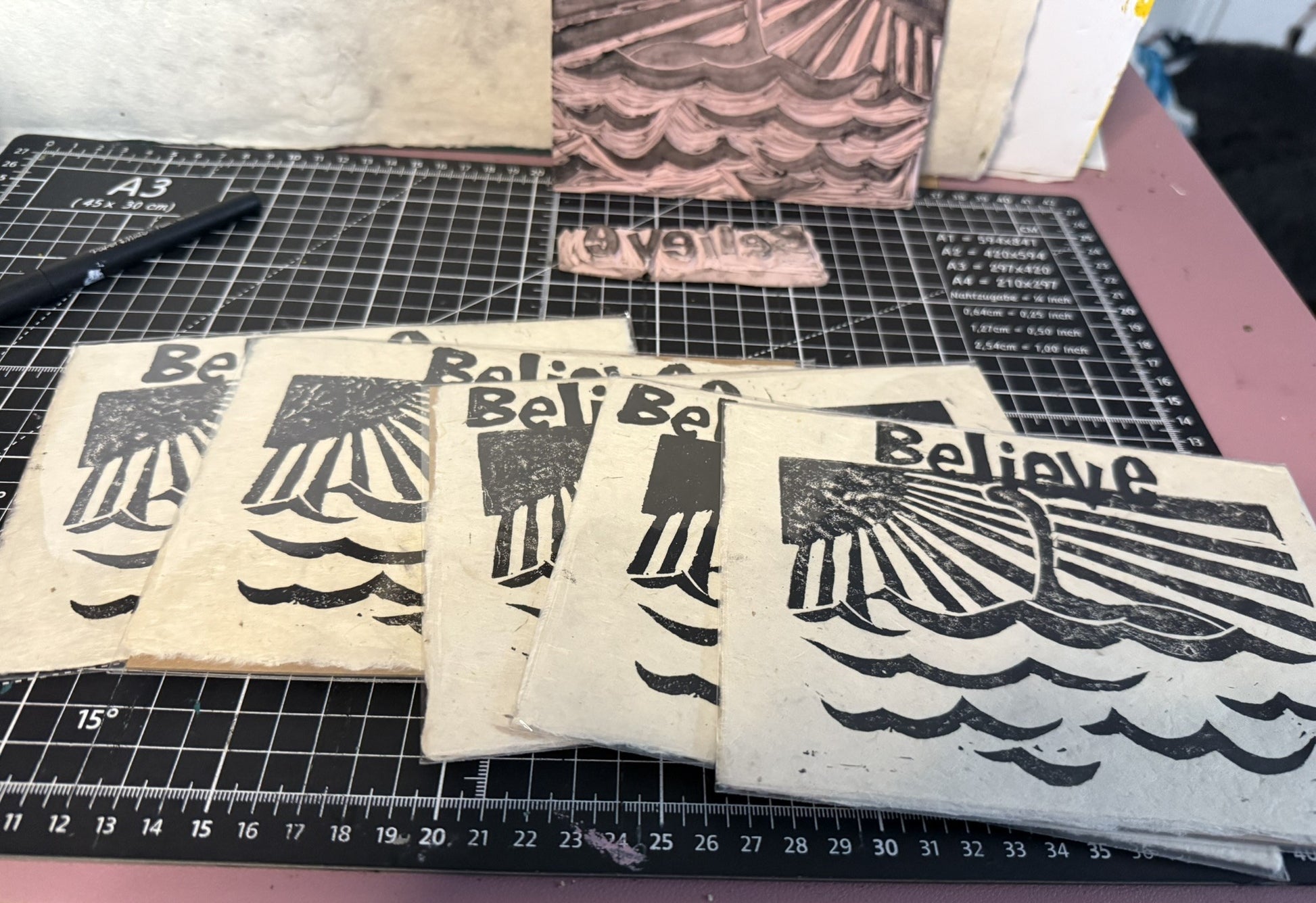 Is it faith? Hope? A very charming sea creature with radiant sunbeams? Yes. This 5x7 linocut print features Nessie gliding through stylized waves under a banner that reads “Believe.” Hand-carved and hand-printed on textured lokta paper, it’s a tribute to curiosity, cryptids, and maybe even optimism.