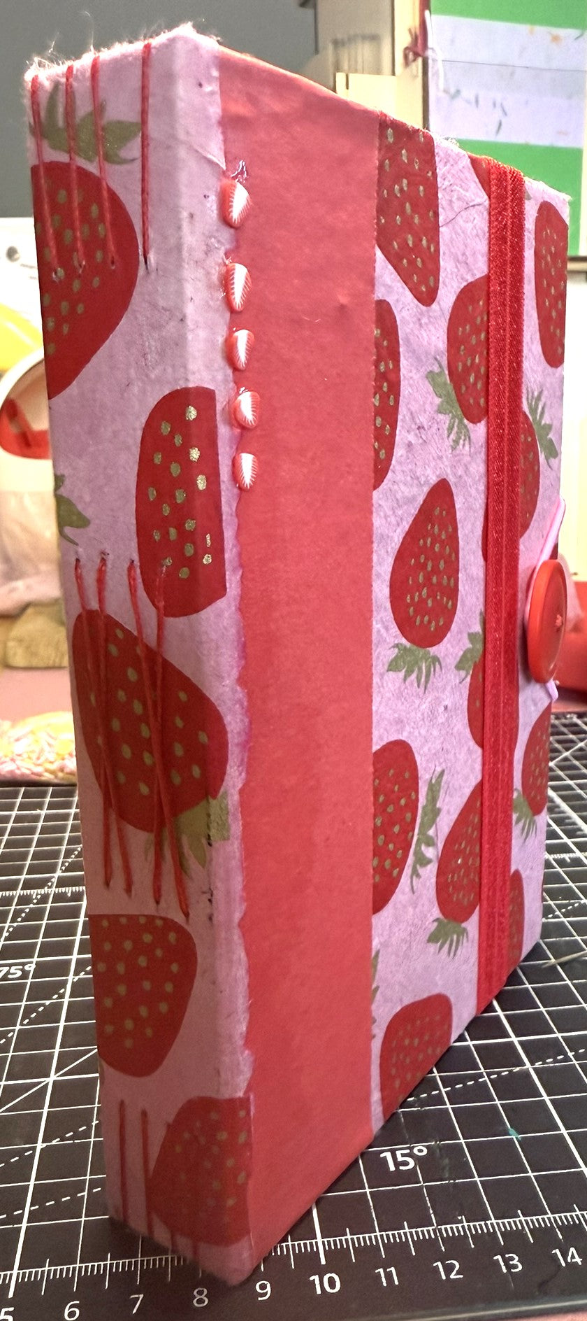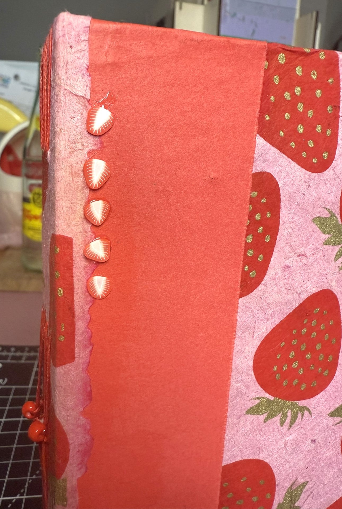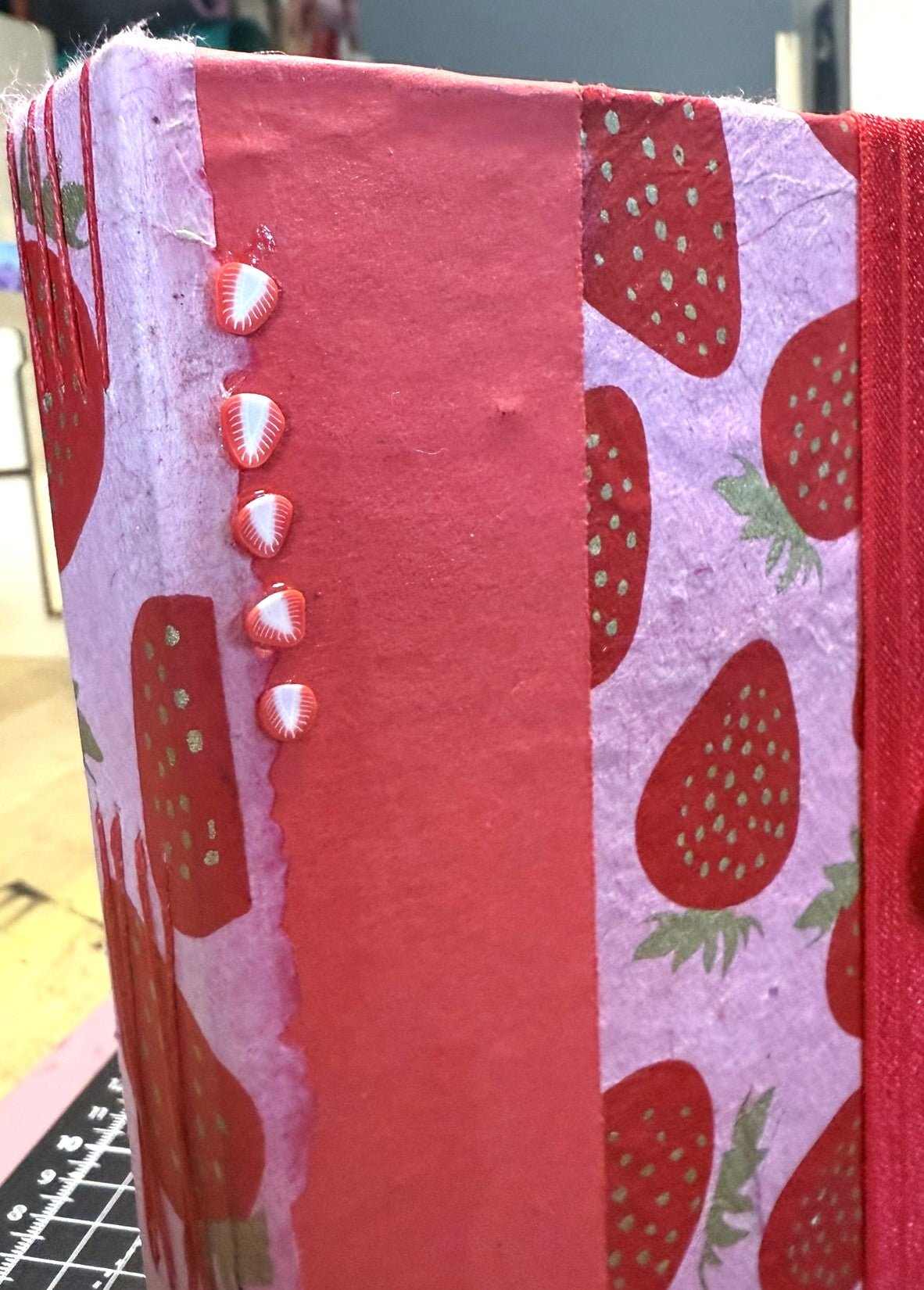 This 5" x 7" handmade journal features vibrant pink lokta paper printed with red and gold strawberries, layered with red kraft and a coordinating strawberry print for extra texture. Five polymer strawberry slices add a little 3D flair.