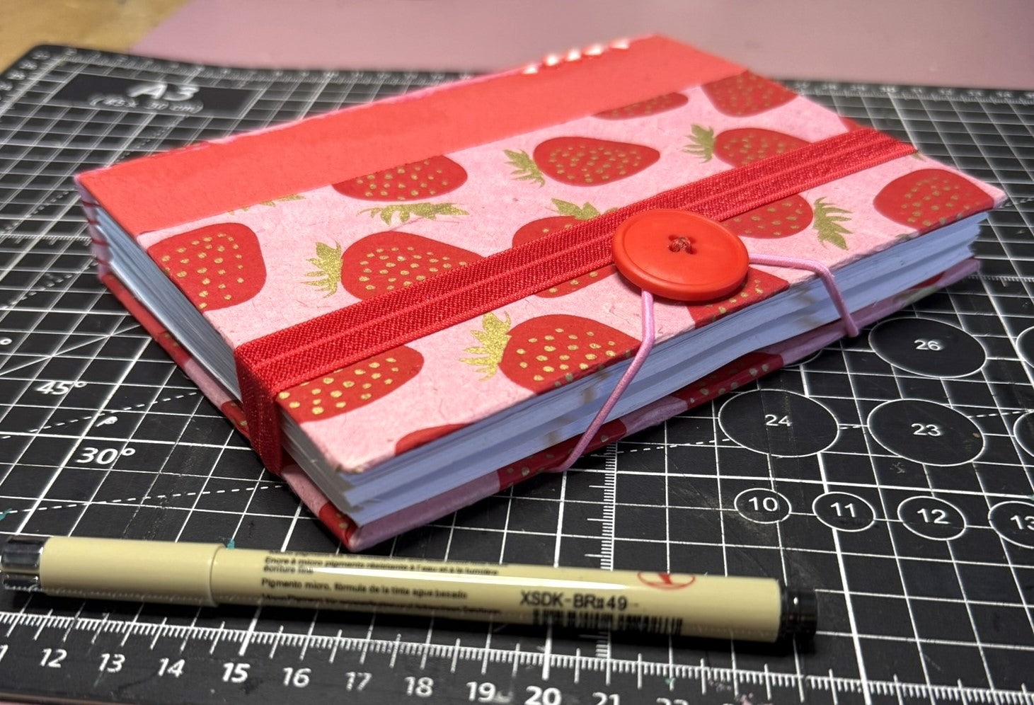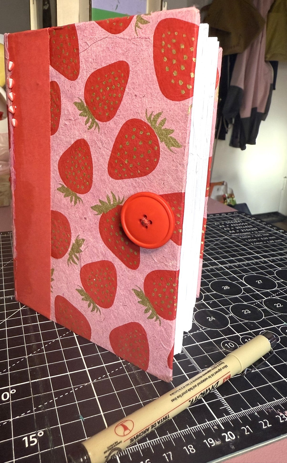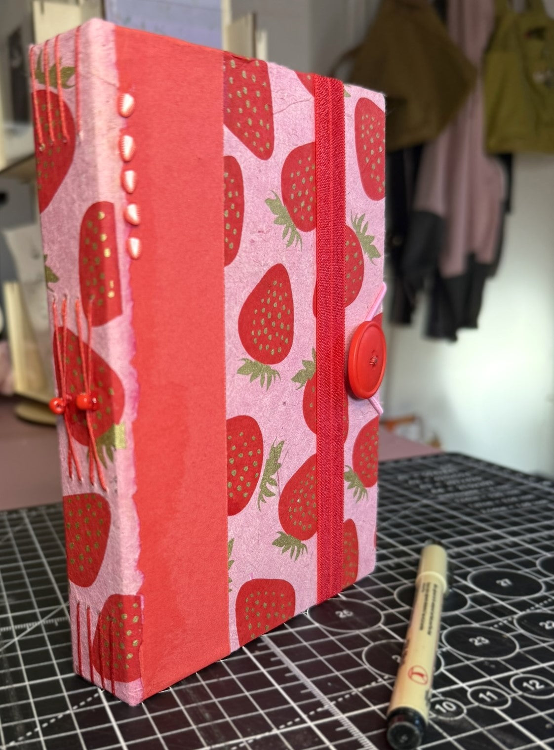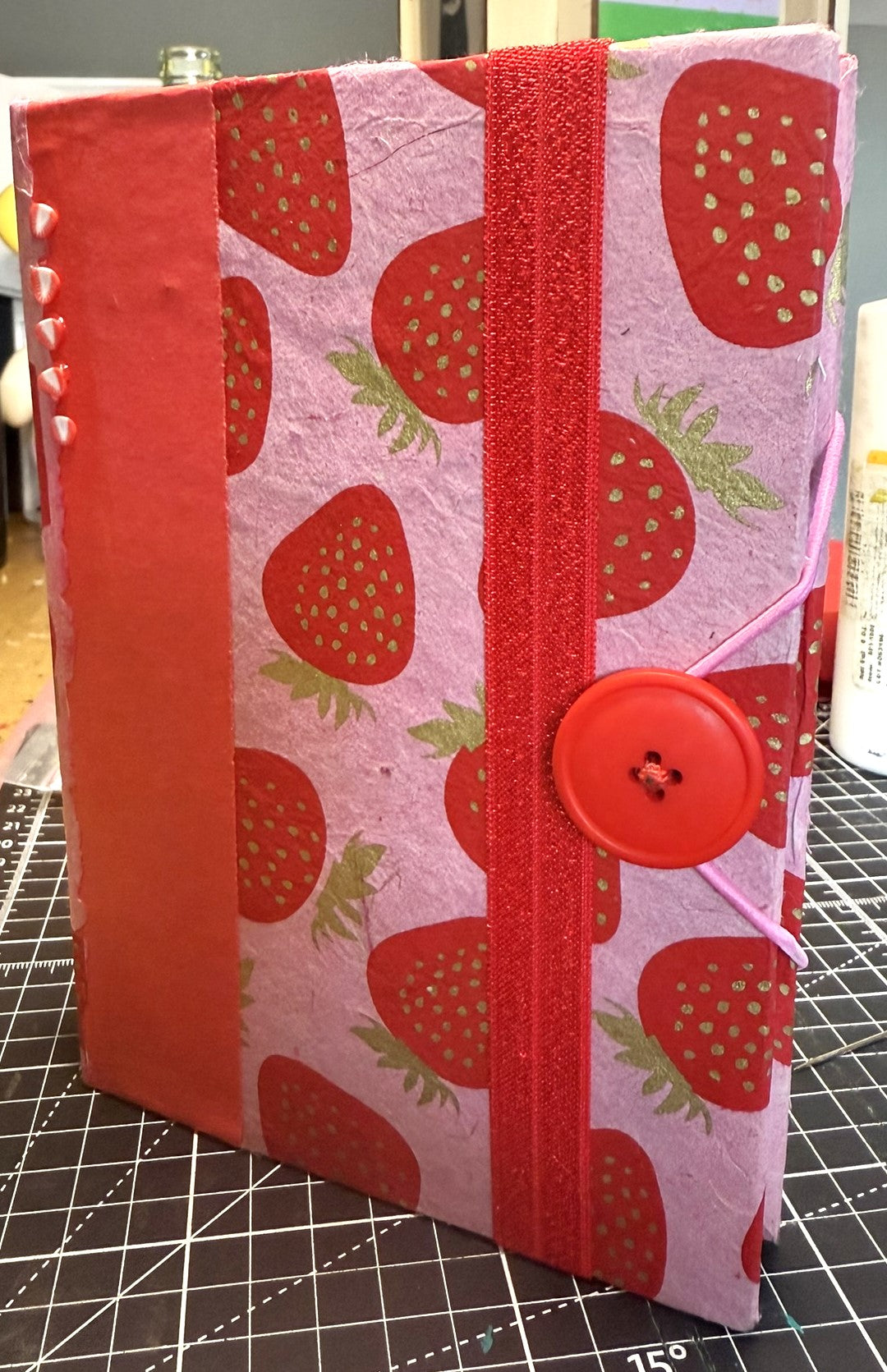 This 5" x 7" handmade journal features vibrant pink lokta paper printed with red and gold strawberries, layered with red kraft and a coordinating strawberry print for extra texture. Five polymer strawberry slices add a little 3D flair.