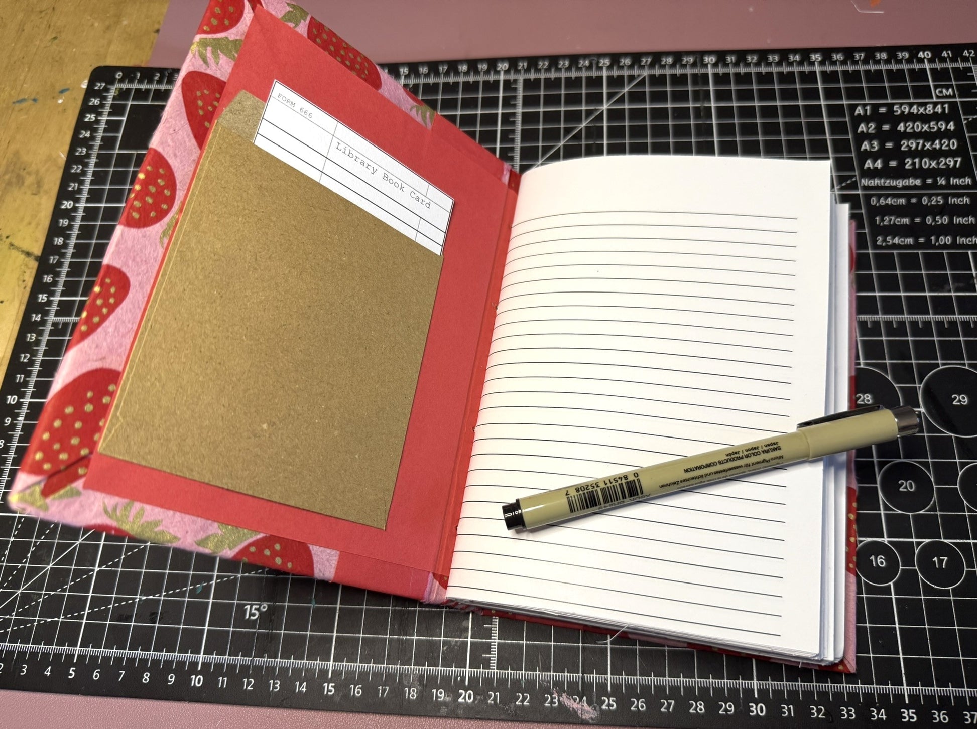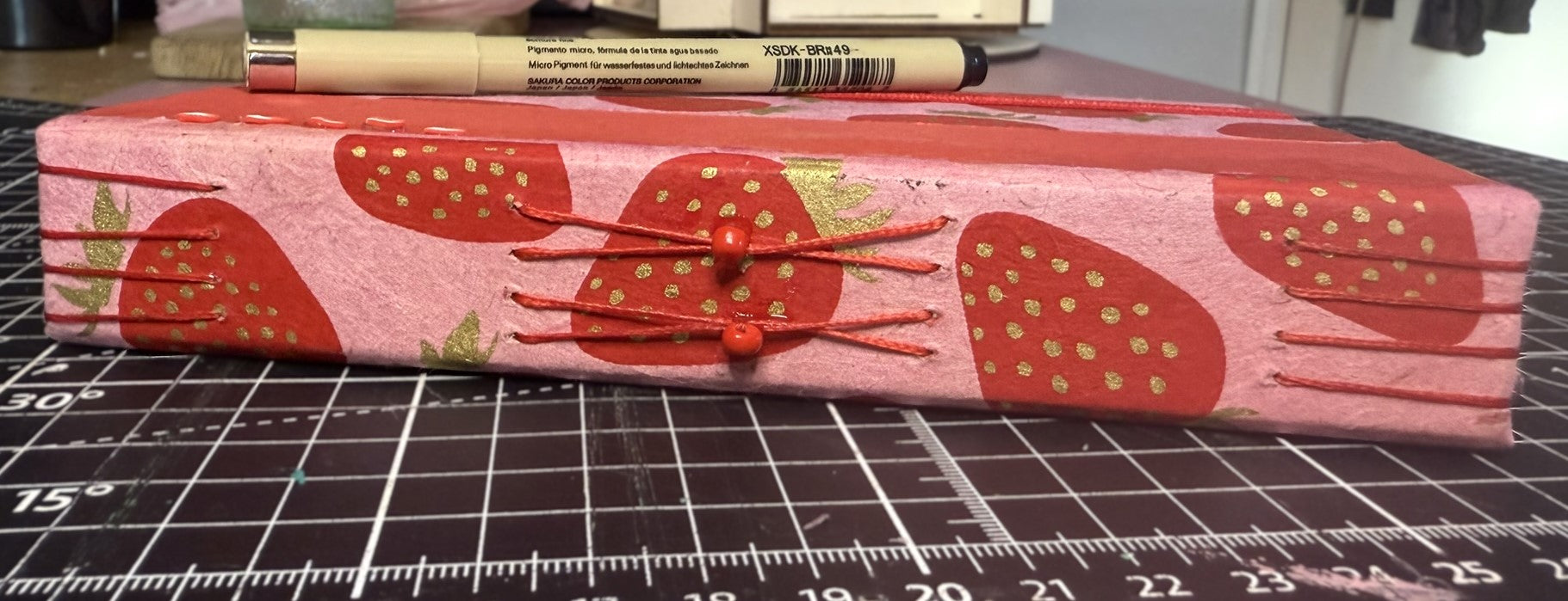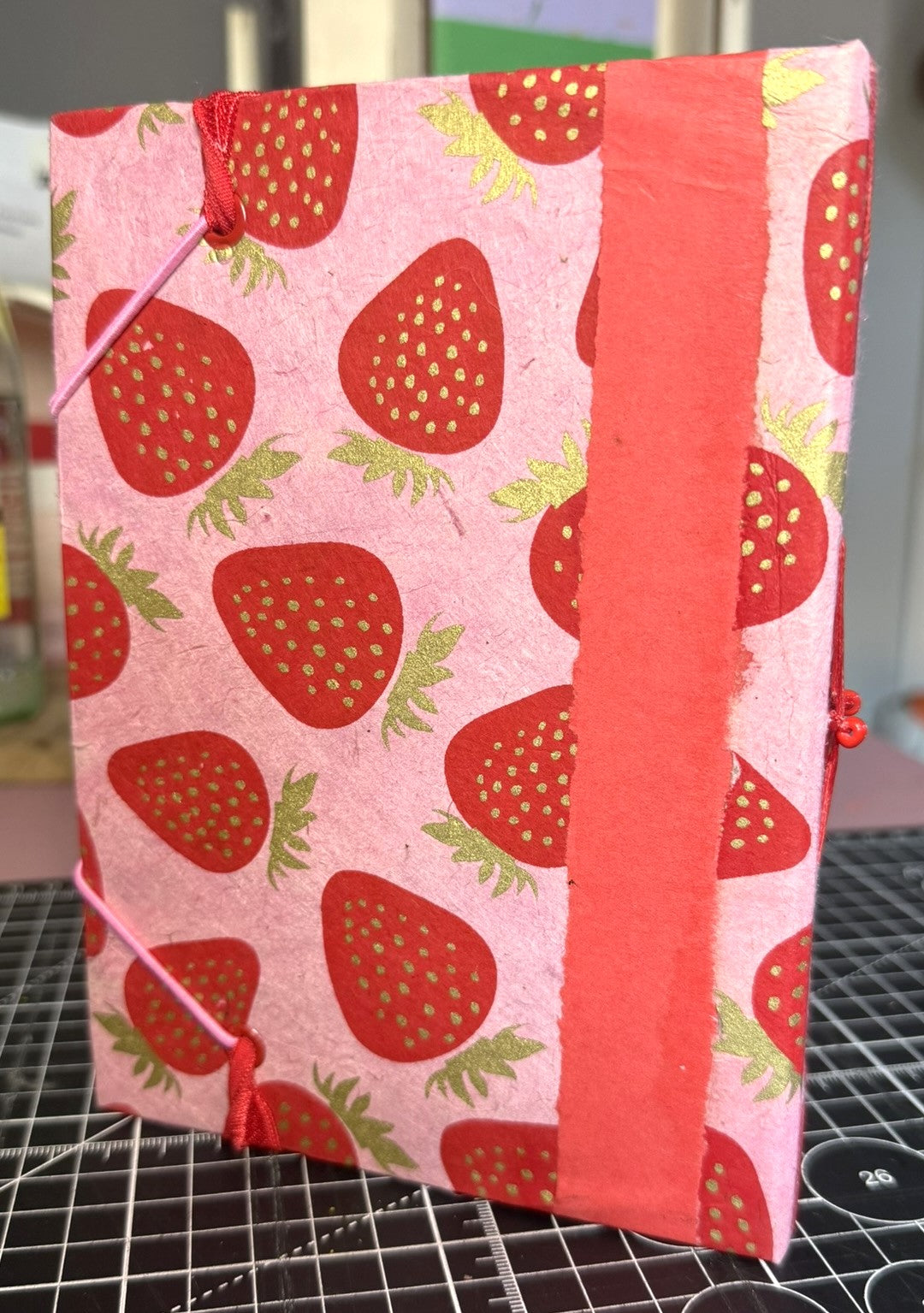 Cover: Pink lokta with red and gold strawberry print