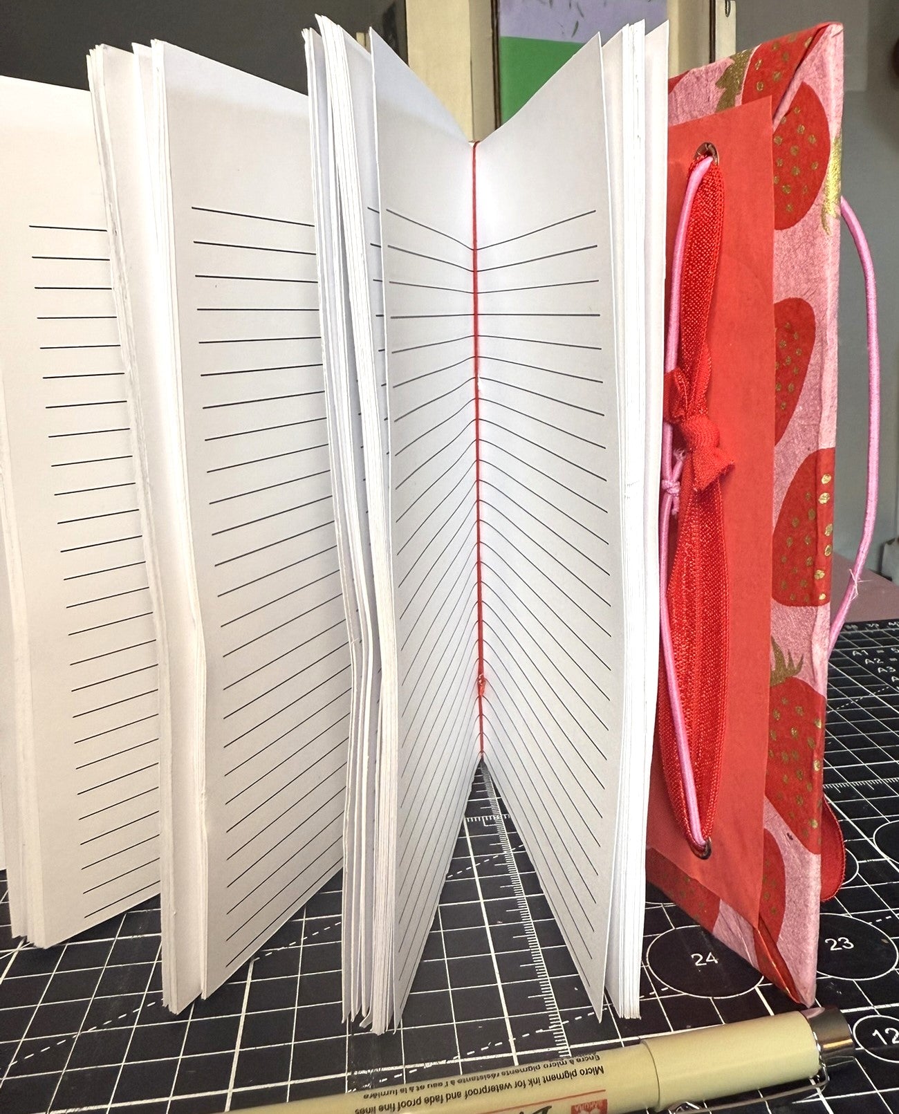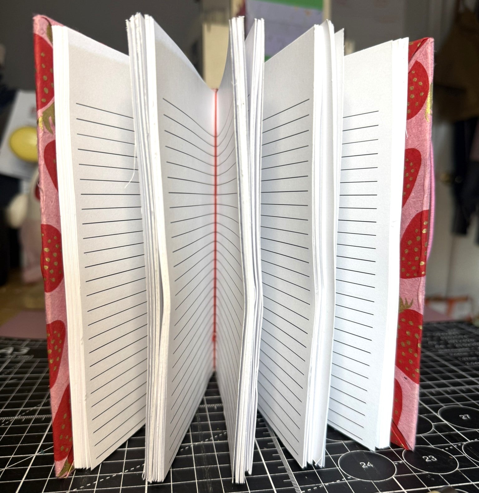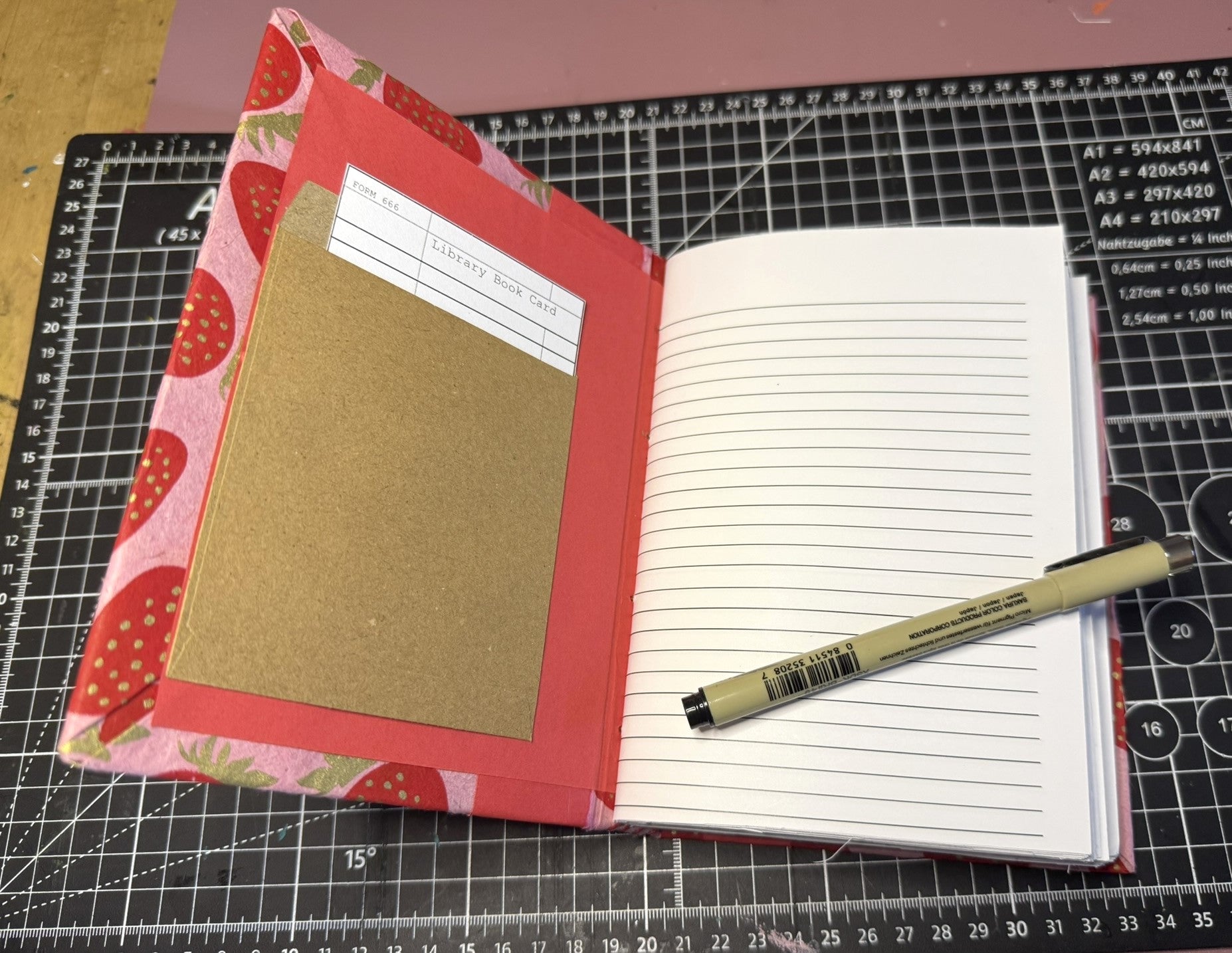 Cover: Pink lokta with red and gold strawberry print