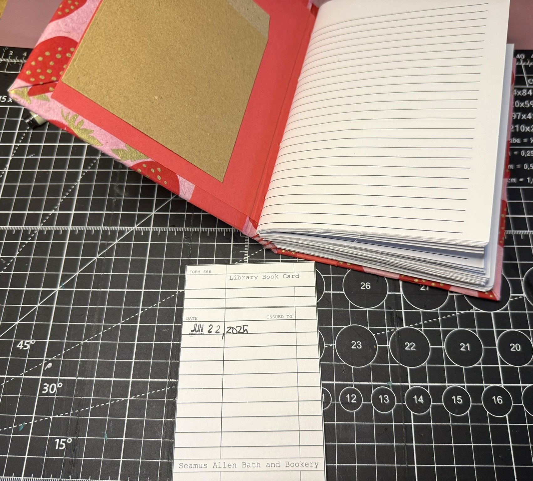 A large red button anchors the front closure, and two red elastics (one thin, one thick) can wrap multiple ways to keep your pages secure. Inside, 96 lined, hand-printed pages await your notes, lists, or late-night musings, with a stamped library card pocket marking the date this journal was completed.