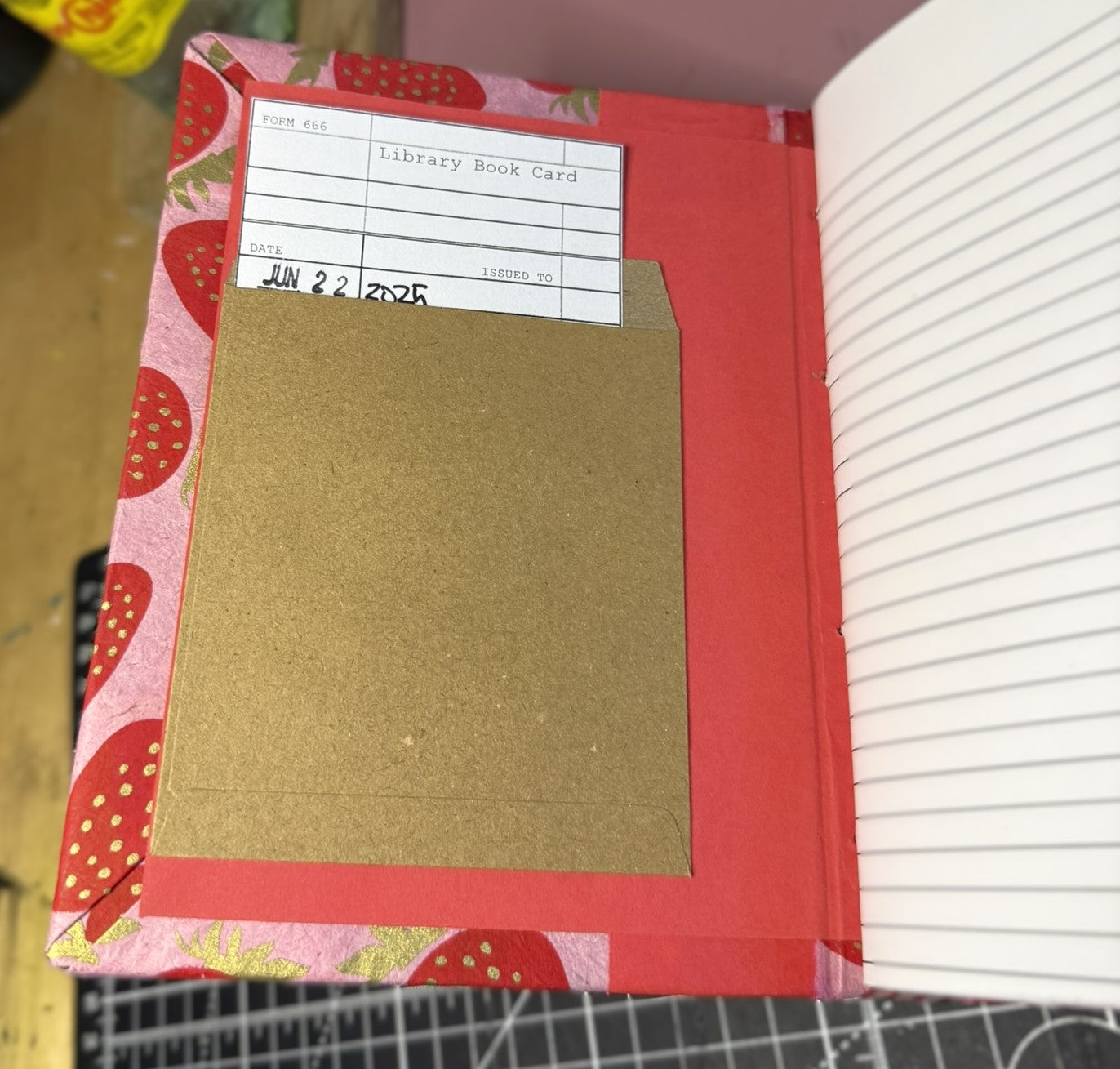 Detail: Five polymer strawberry slices on cover; stamped library card inside