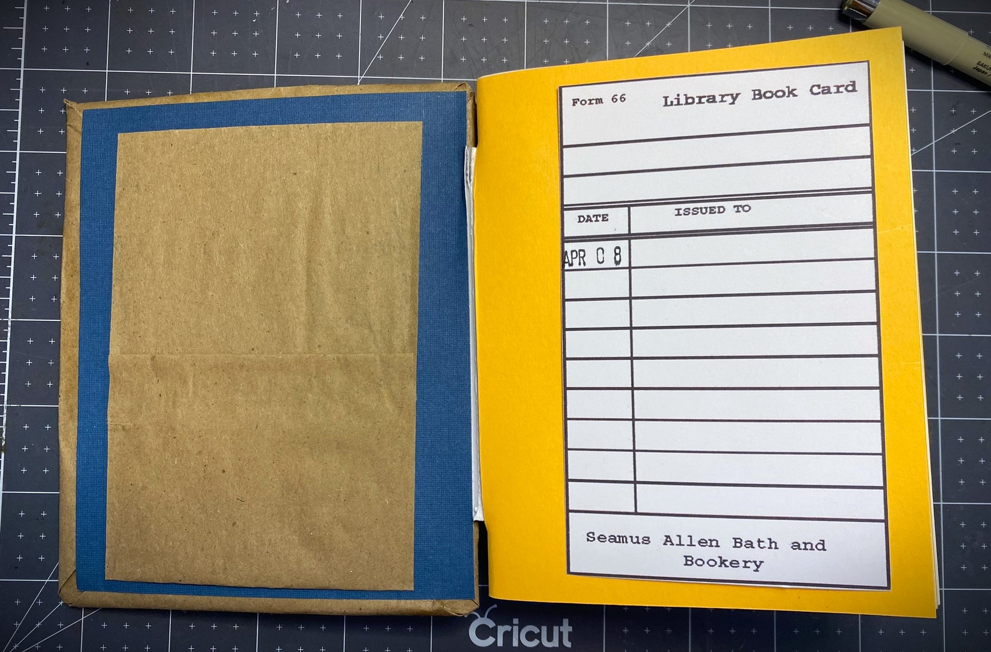 Inside of front cover features a library card, stamped with the date the book was completed. This card can be removed and/or used as a bookmark.