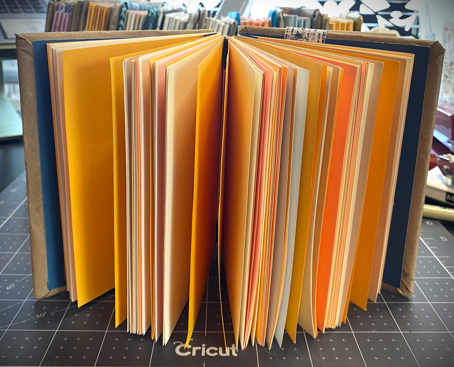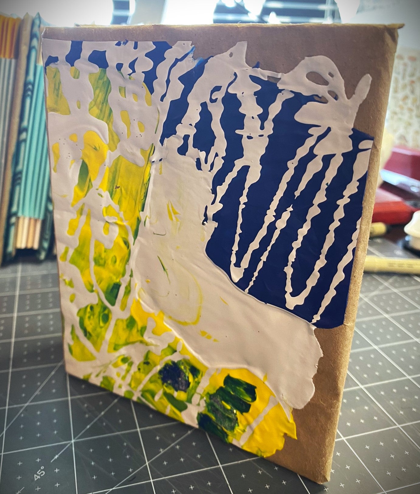 If you like texture, this may be the journal for you. Front cover features a cut pallet of acrylic paint in blue, grey, and yellow on a paper bag like paper. Back cover features a pocket band and is wrapped in a paper bag like paper. All papers are recycled or reused, pages may have imperfections. This journal is unlined and hand bound using a static accordion method. This allows me to "lock" each signature in with a piece of paper. Technically, these pages can come out, but they are a bit tricky to reinstall.