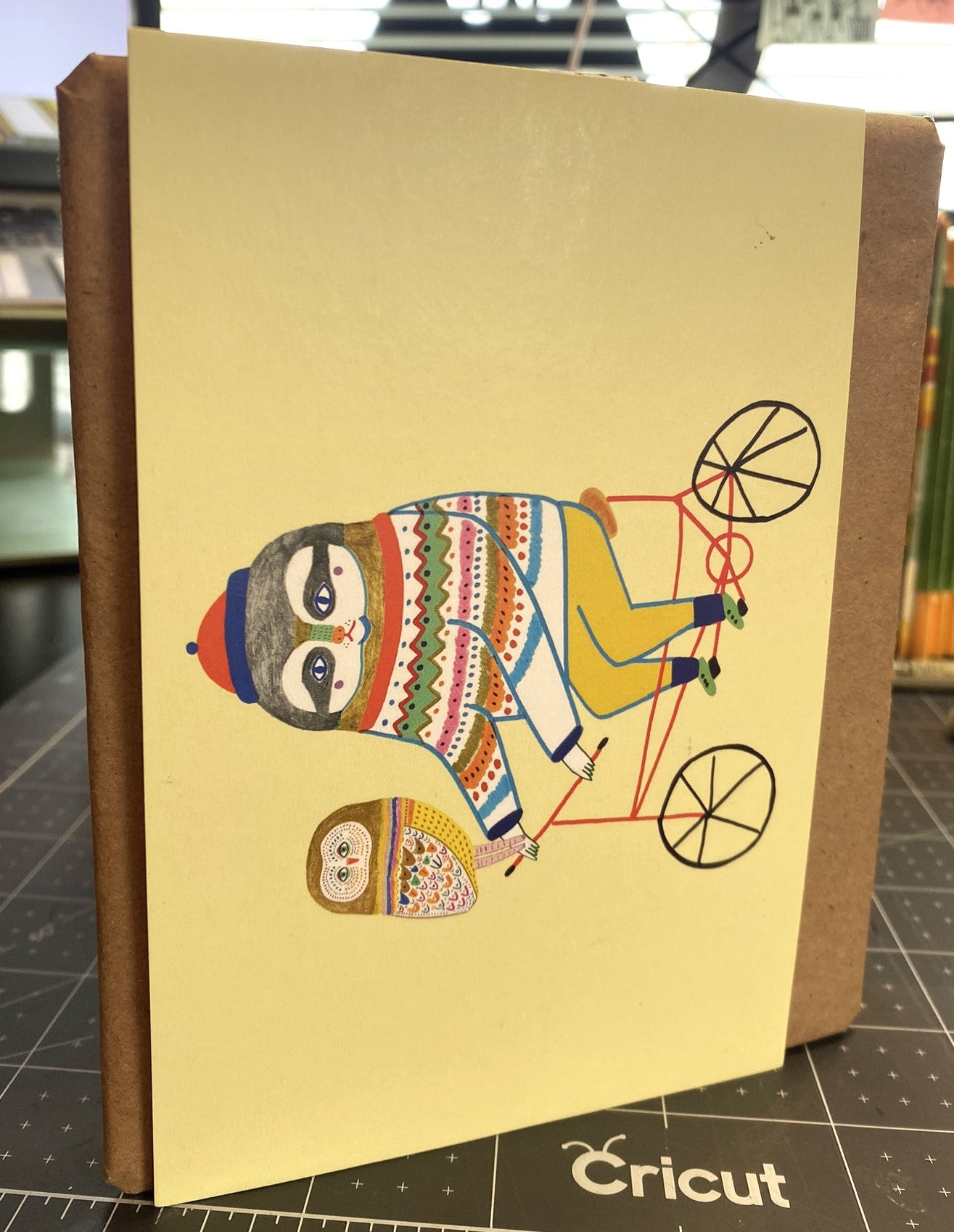 Journal also comes with a back cover paper pocket band that can be used or removed. It can catch little bits of paper, or indicate where you are in your journal. It can also be flattened and used as a bookmark. This paper band features a cycling sloth postcard from iKea.