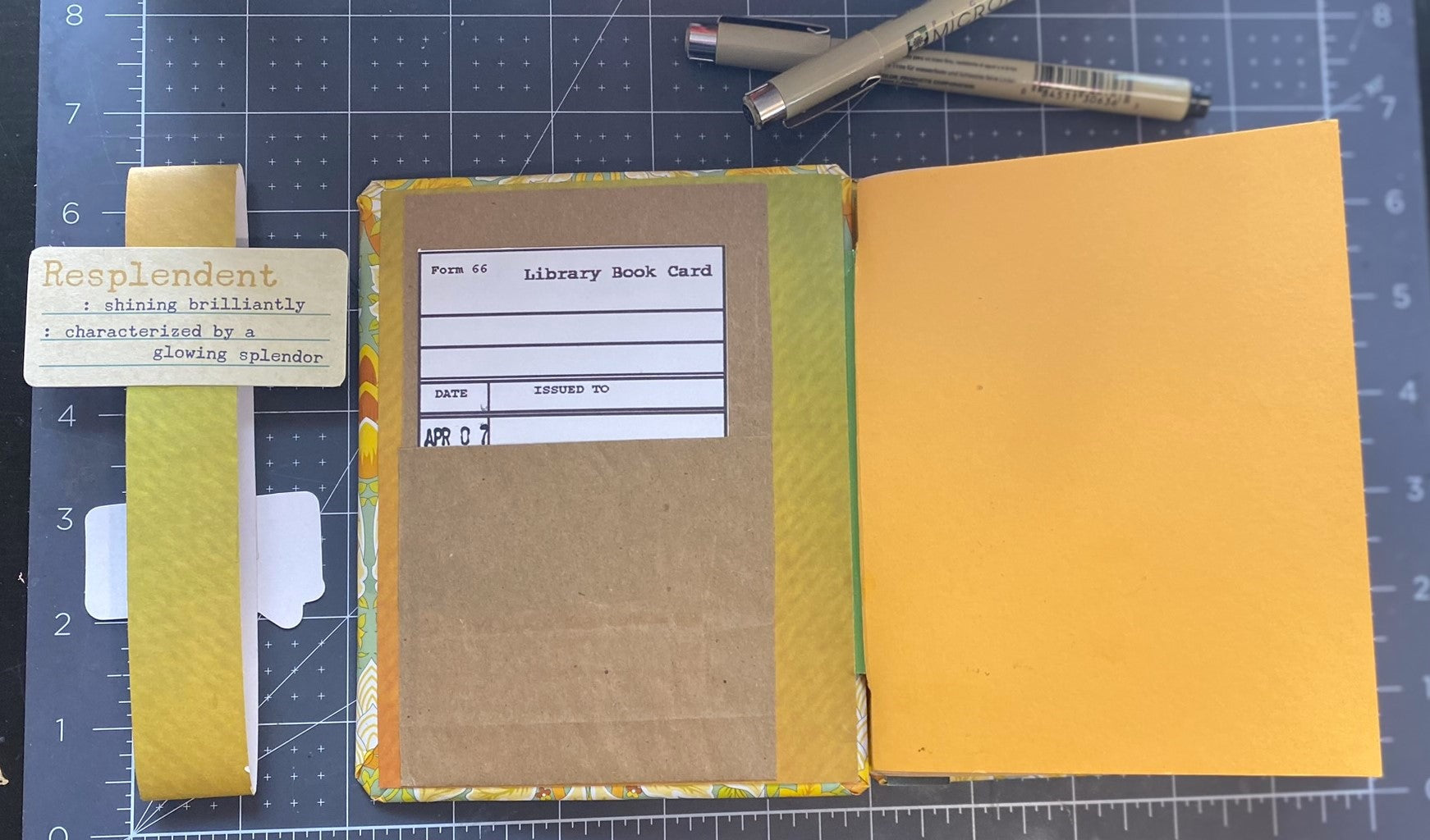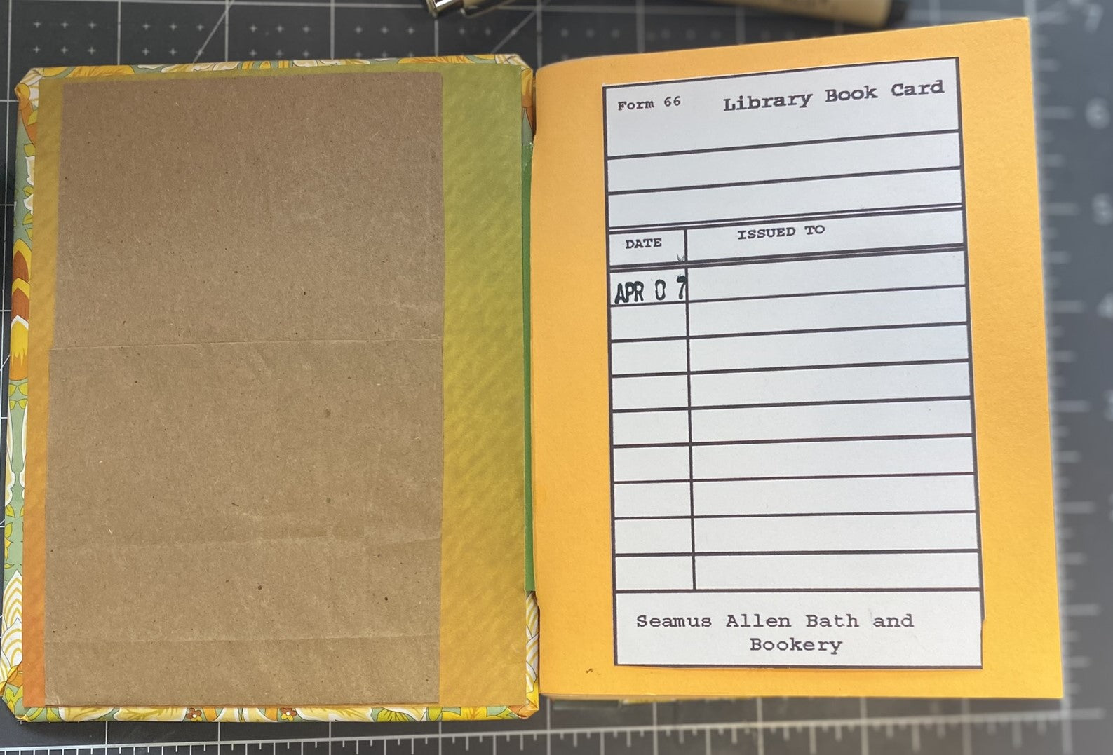 Inside of front cover features a library card, stamped with the date the book was completed. This card can be removed and/or used as a bookmark.