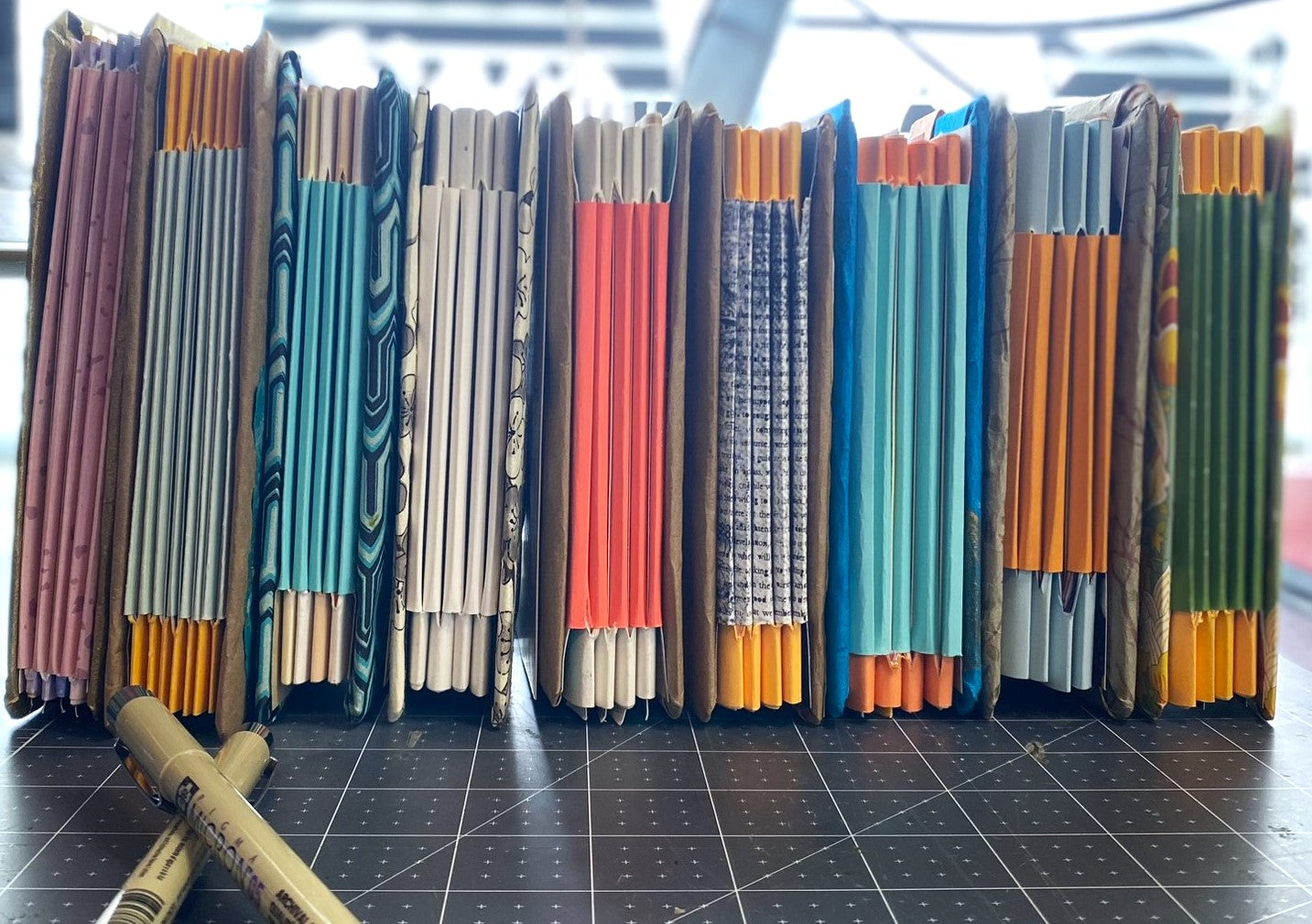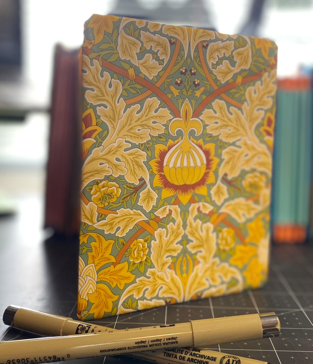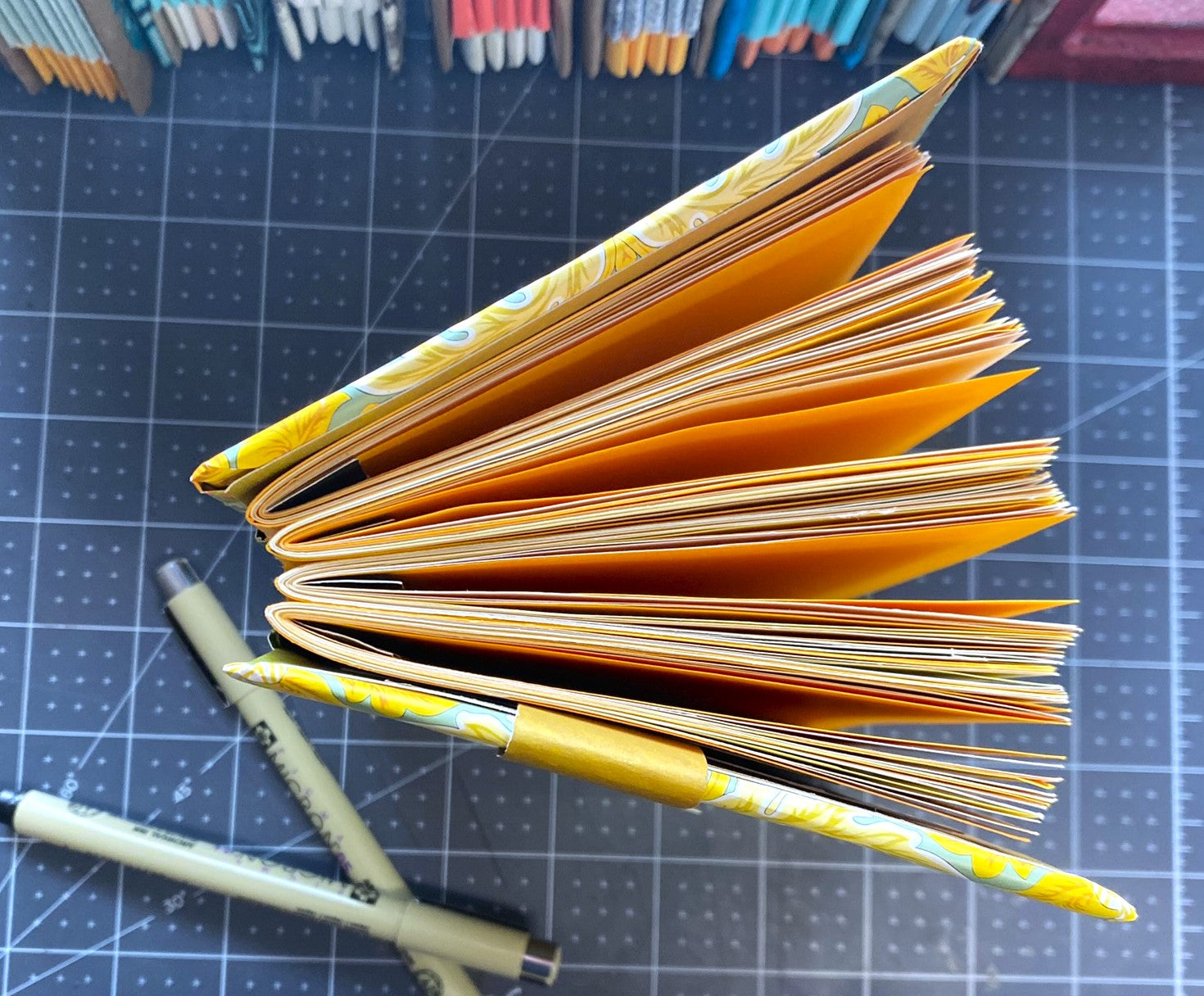 This is a super fun journal, with bright yellow and blue front and back covers, and assorted thick and thin yellow, white, and tan papers. This journal is unlined and hand bound using a static accordion method. This allows me to "lock" each signature in with a piece of paper. Technically, these pages can come out, but they are a bit tricky to reinstall.