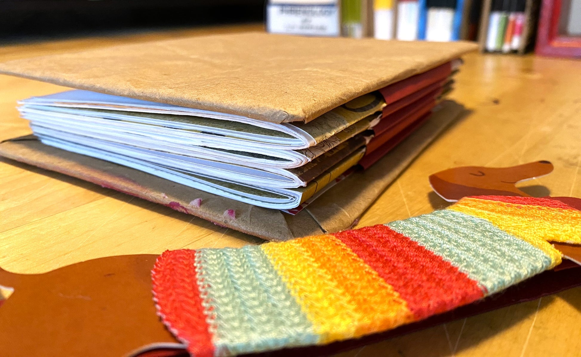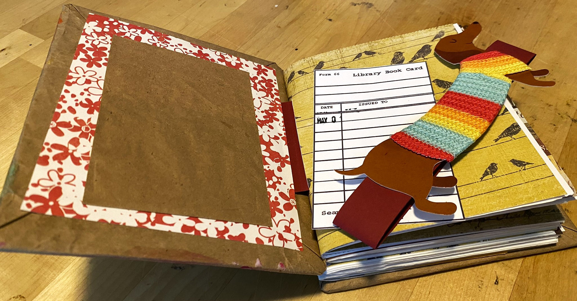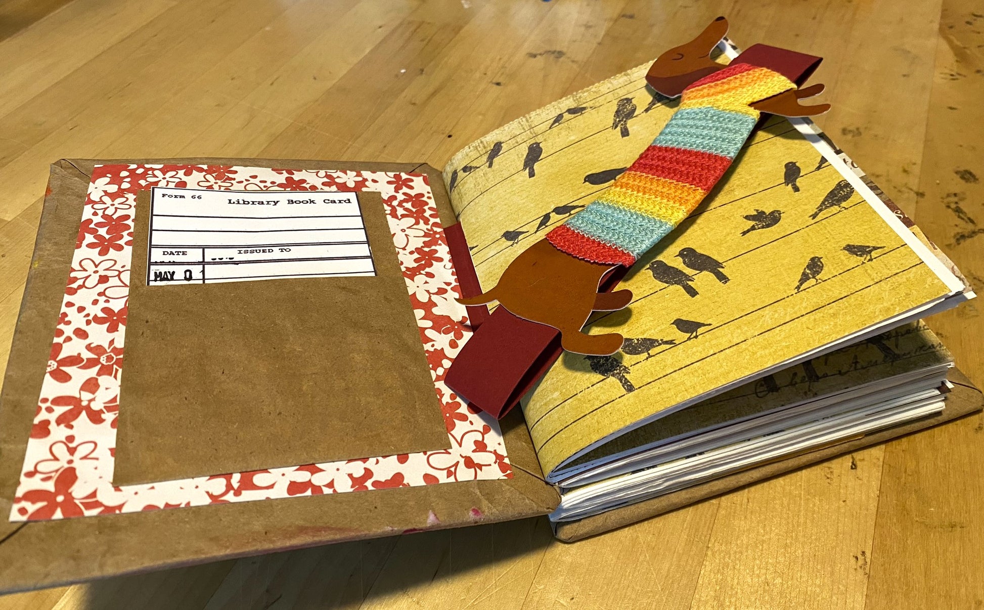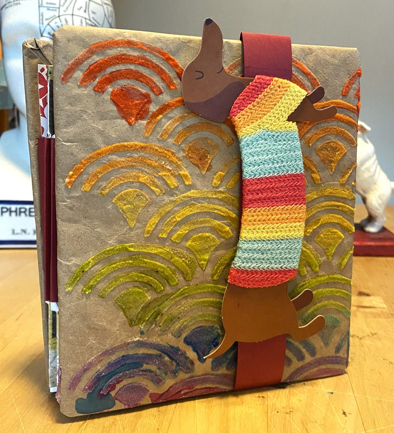 Journal also comes with a paper pocket band that can be used or removed. It can catch little bits of paper, or indicate where you are in your journal. It can also be flattened and used as a bookmark. This paper band features a carstock dachshund wearing a rainbow sweater made of threads and fabric.