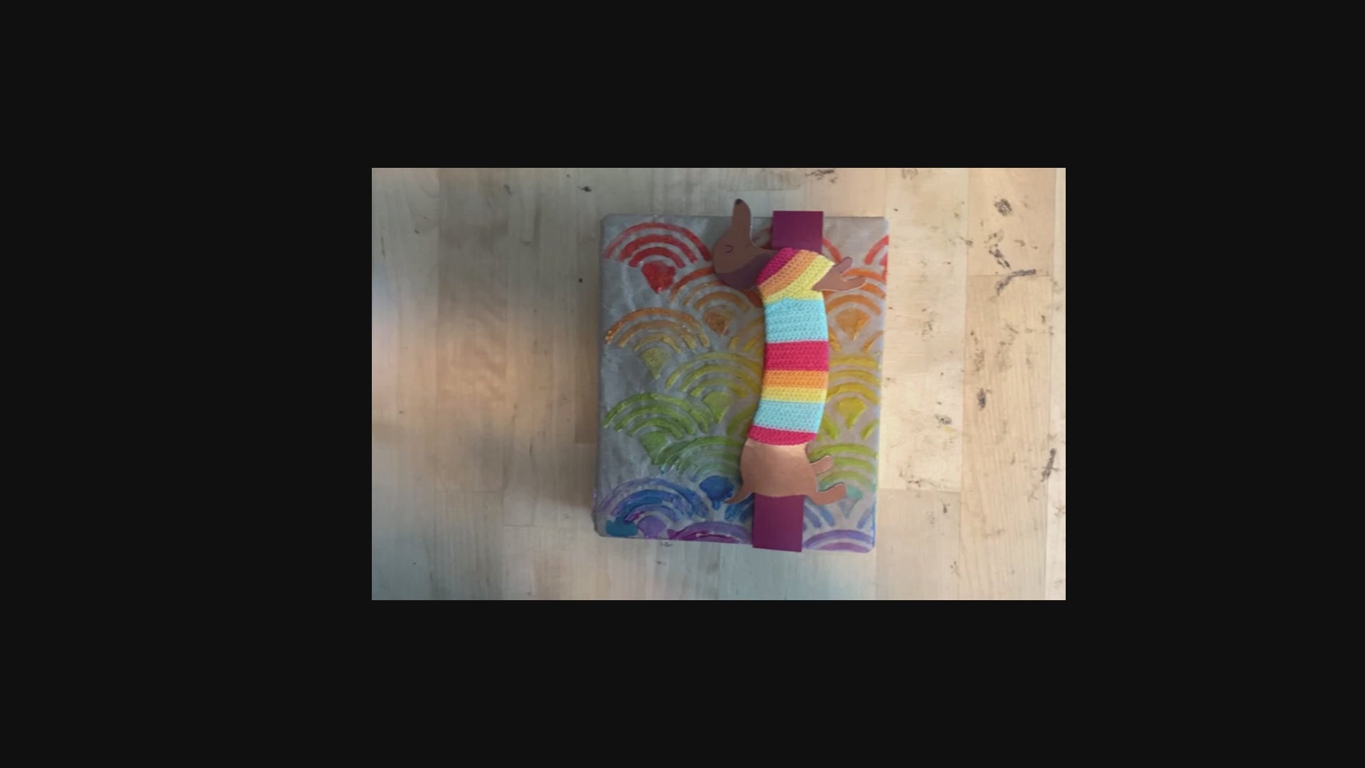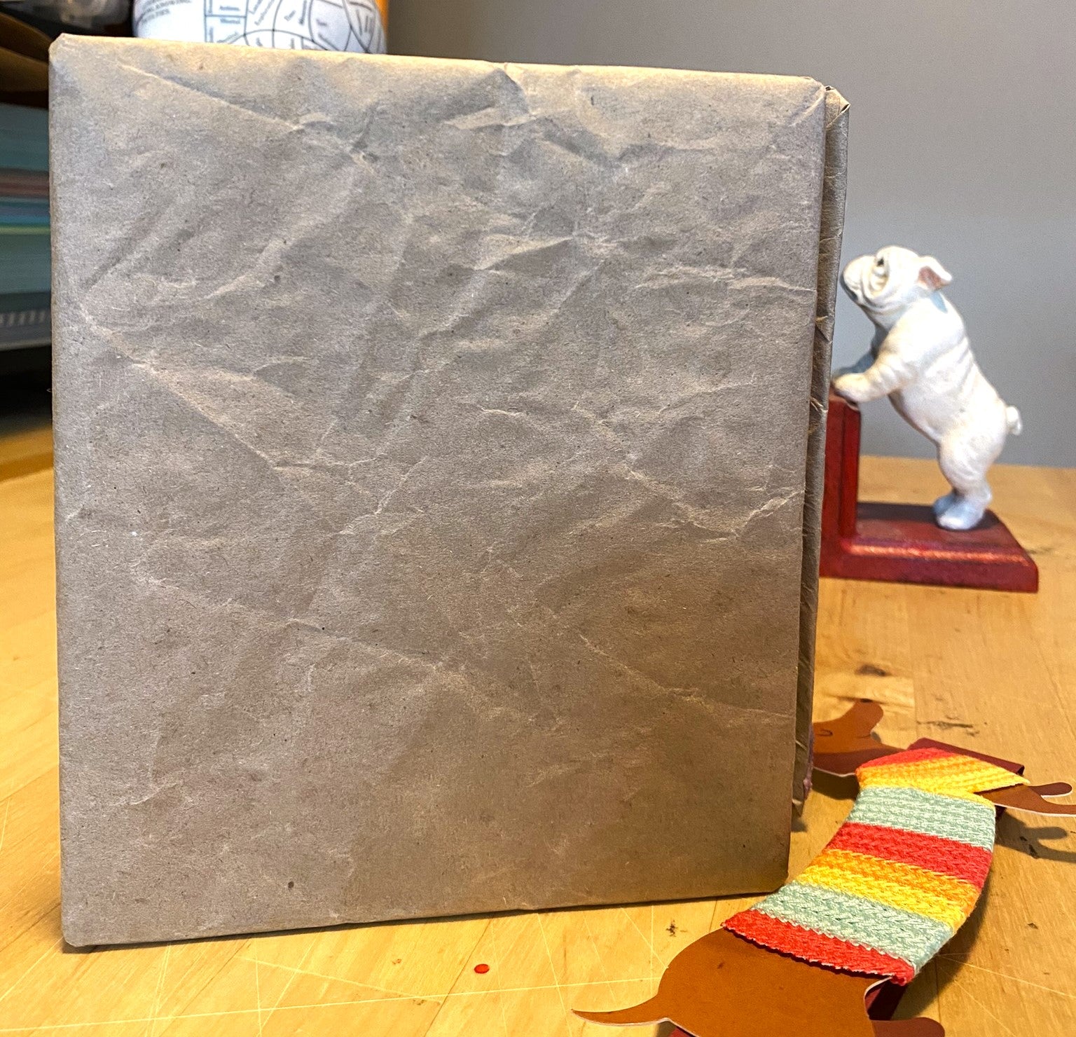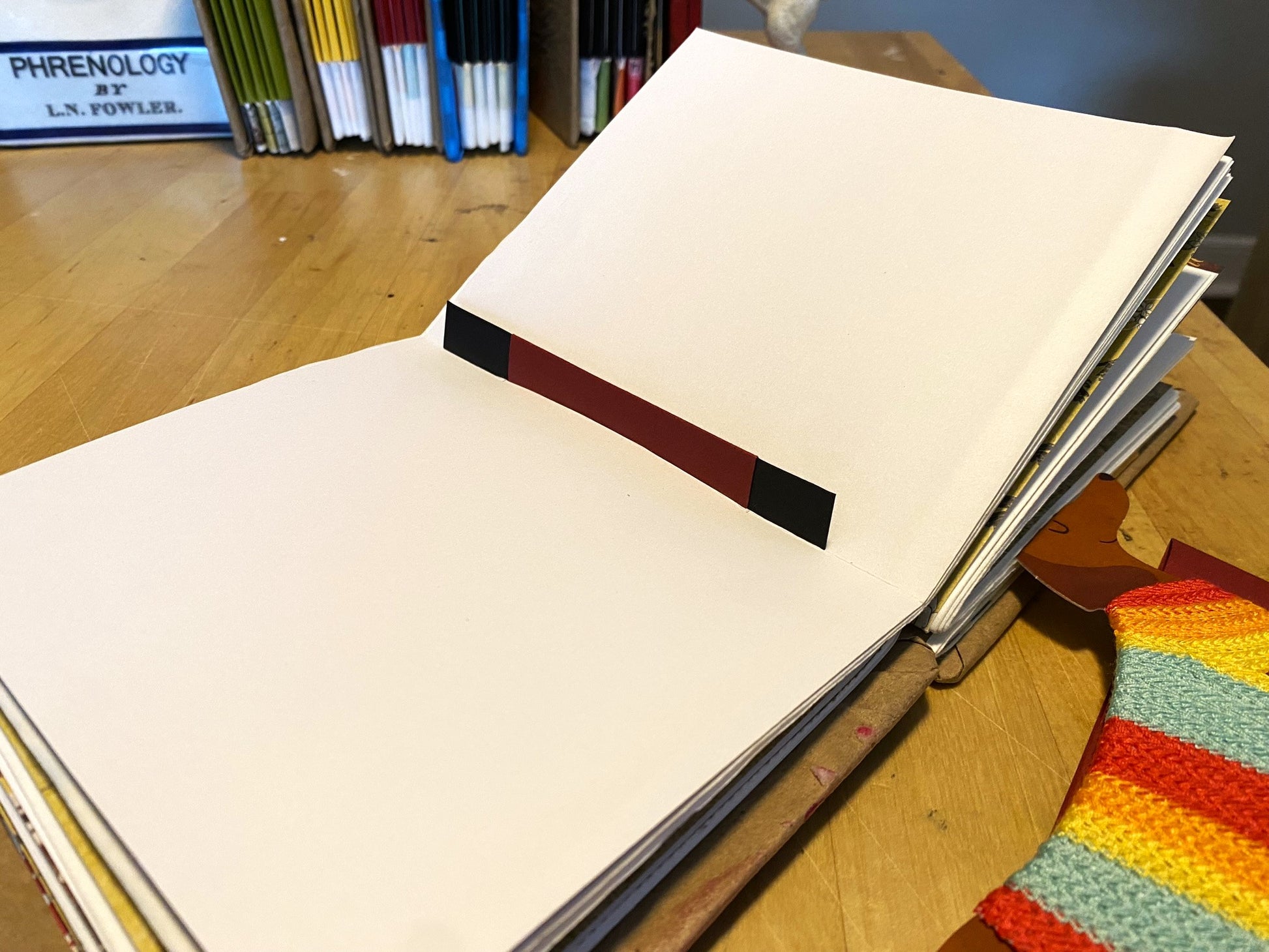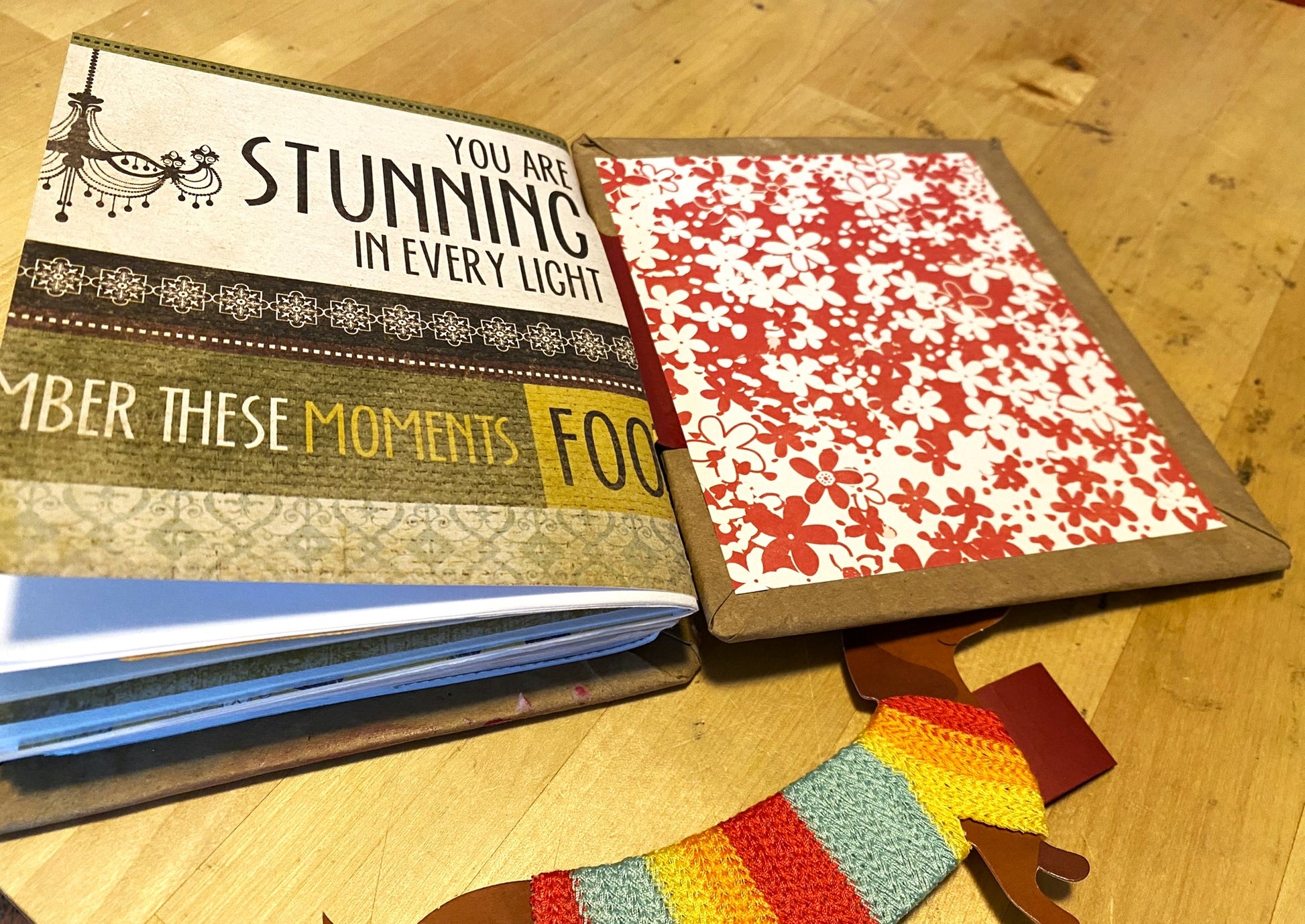 Journal also comes with a paper pocket band that can be used or removed. It can catch little bits of paper, or indicate where you are in your journal. It can also be flattened and used as a bookmark. This paper band features a carstock dachshund wearing a rainbow sweater made of threads and fabric.