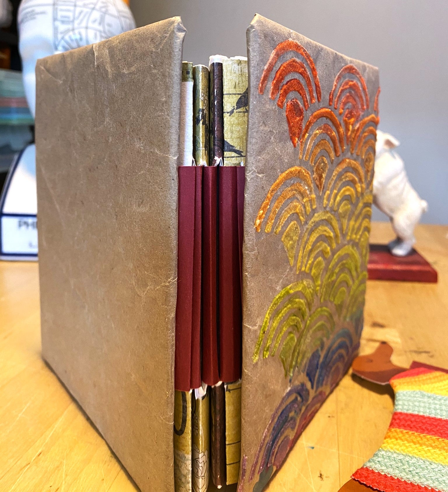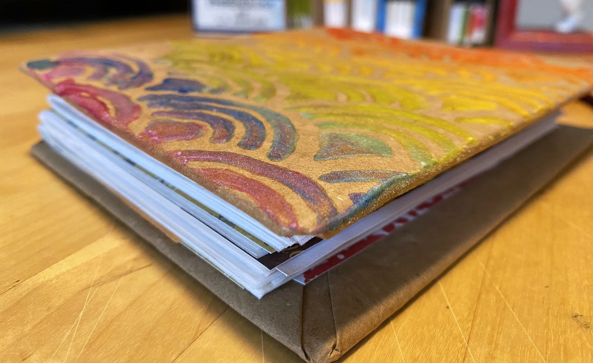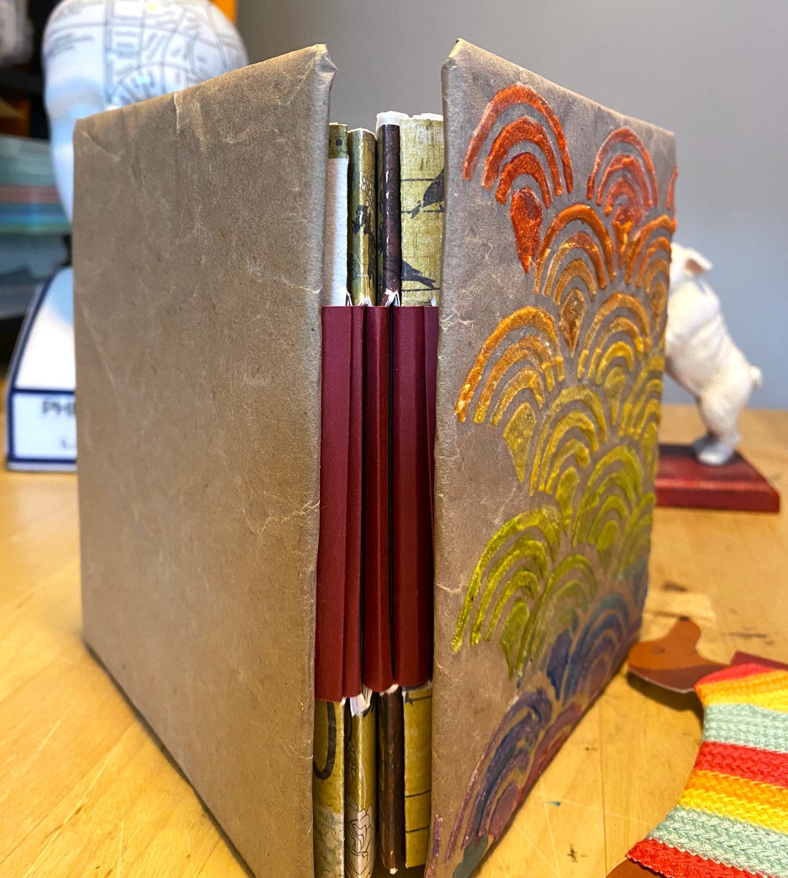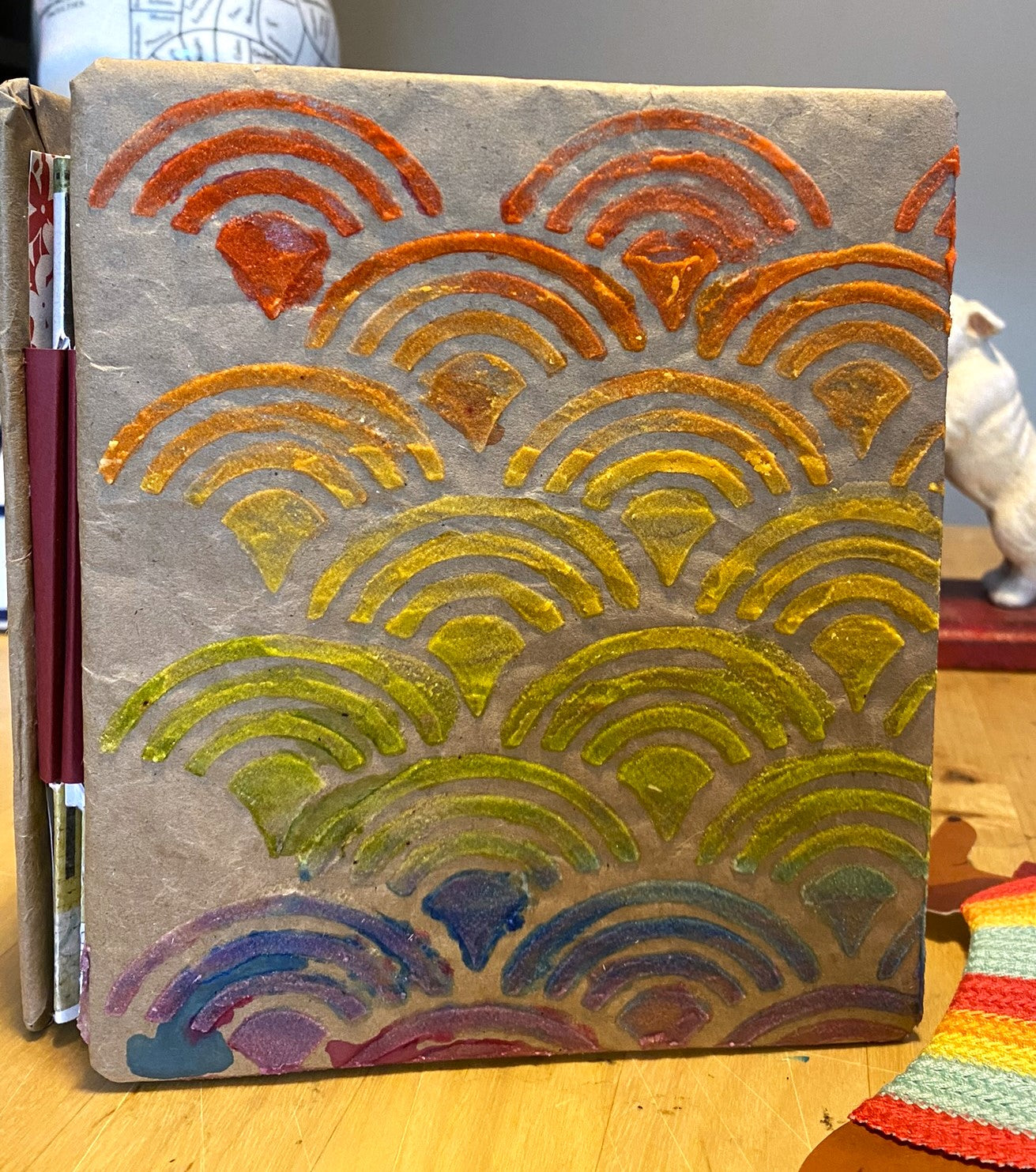 Blank Journal features a brown kraft paper front and back cover. Front cover features stenciled rainbows in colored grit paste (page has a lot of texture if that's your thing); all papers are recycled or reused, pages may have imperfections. This journal is unlined and hand bound using a static accordion method. This allows me to "lock" each signature in with a piece of paper. Technically, these pages can come out, but they are a bit tricky to reinstall.