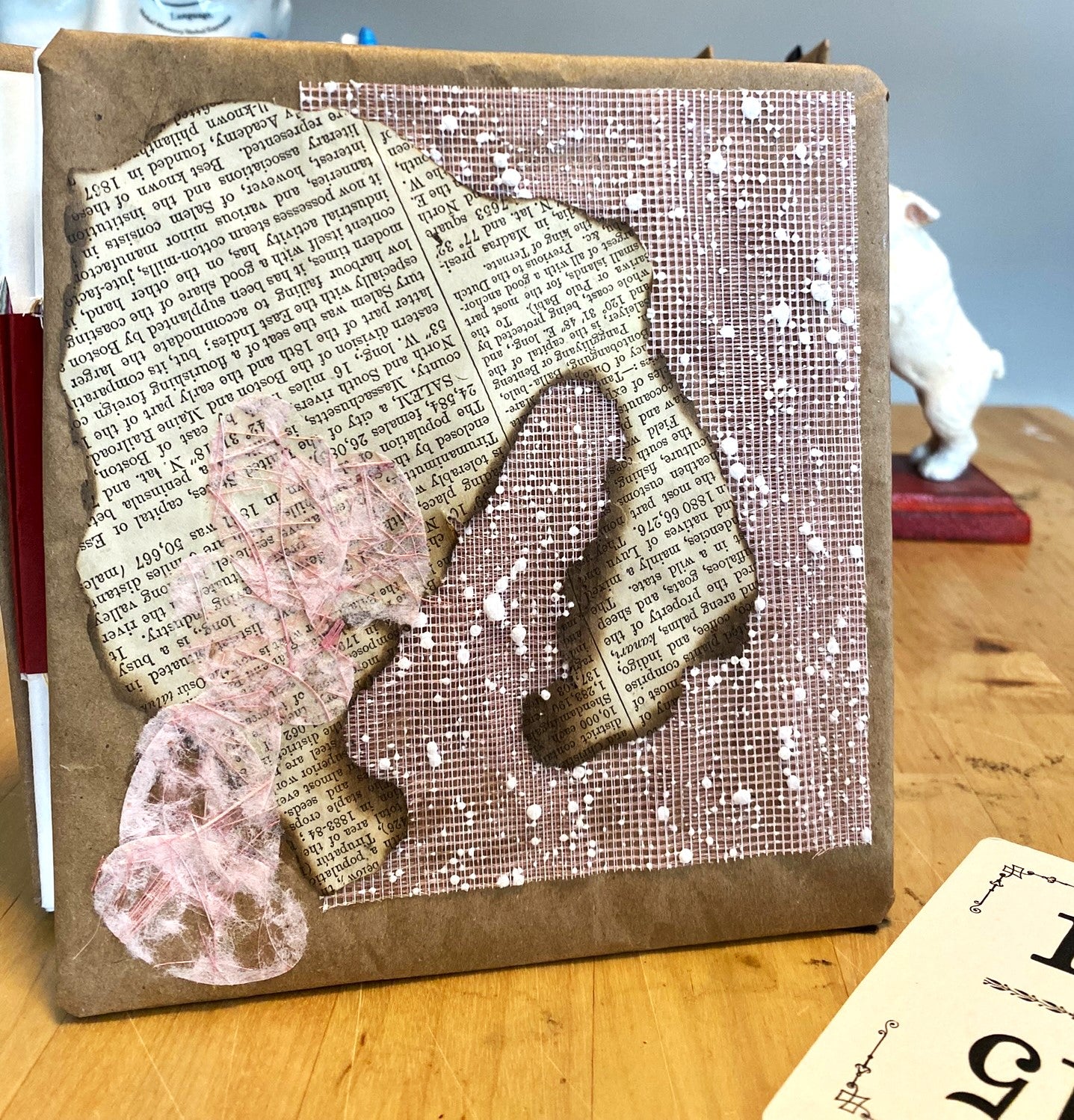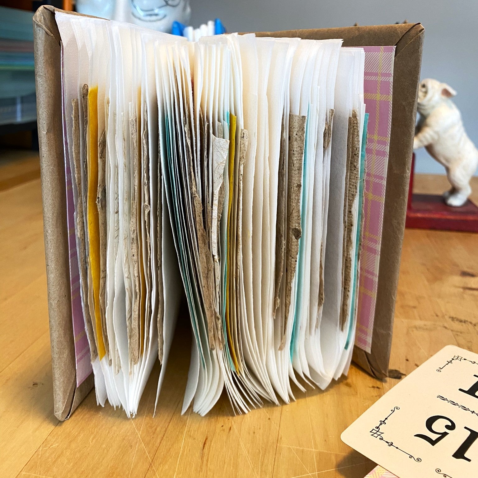 This Blank Journal is made with environmentally friendly materials, including brown kraft paper featuring encyclopedia page with burnt edge, thread and fiber handmade paper, and a threaded paper screen with dots of paste. Cover has a lot of different textures. The unlined pages are hand bound using a special accordion technique that secures each signature in place. While technically removable, it may be challenging to reinstall the pages if they are taken out.