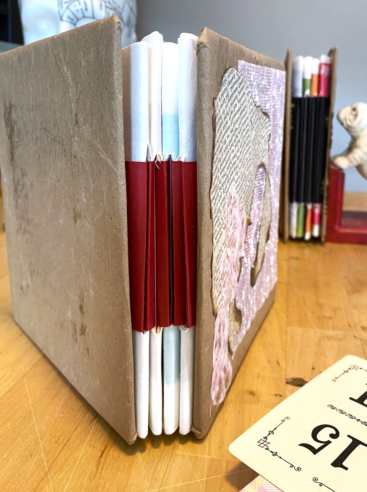 This is a great journal for someone wanting to try junk journaling, but would prefer to have a premade cover and signature set. Everything is paper, there are no threads. The spine has no glue. It would be a great blank book to start with. This is a unique journal, there are no others like it.