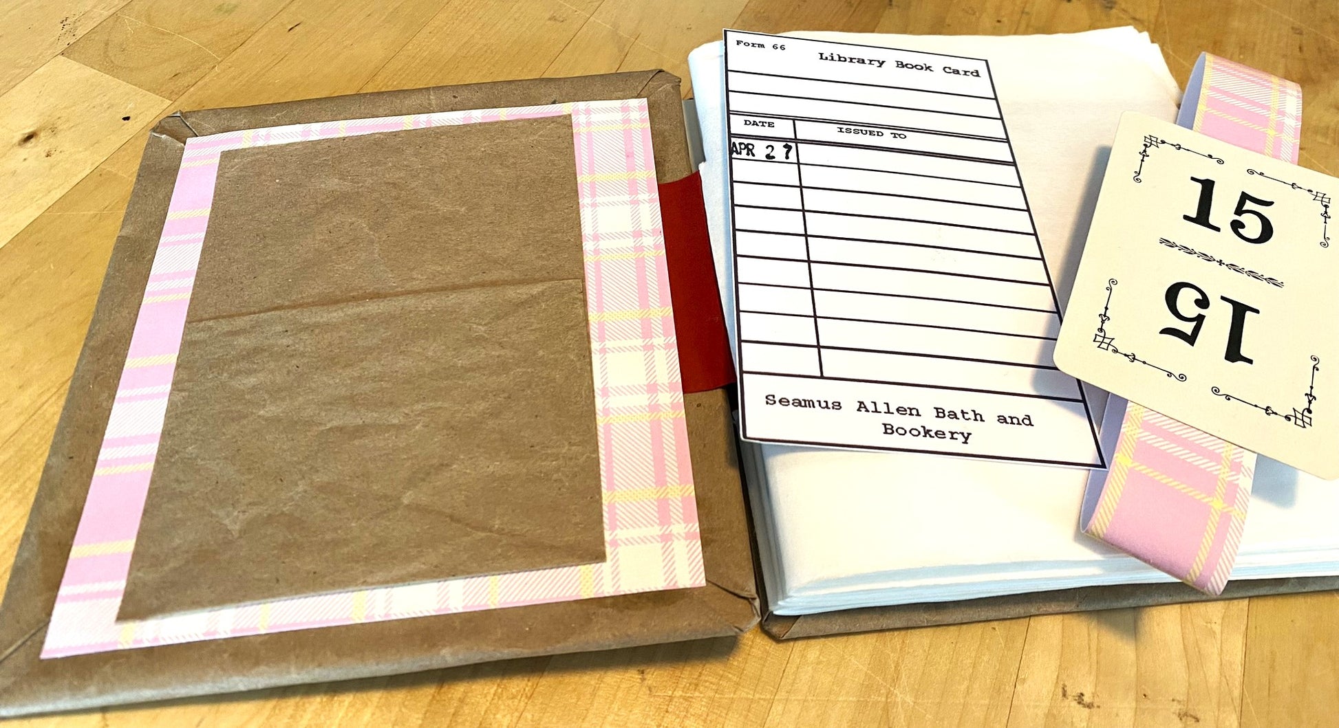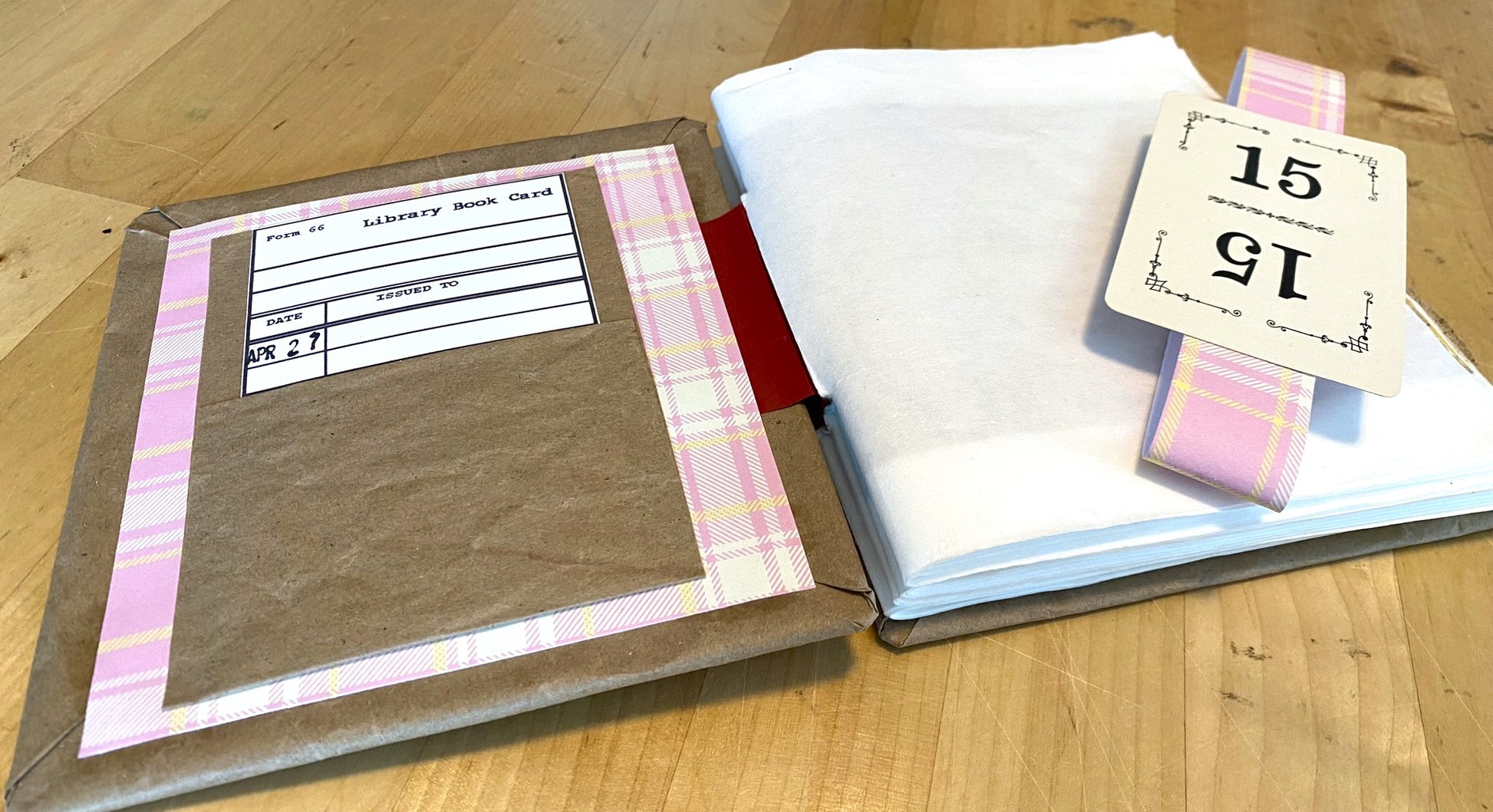 Inside of front cover features a library card, stamped with the date the book was completed. This card can be removed and/or used as a bookmark.
