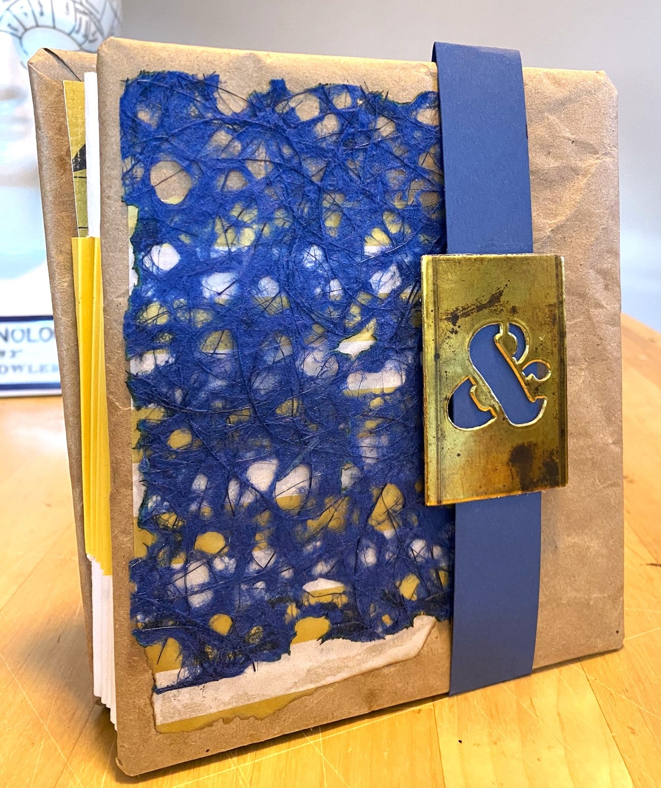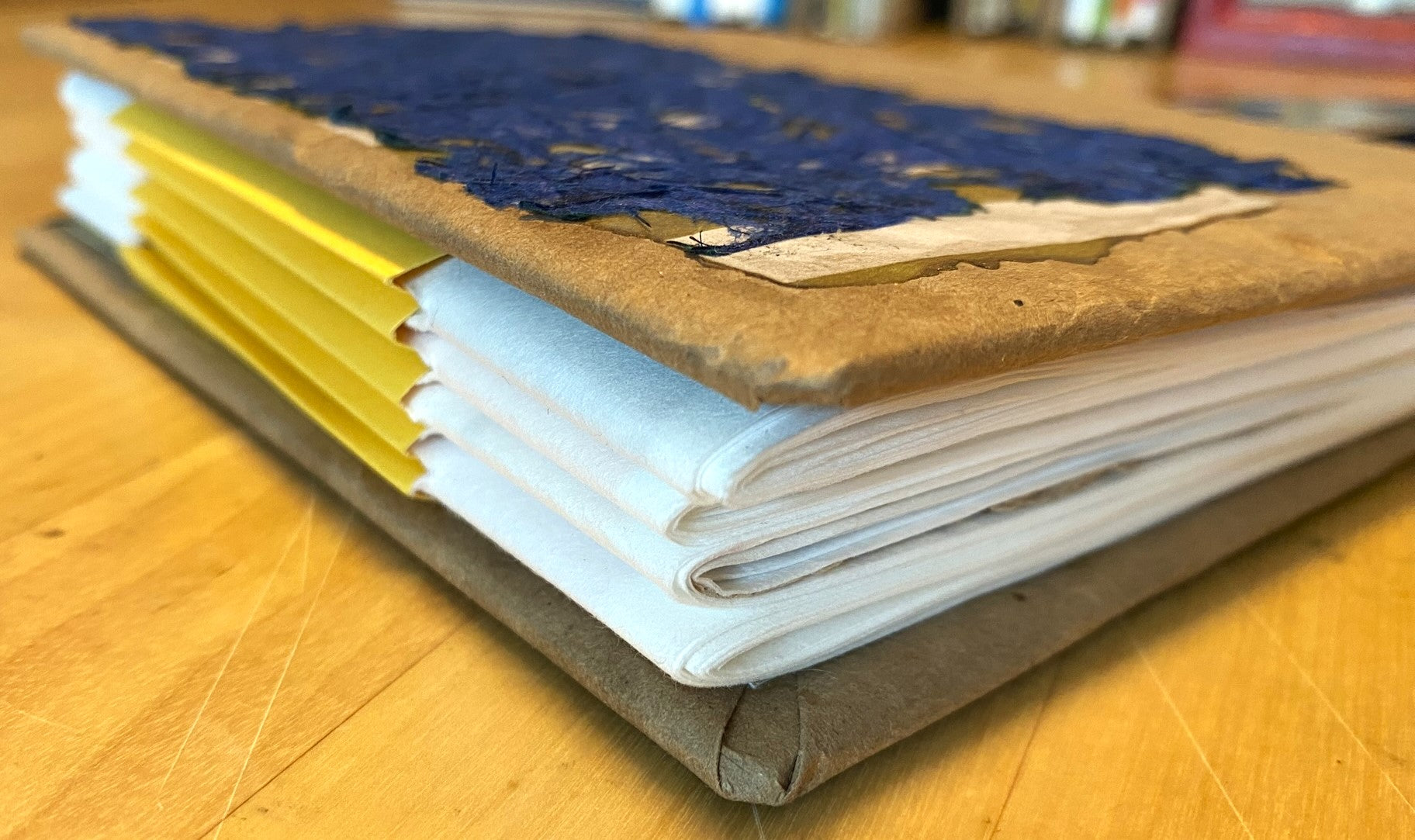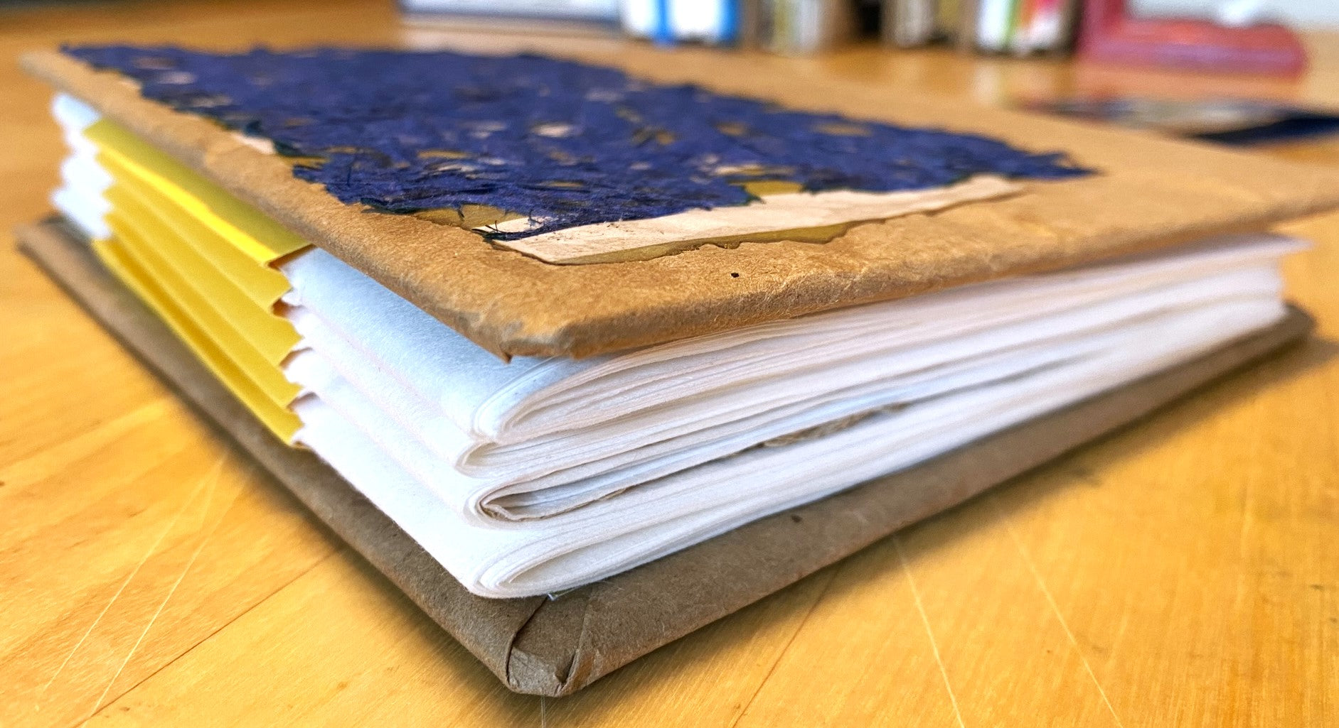 This Blank Journal is made with environmentally friendly materials, including brown kraft paper and gold and white striped burnt wax paper, as well as a unique thread and fiber paper for added texture. The unlined pages are hand bound using a special accordion technique that secures each signature in place. While technically removable, it may be challenging to reinstall the pages if they are taken out.