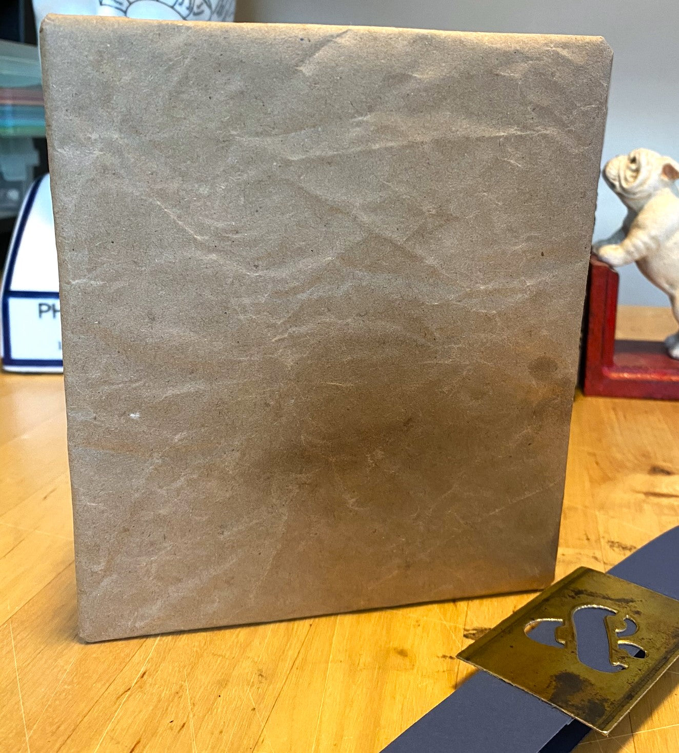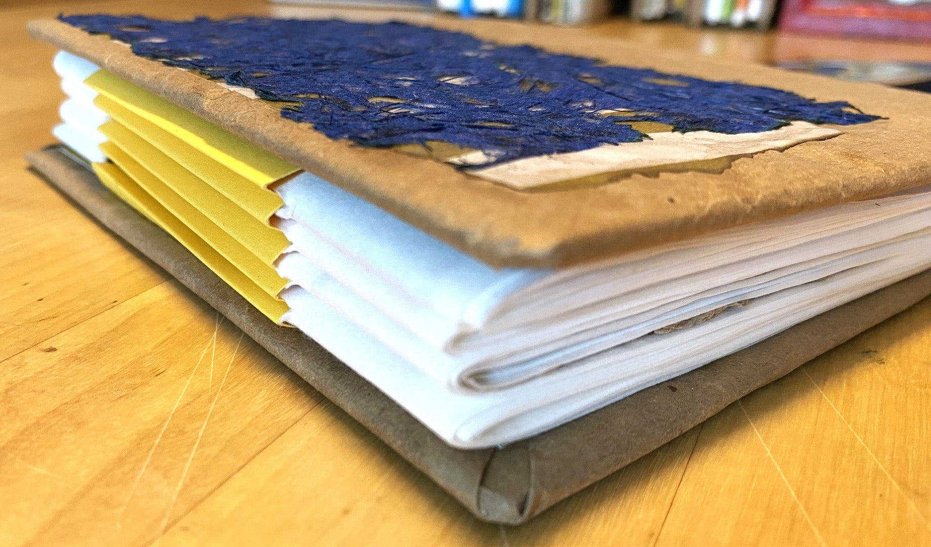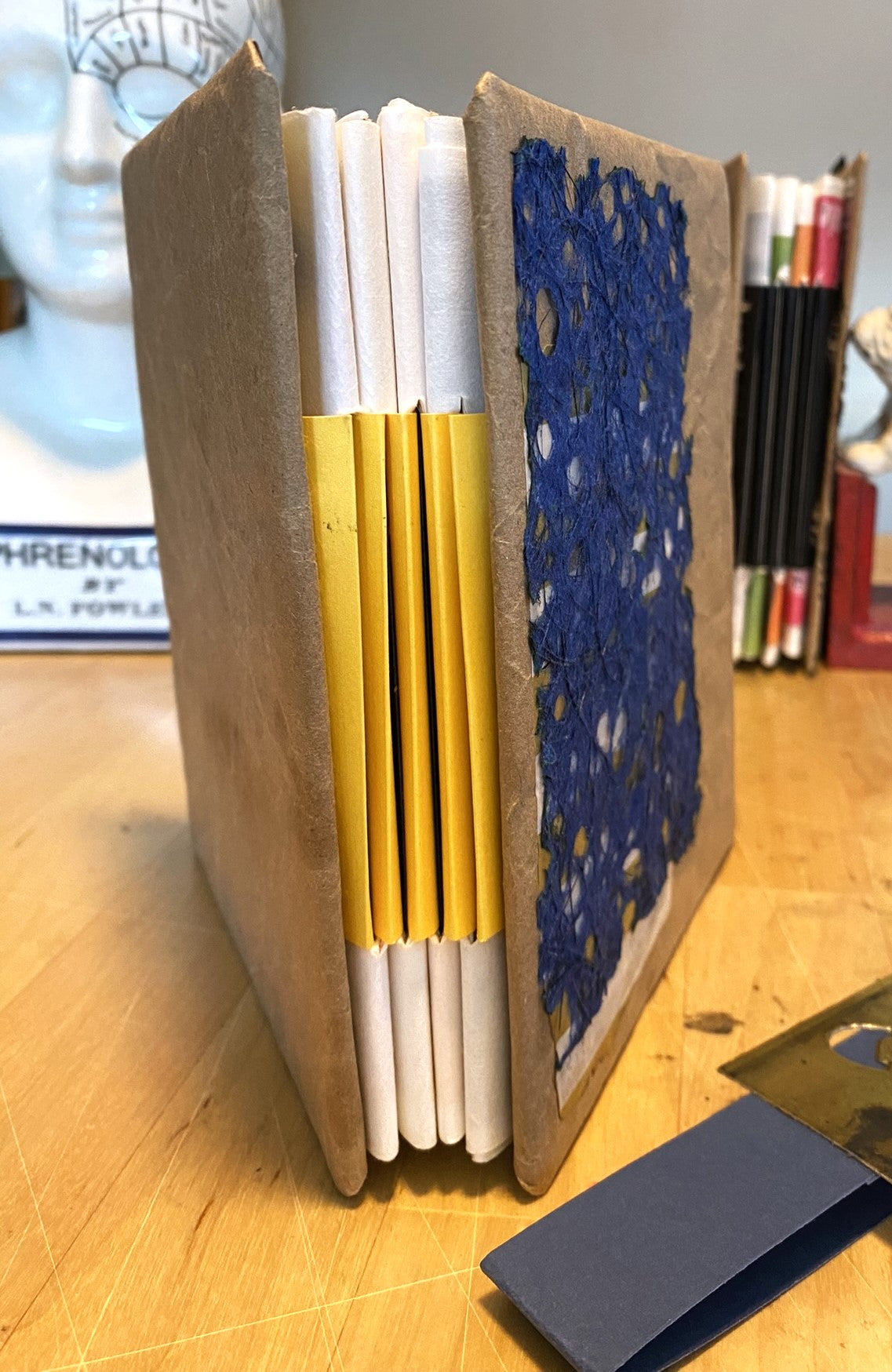 This Blank Journal is made with environmentally friendly materials, including brown kraft paper and gold and white striped burnt wax paper, as well as a unique thread and fiber paper for added texture. The unlined pages are hand bound using a special accordion technique that secures each signature in place. While technically removable, it may be challenging to reinstall the pages if they are taken out.