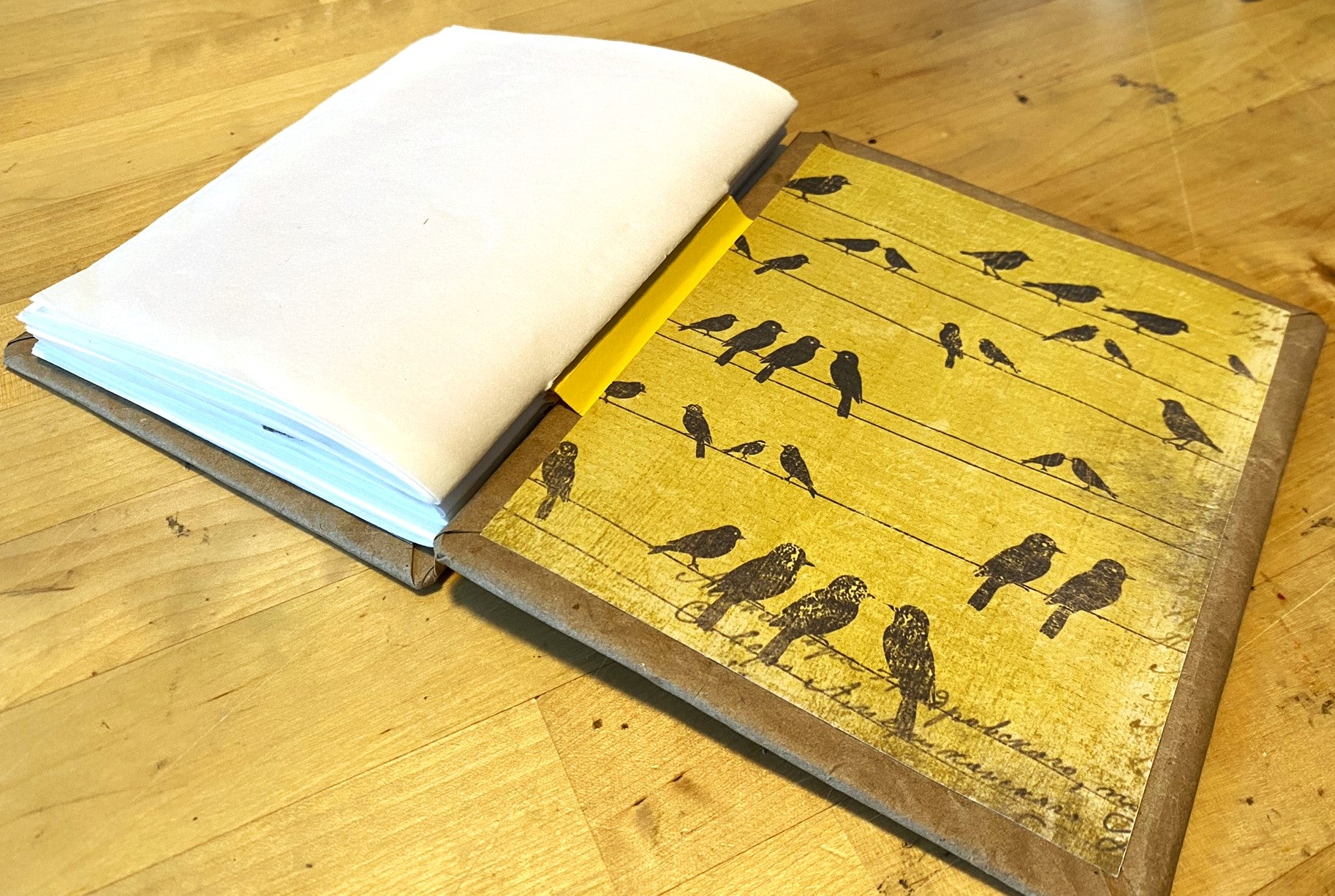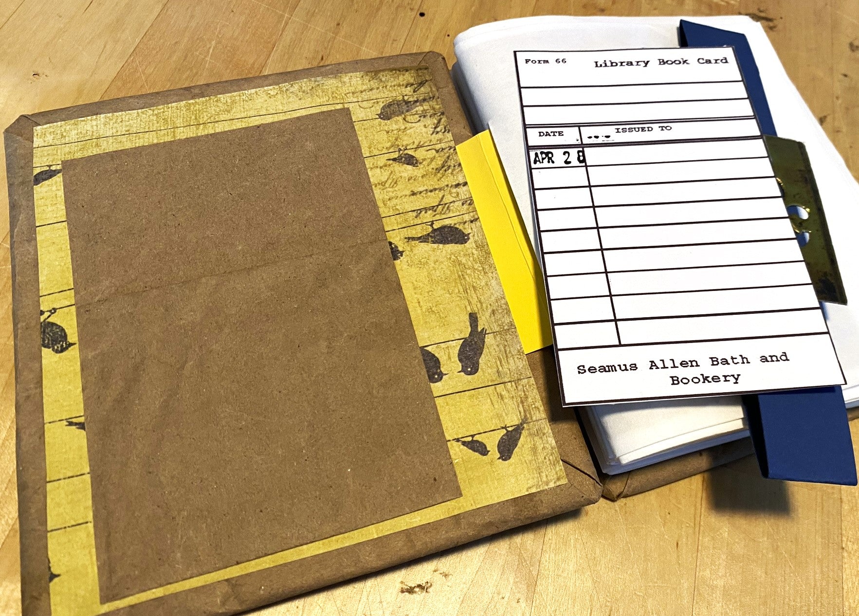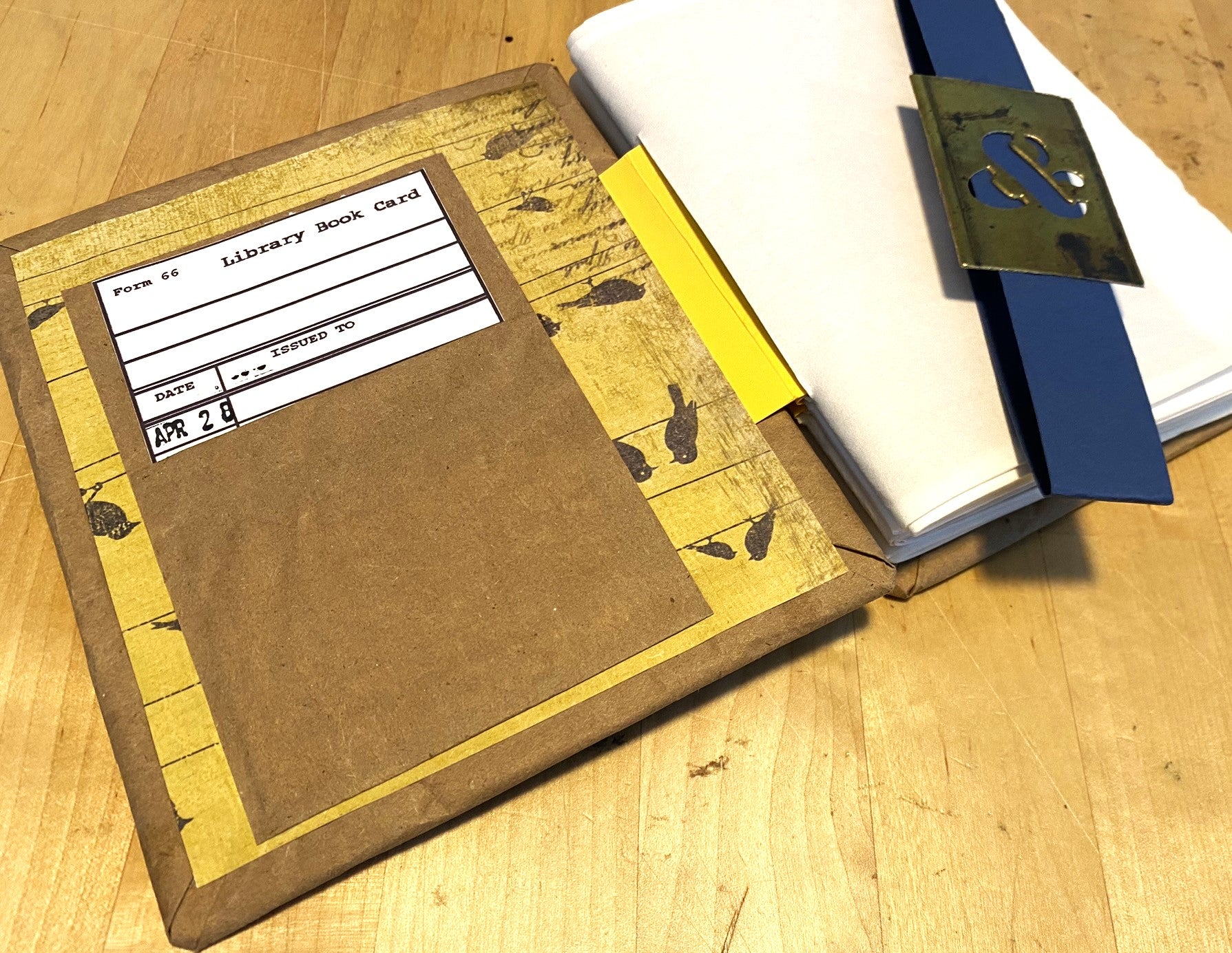 Inside of front cover features a library card, stamped with the date the book was completed. This card can be removed and/or used as a bookmark.