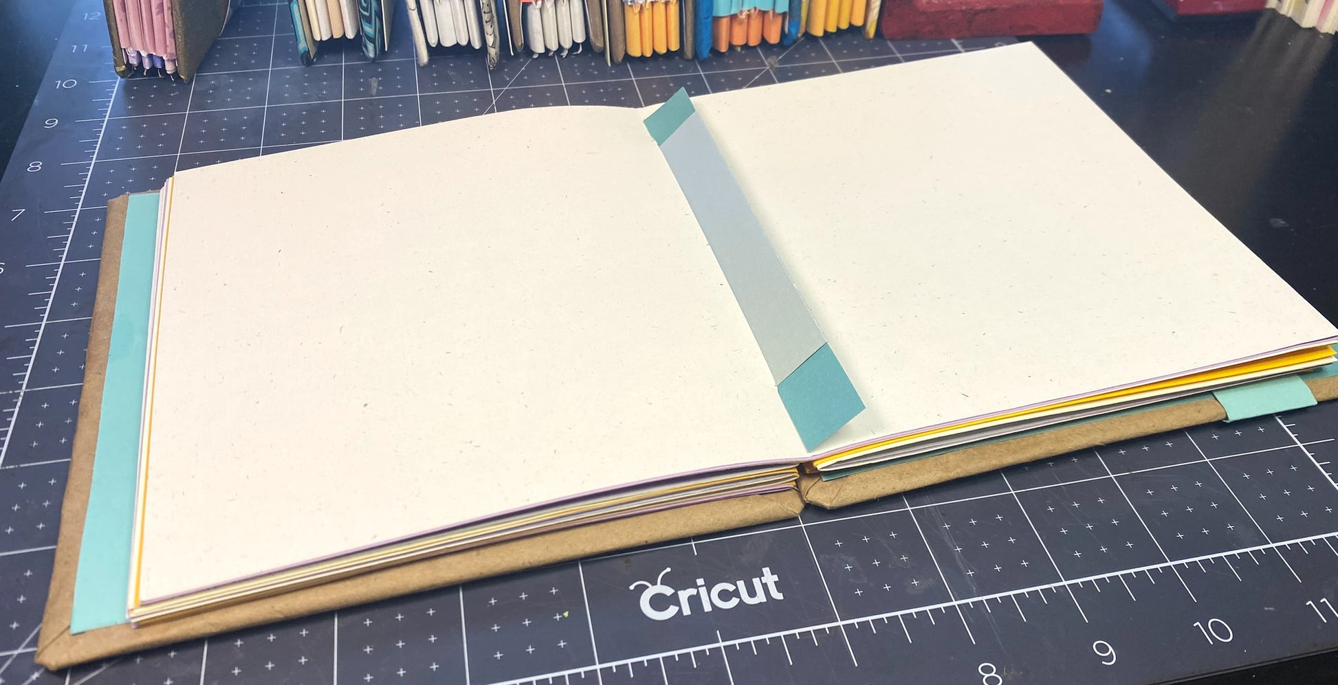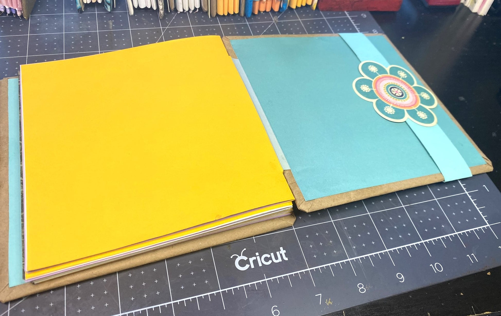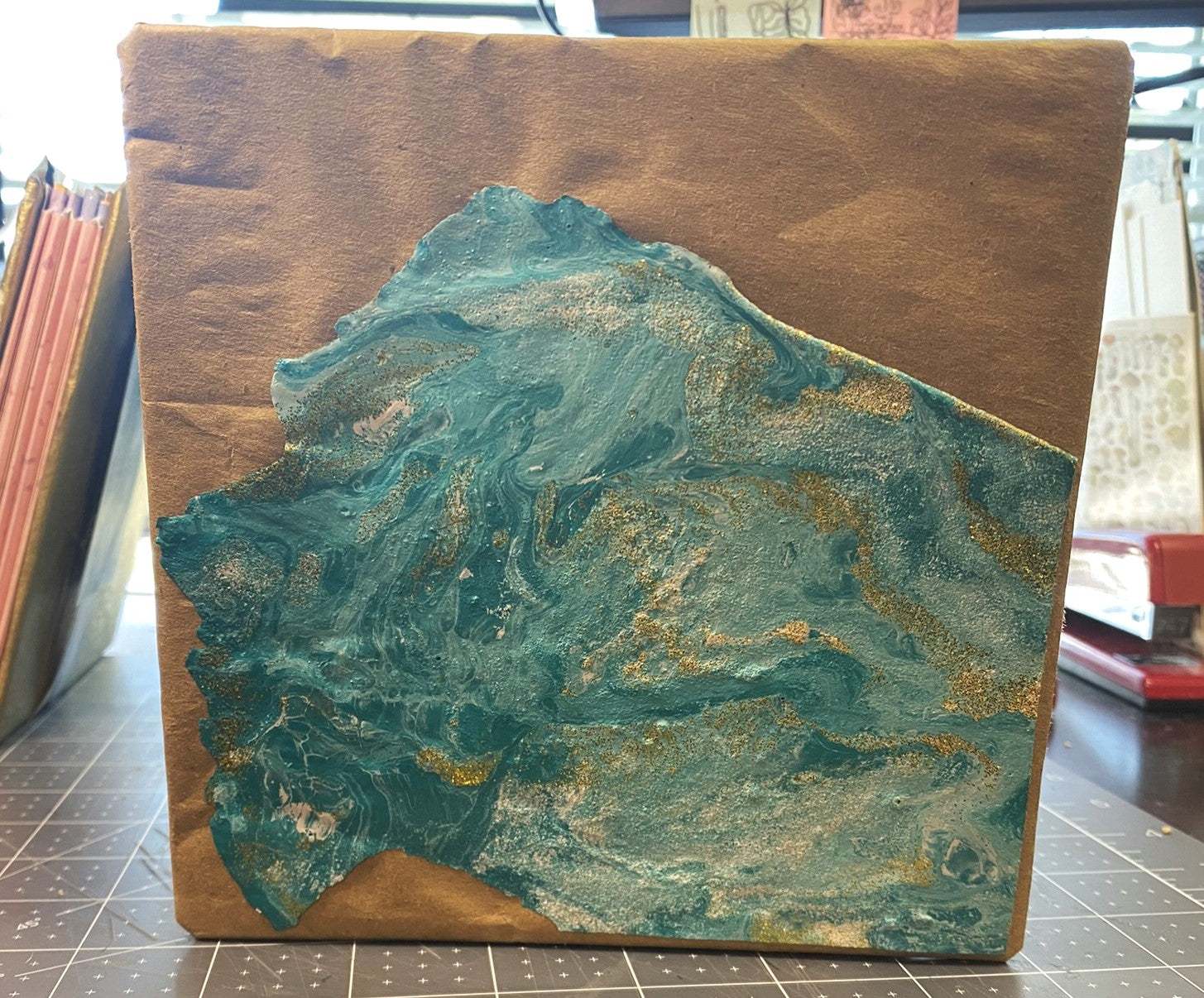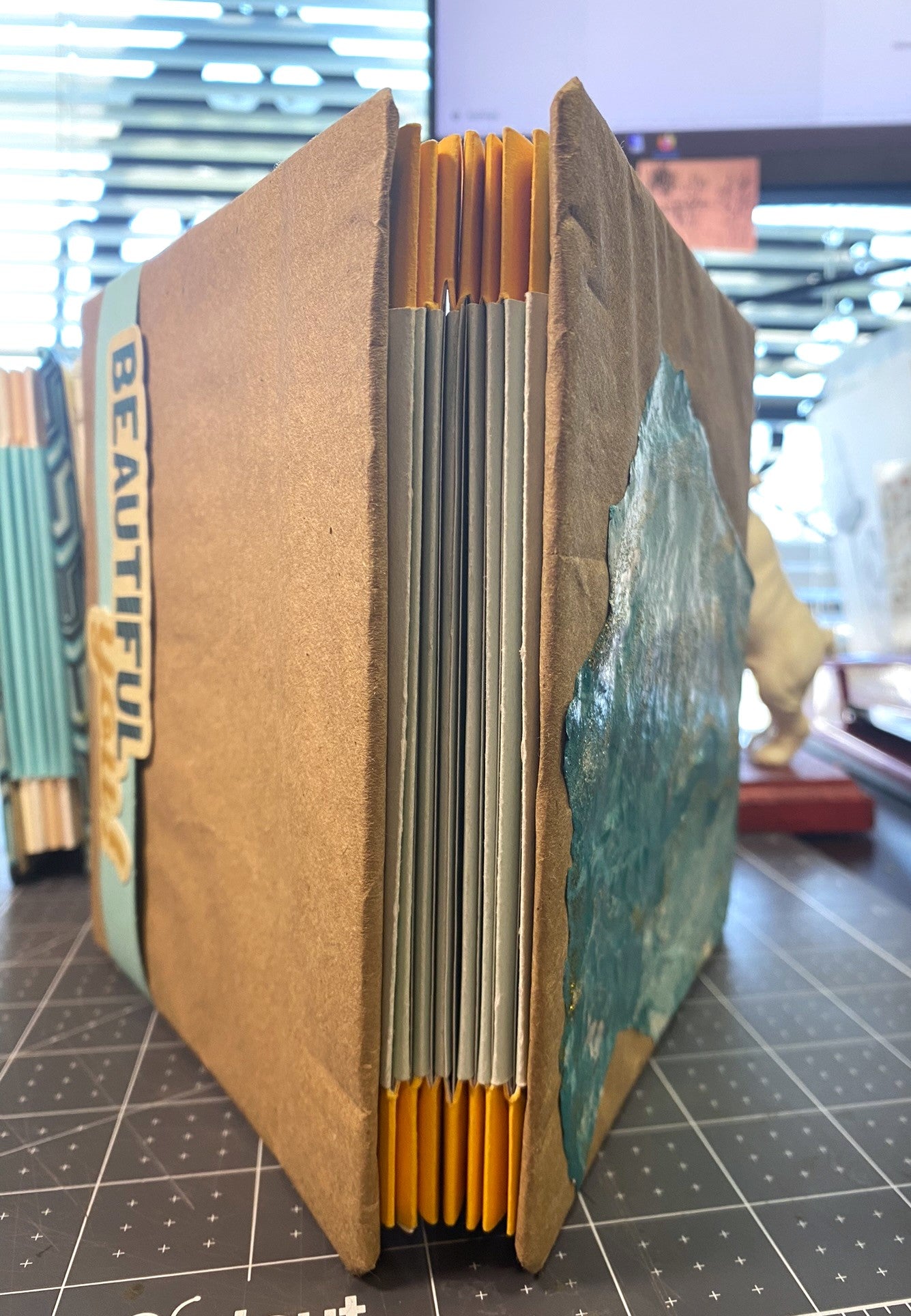 Square journal features textured acrylic paint glued to front color, paint in teal, white, and glitter. Thin kraft paper covers with paper pocket band on back cover. This journal is unlined and hand bound using a static accordion method. This allows me to "lock" each signature in with a piece of paper. Technically, these pages can come out, but they are a bit tricky to reinstall.