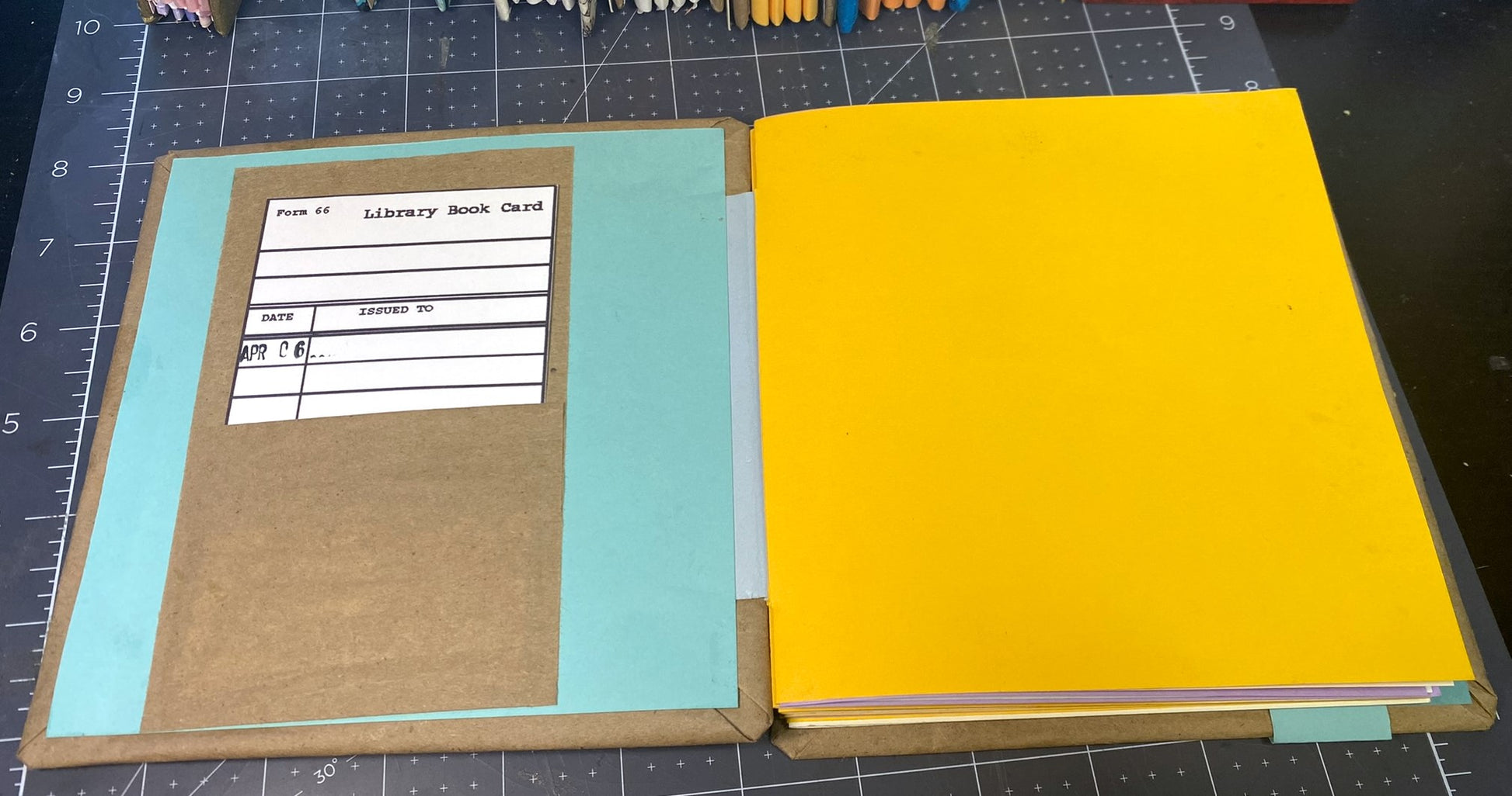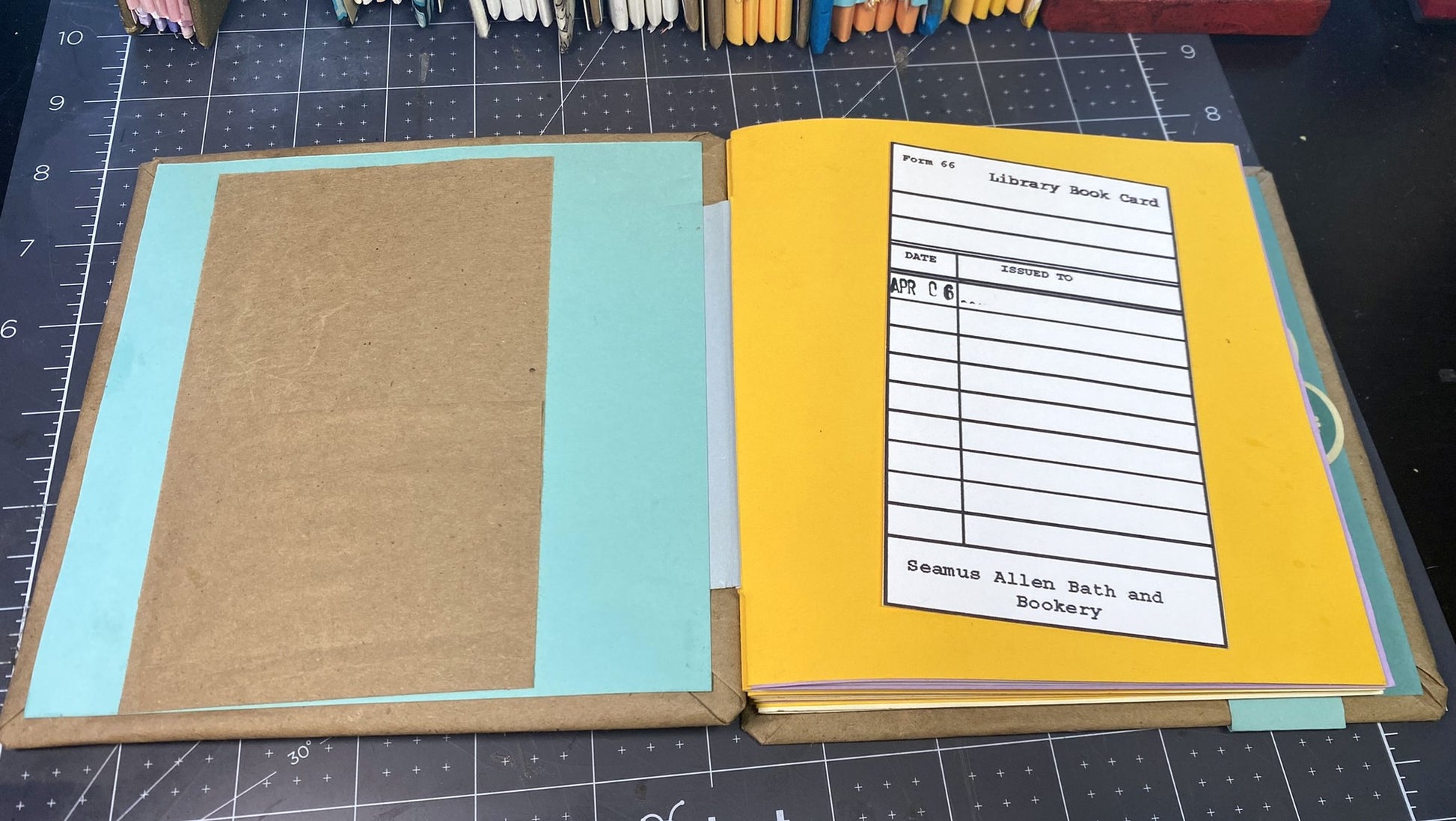 Inside of front cover features a library card, stamped with the date the book was completed. This card can be removed and/or used as a bookmark.