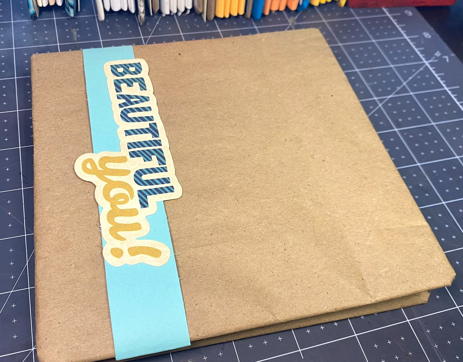 Journal also comes with a paper pocket band that can be used or removed. It can catch little bits of paper, or indicate where you are in your journal. It can also be flattened and used as a bookmark. One side says "Beautiful you!", the other features a boho type flower.