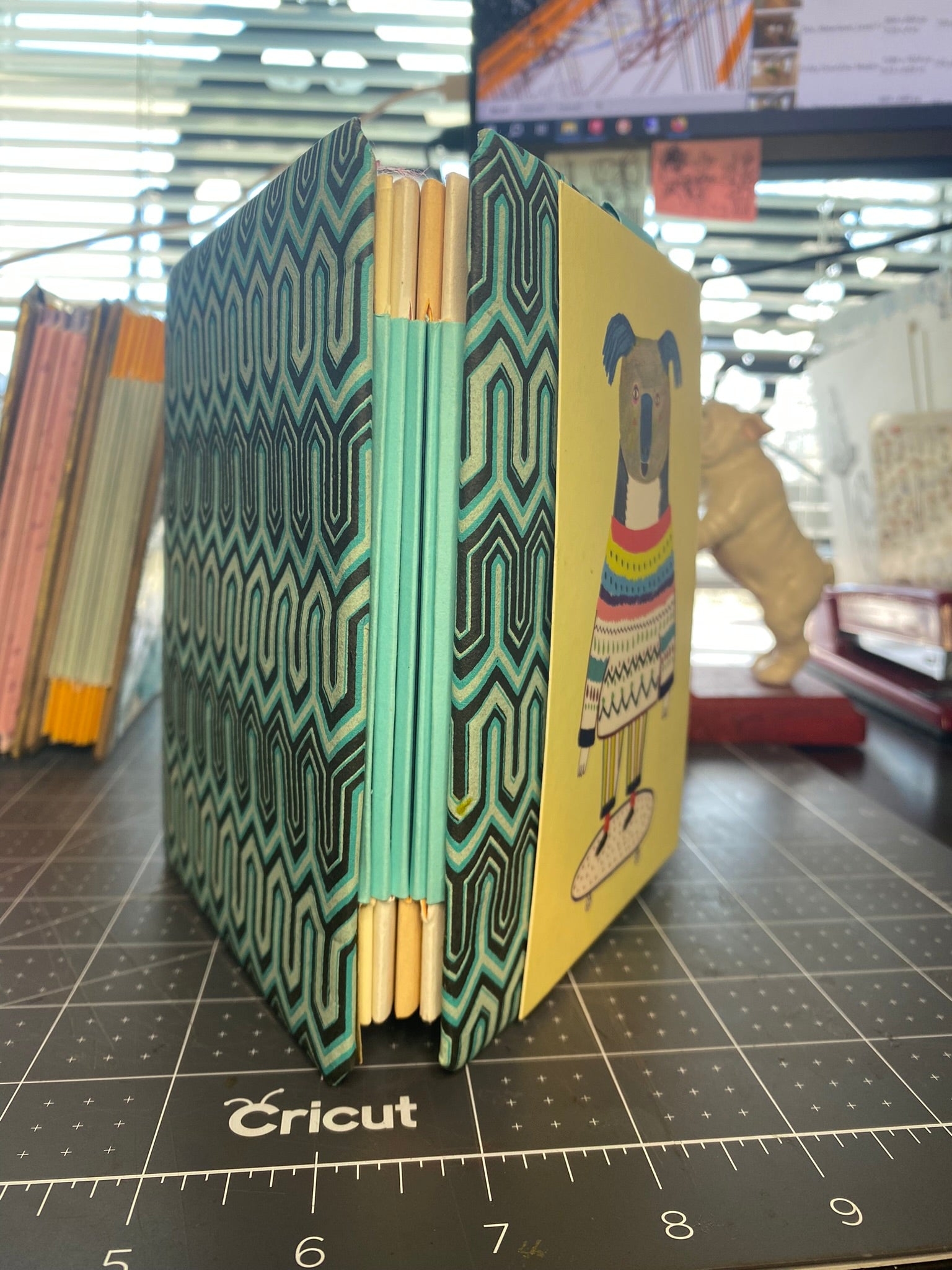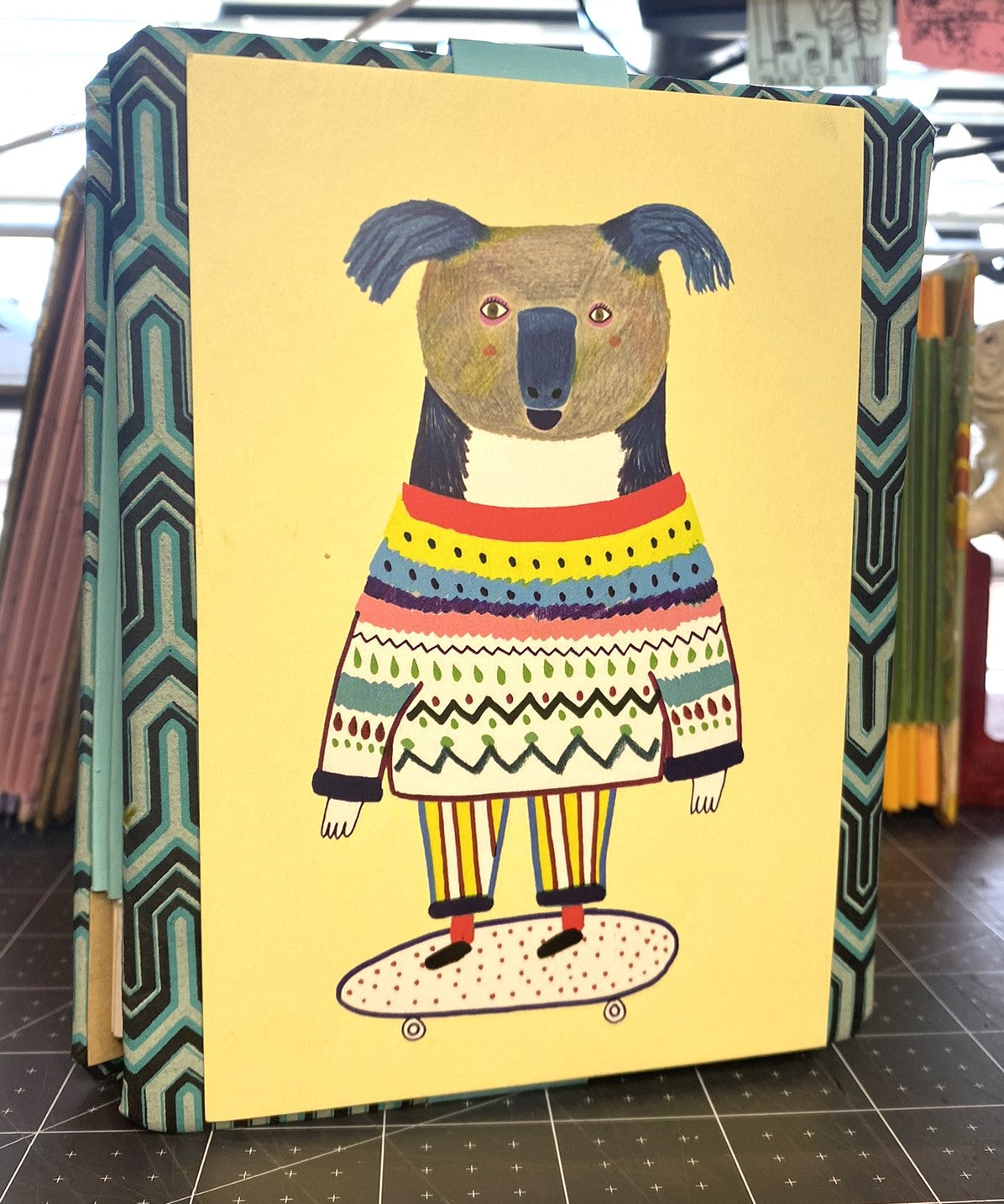 Journal also comes with a paper pocket band that can be used or removed. It can catch little bits of paper, or indicate where you are in your journal. It can also be flattened and used as a bookmark. This paper band features a skating koala postcard from iKea.
