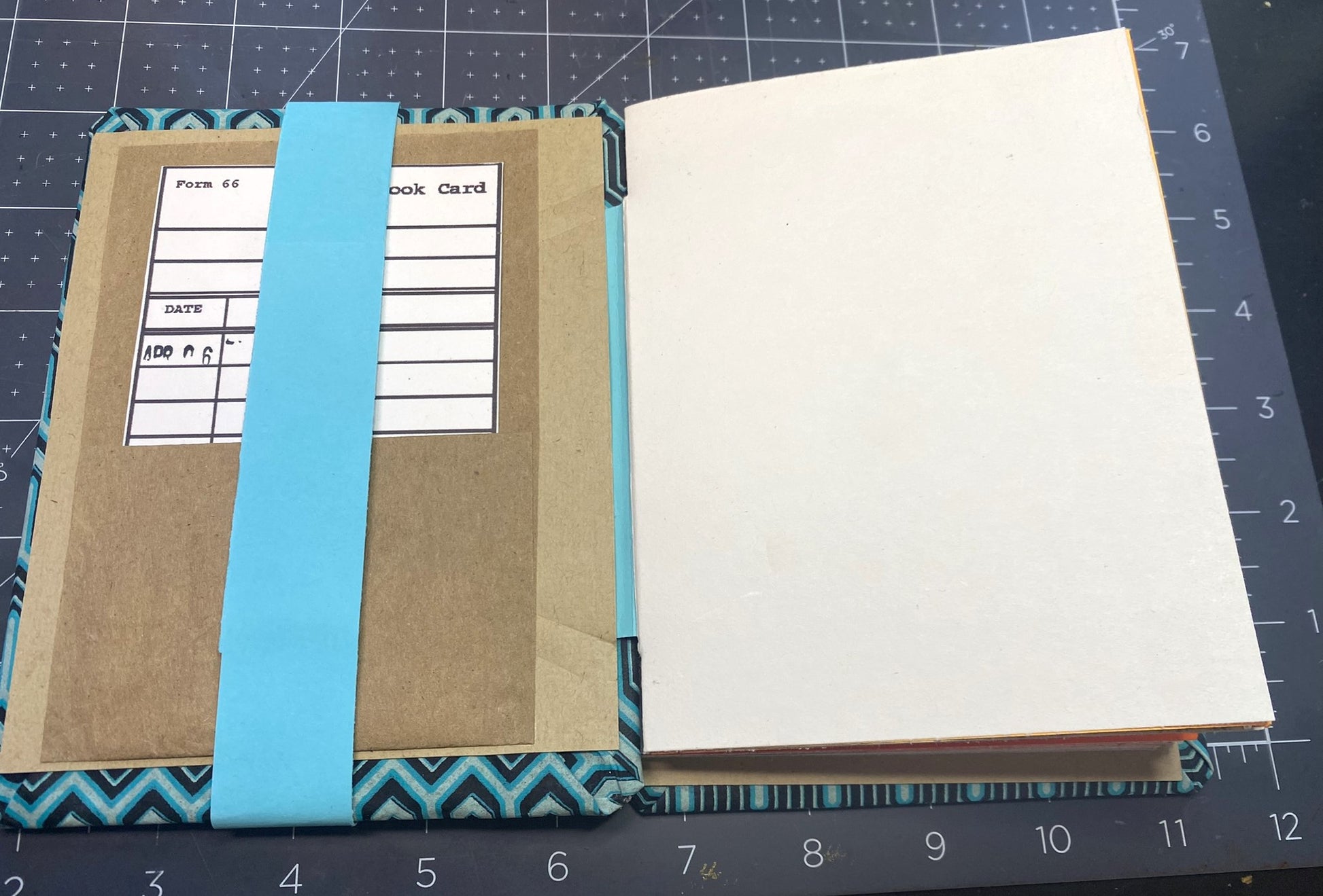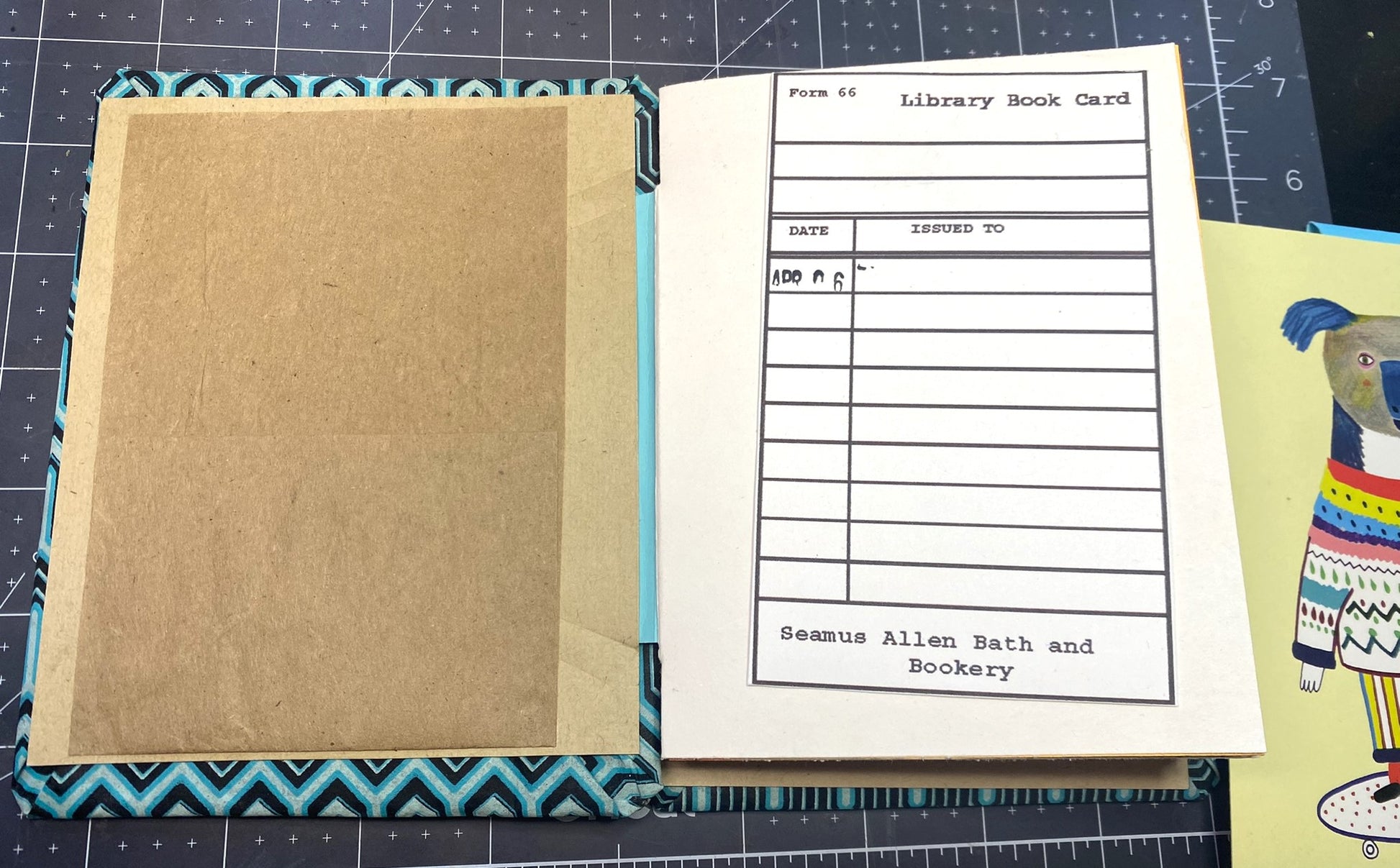 Inside of front cover features a library card, stamped with the date the book was completed. This card can be removed and/or used as a bookmark.