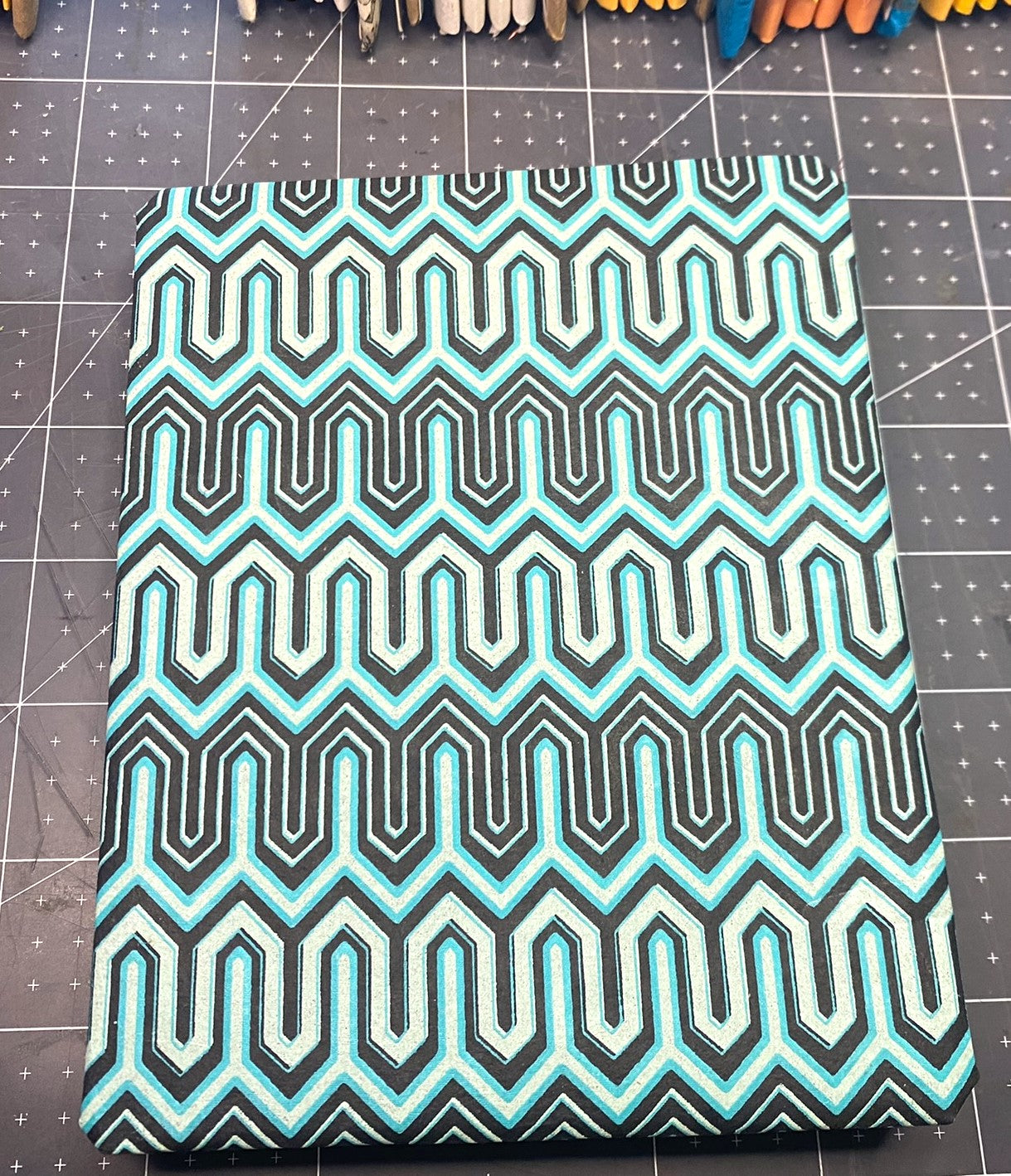 Blank Journal features a slightly textured paper in light blue, blue, and navy on the front and back covers. Front cover paper pocket band. This journal is unlined and hand bound using a static accordion method. This allows me to "lock" each signature in with a piece of paper. Technically, these pages can come out, but they are a bit tricky to reinstall.