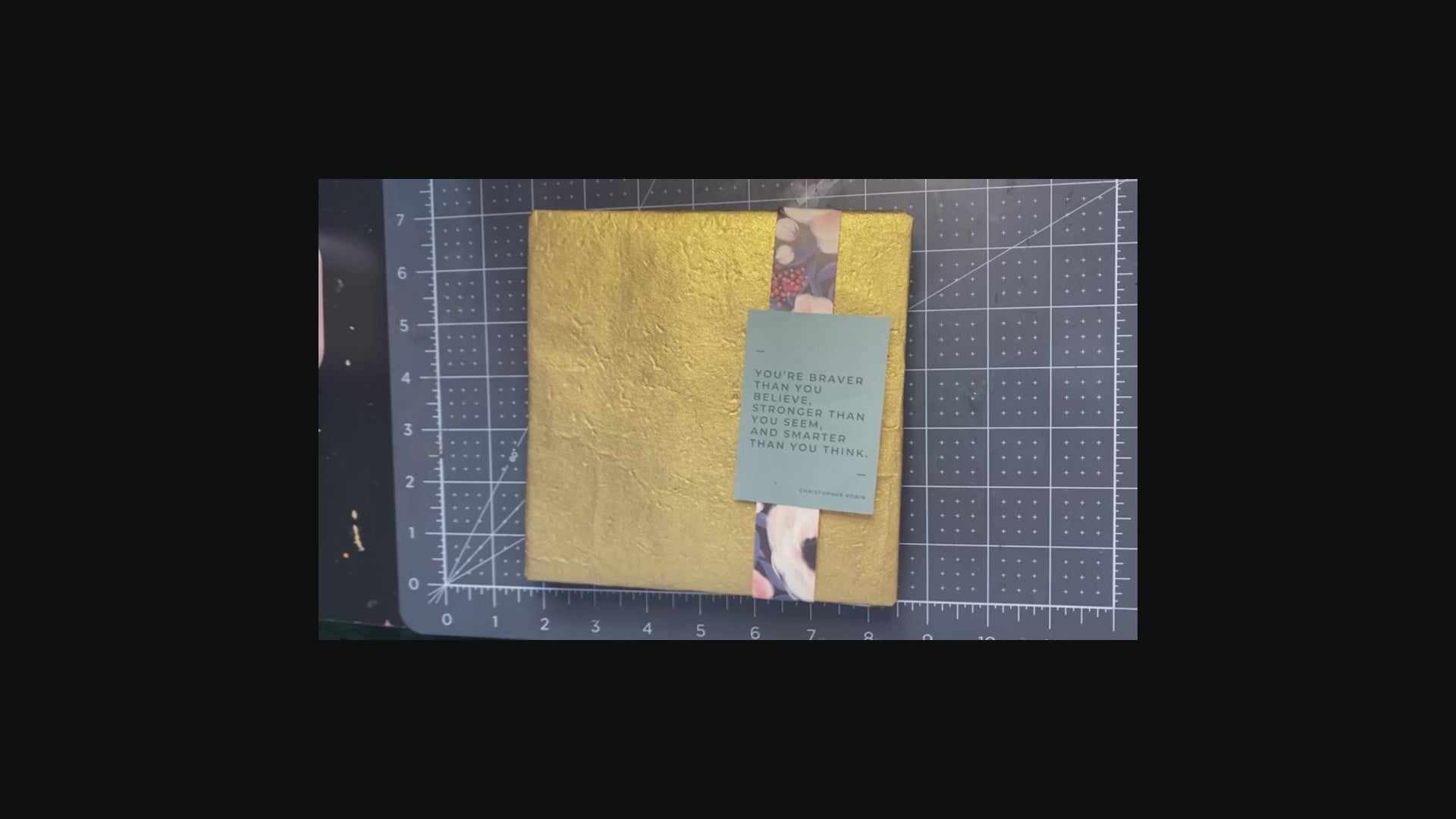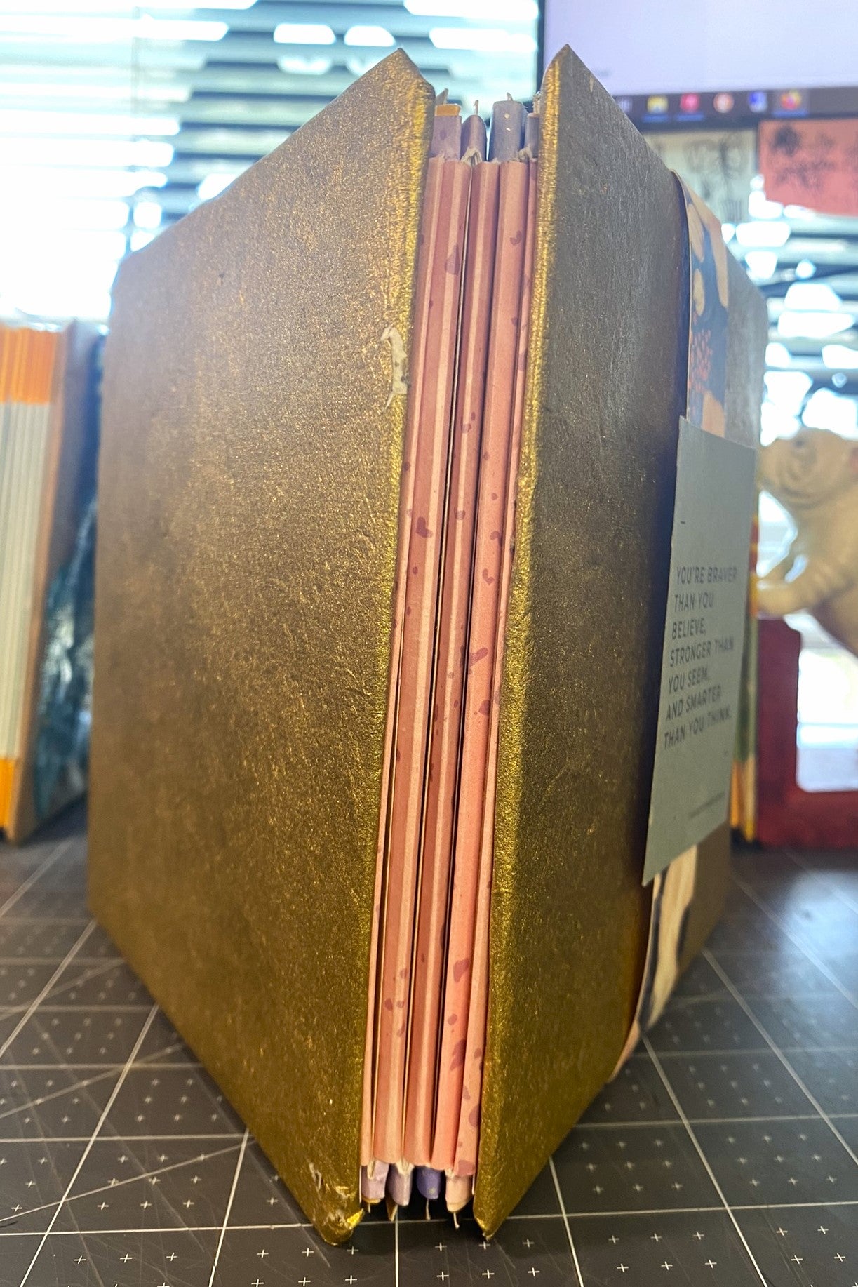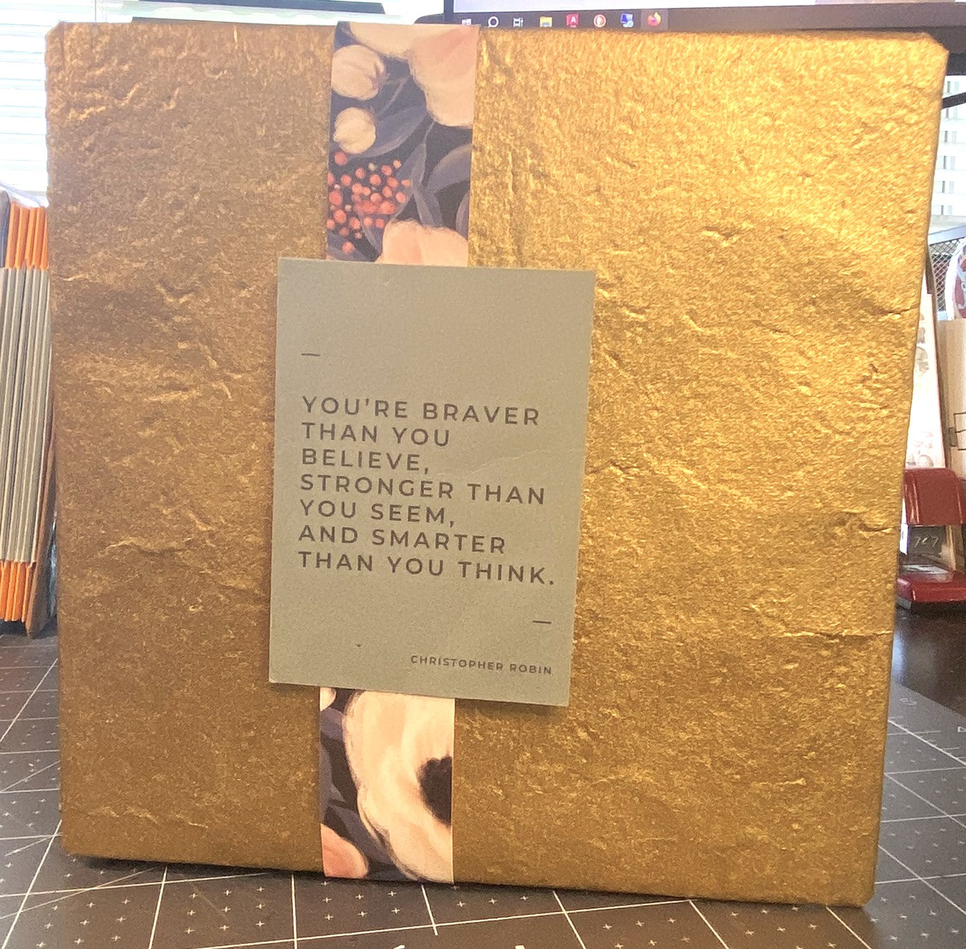 Square journal features thick textured and recycled gold paper on front and back covers. Front cover features a paper pocket band with a quote from Christopher Robin, ""You're braver than you believe, stronger than you seem, and smarter than you think." This journal is unlined and hand bound using a static accordion method. This allows me to "lock" each signature in with a piece of paper. Technically, these pages can come out, but they are a bit tricky to reinstall.
