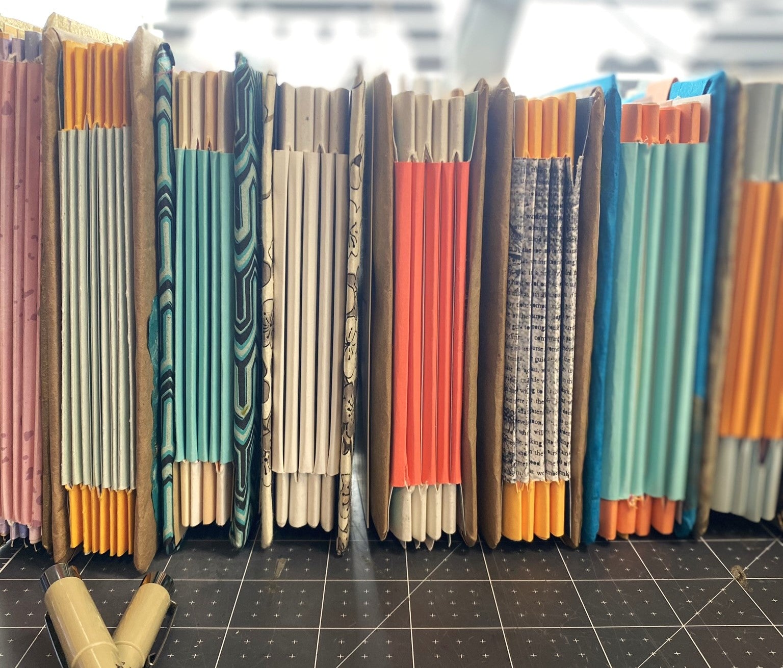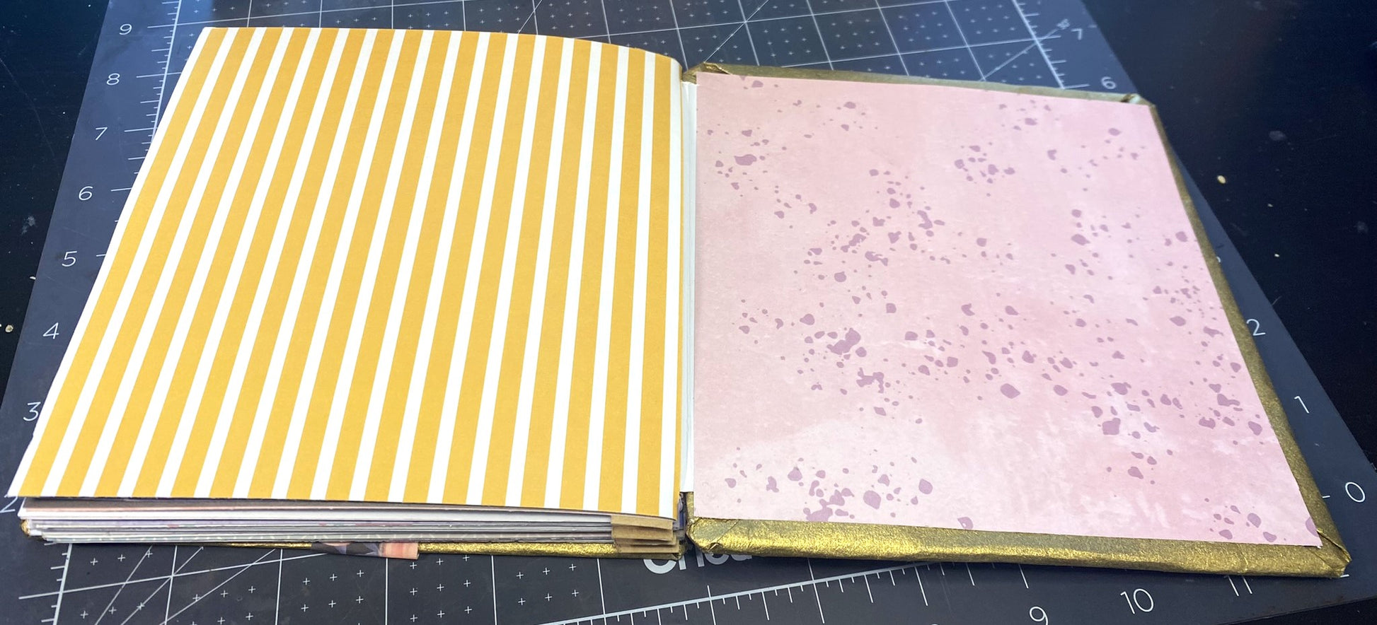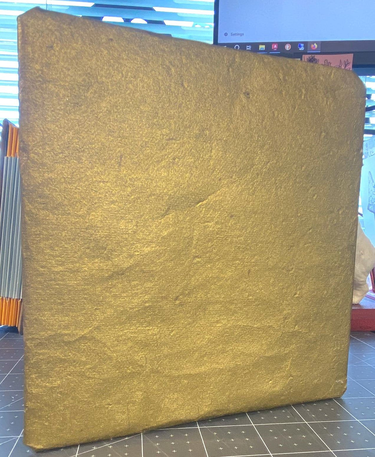 Square journal features thick textured and recycled gold paper on front and back covers. Front cover features a paper pocket band with a quote from Christopher Robin, ""You're braver than you believe, stronger than you seem, and smarter than you think." This journal is unlined and hand bound using a static accordion method. This allows me to "lock" each signature in with a piece of paper. Technically, these pages can come out, but they are a bit tricky to reinstall.