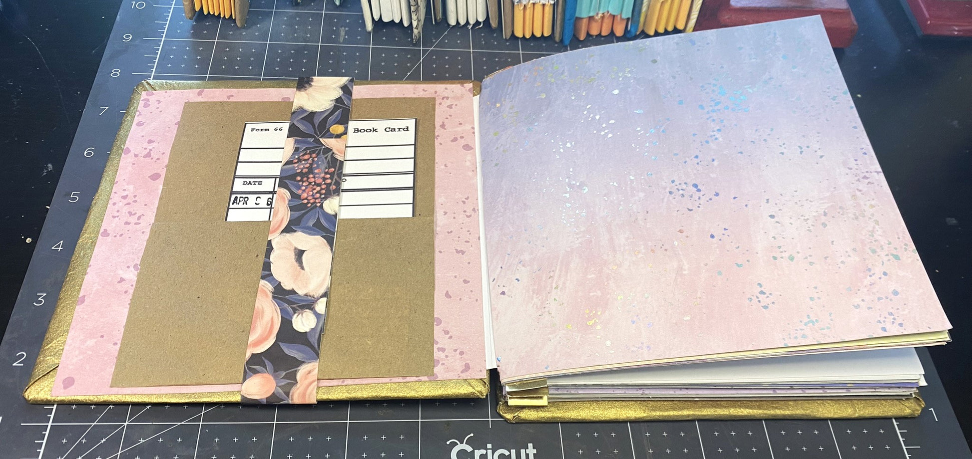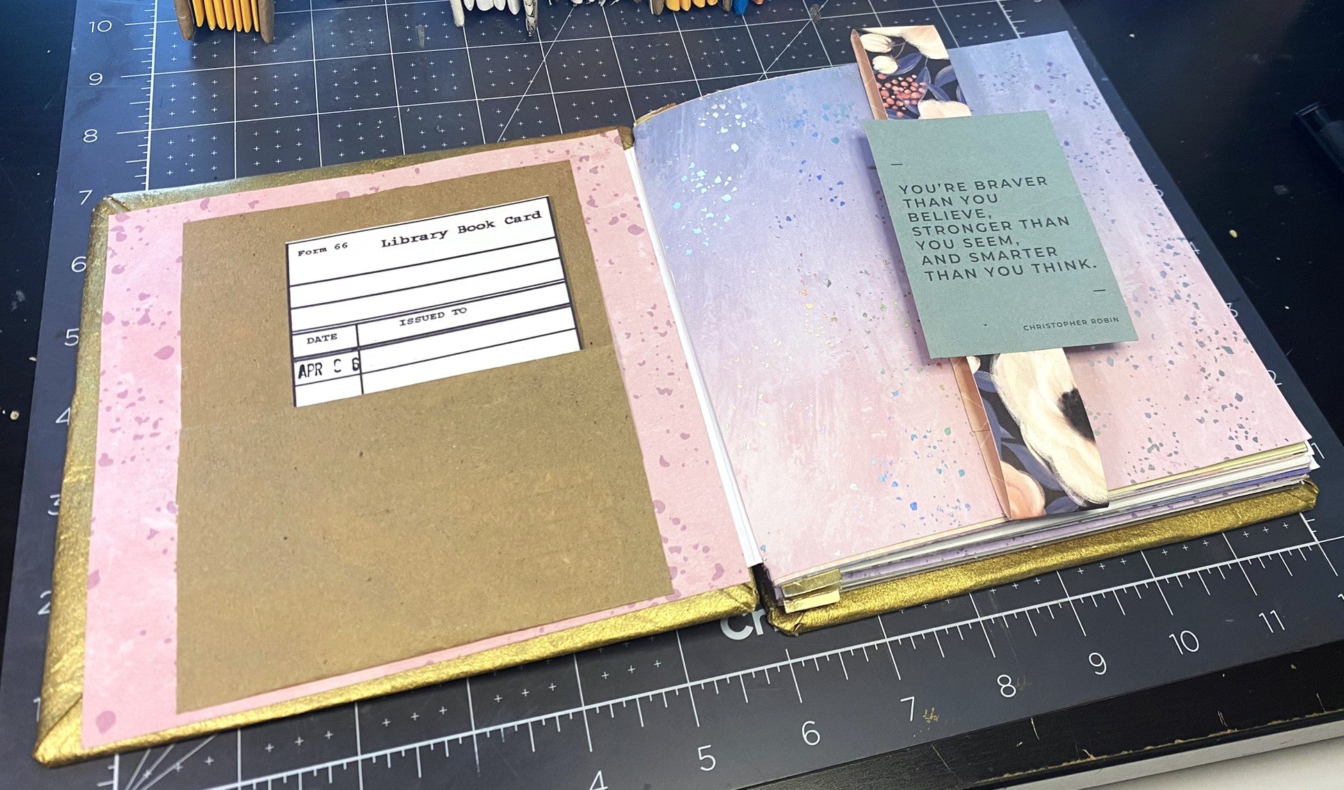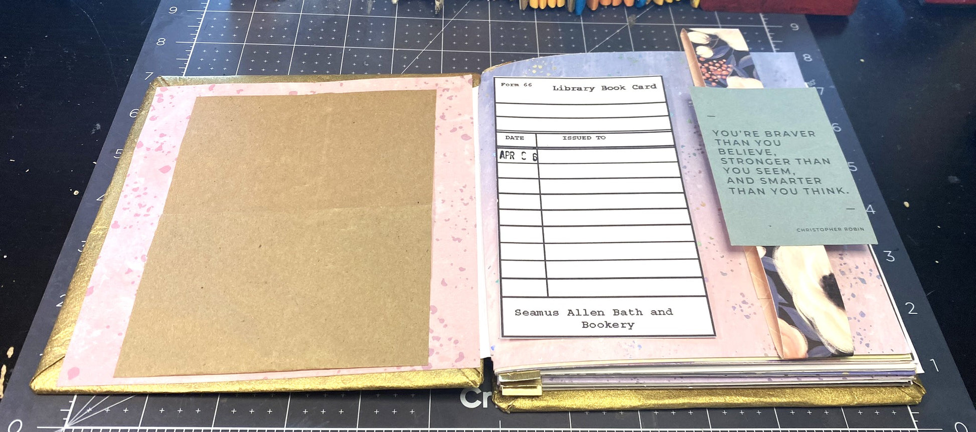 Inside of front cover features a library card, stamped with the date the book was completed. This card can be removed and/or used as a bookmark.