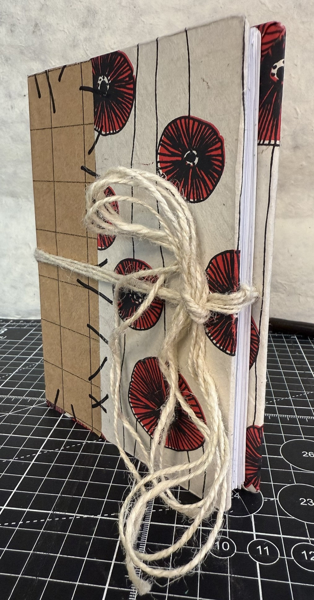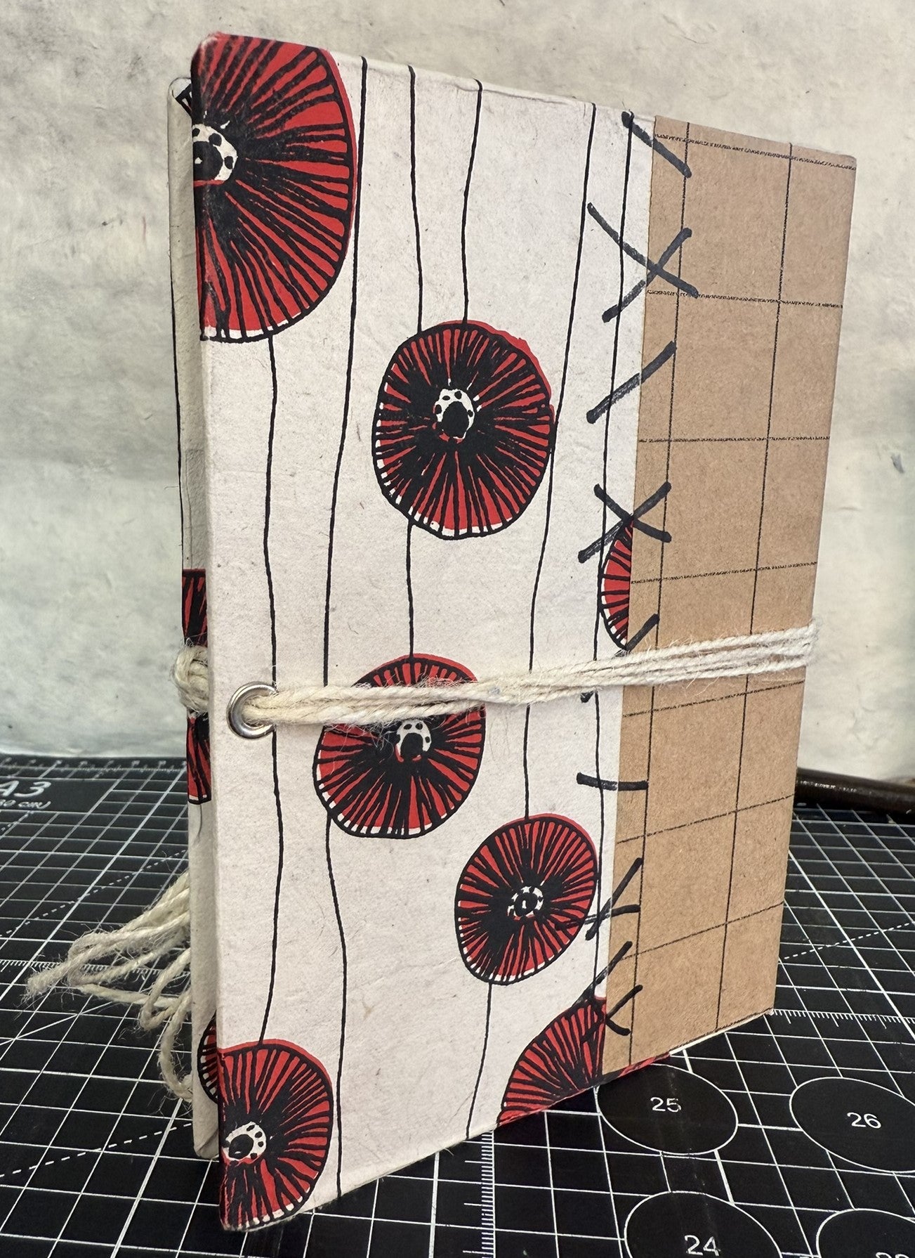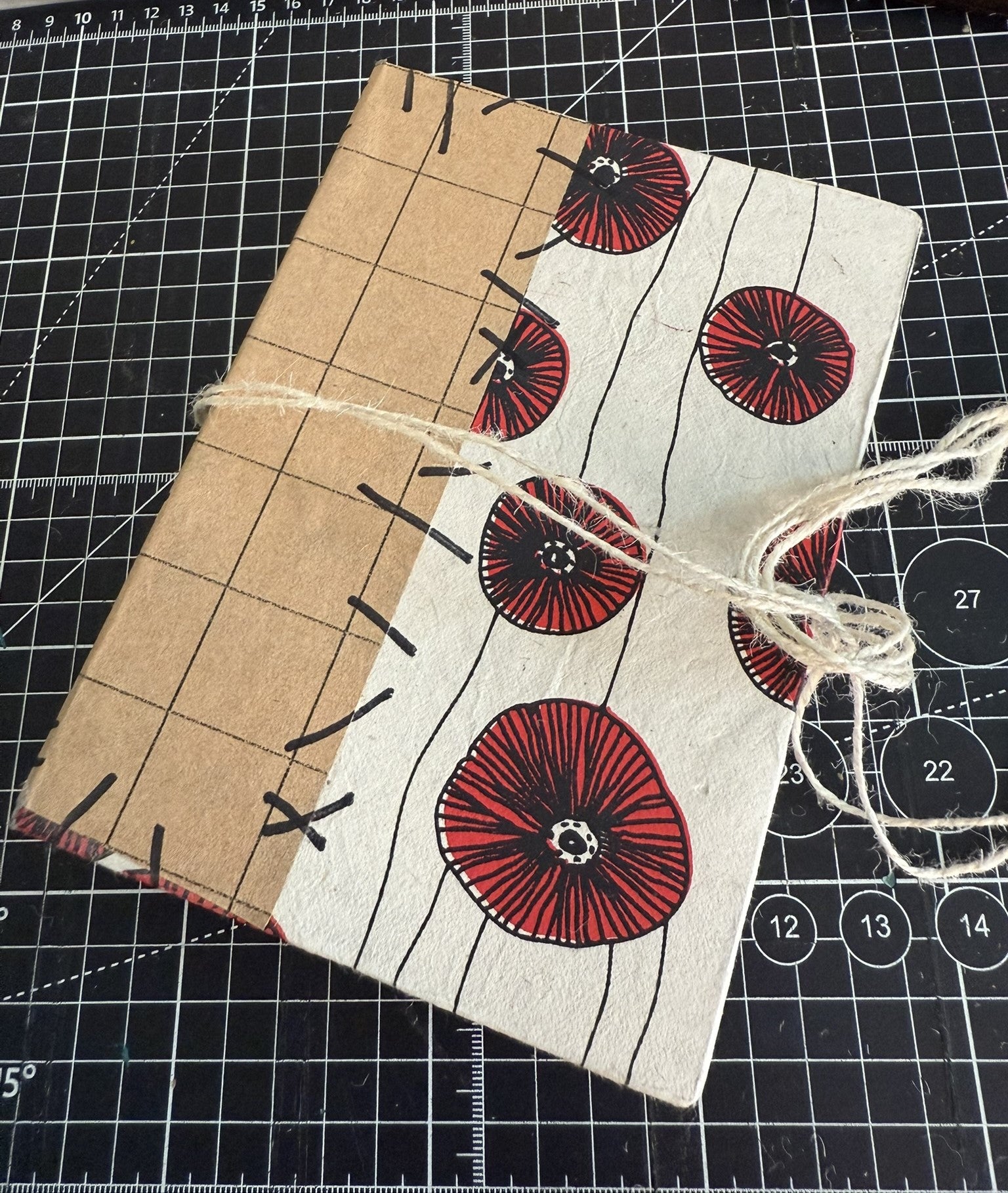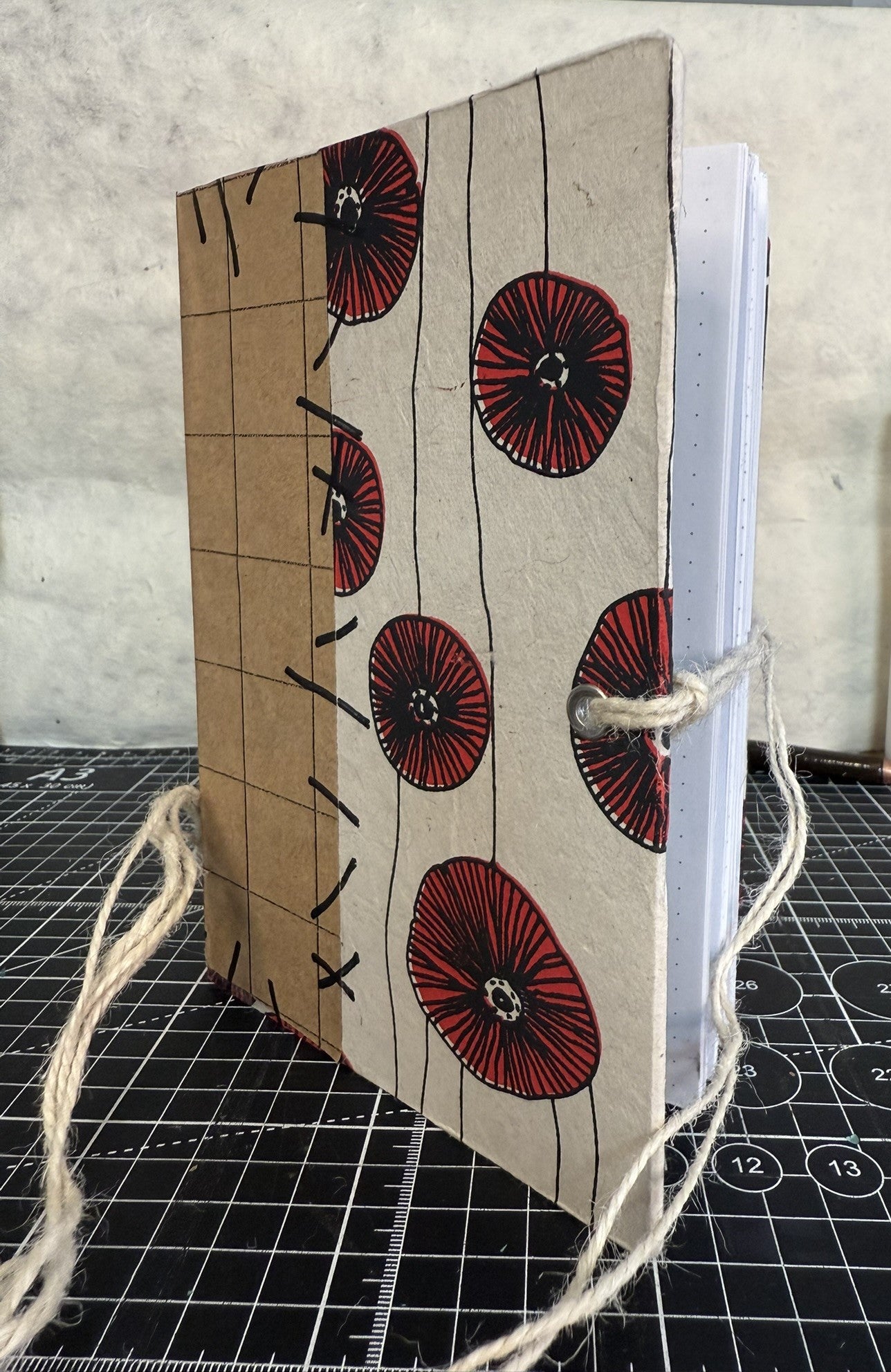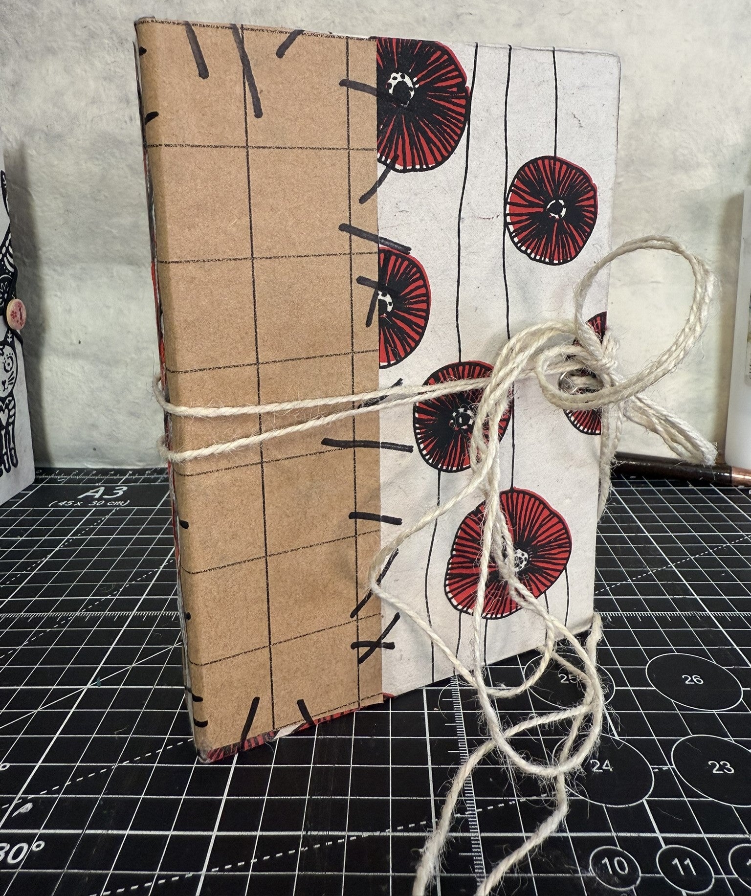 Wrapped in lokta paper printed with striking red and black poppies, this journal balances softness with strength. Inside, black kraft paper lines the covers, grounding the design in contrast and calm.
