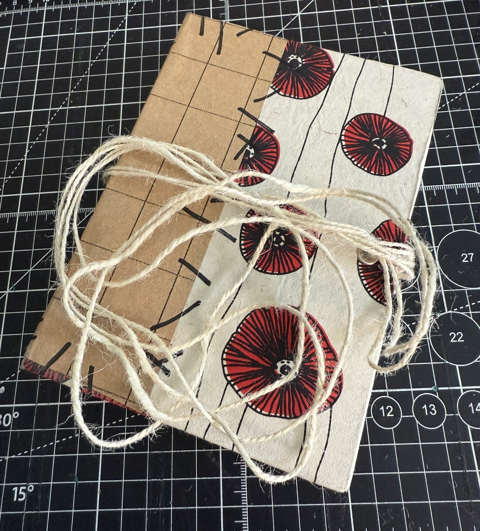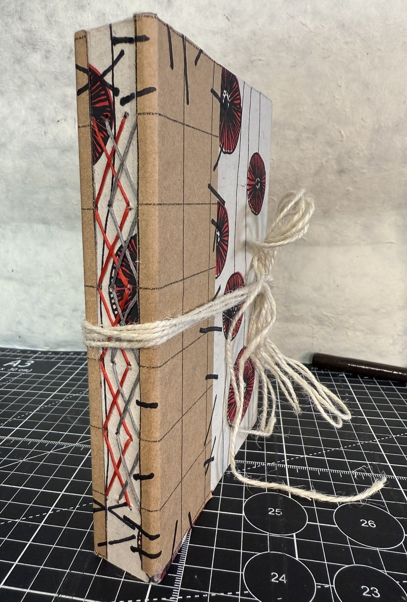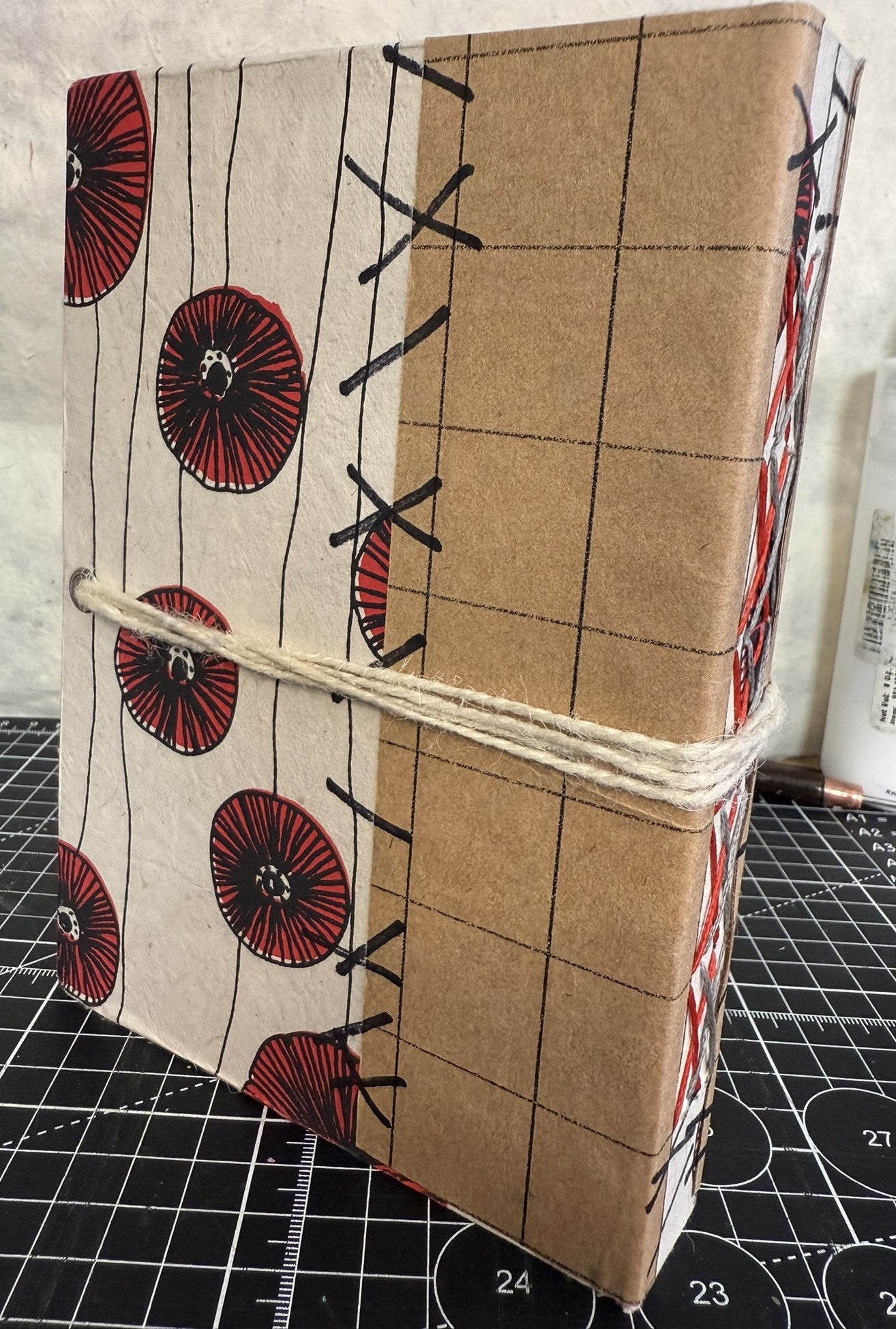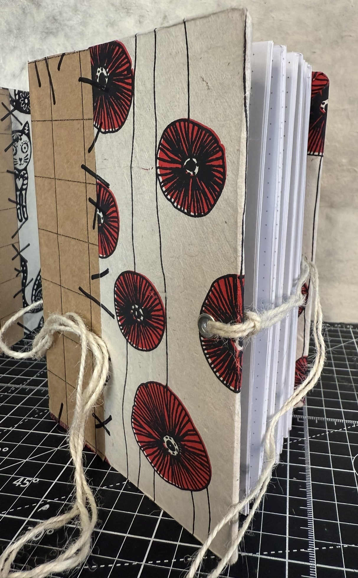 Wrapped in lokta paper printed with striking red and black poppies, this journal balances softness with strength. Inside, black kraft paper lines the covers, grounding the design in contrast and calm.