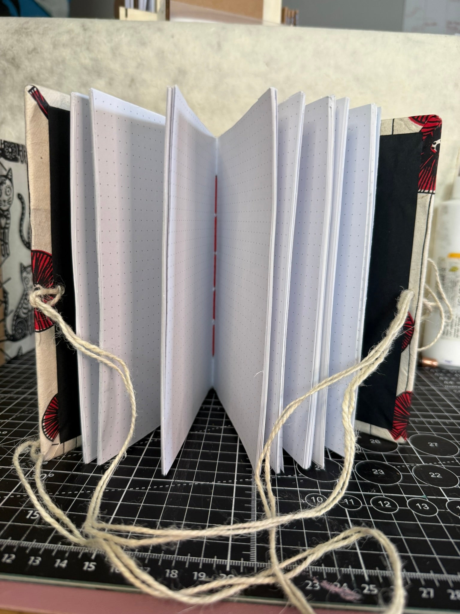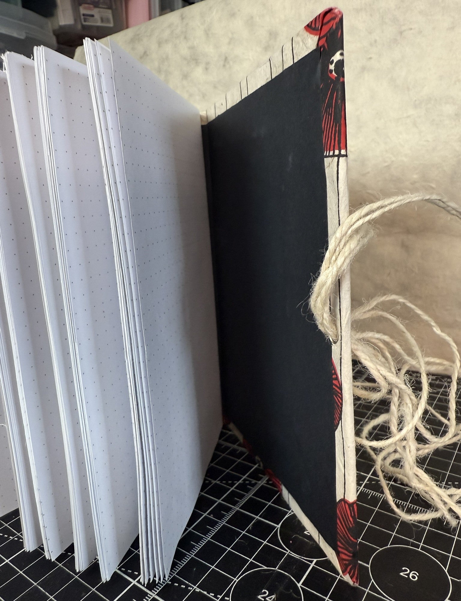 A single white cord threads through grommets at the edge of both covers and ties in a bow to keep the journal closed. When the book is open, the cord wraps gracefully around the back, staying out of the way while you write.