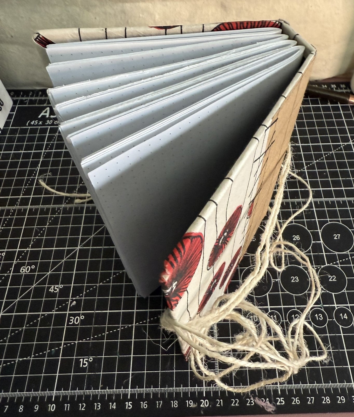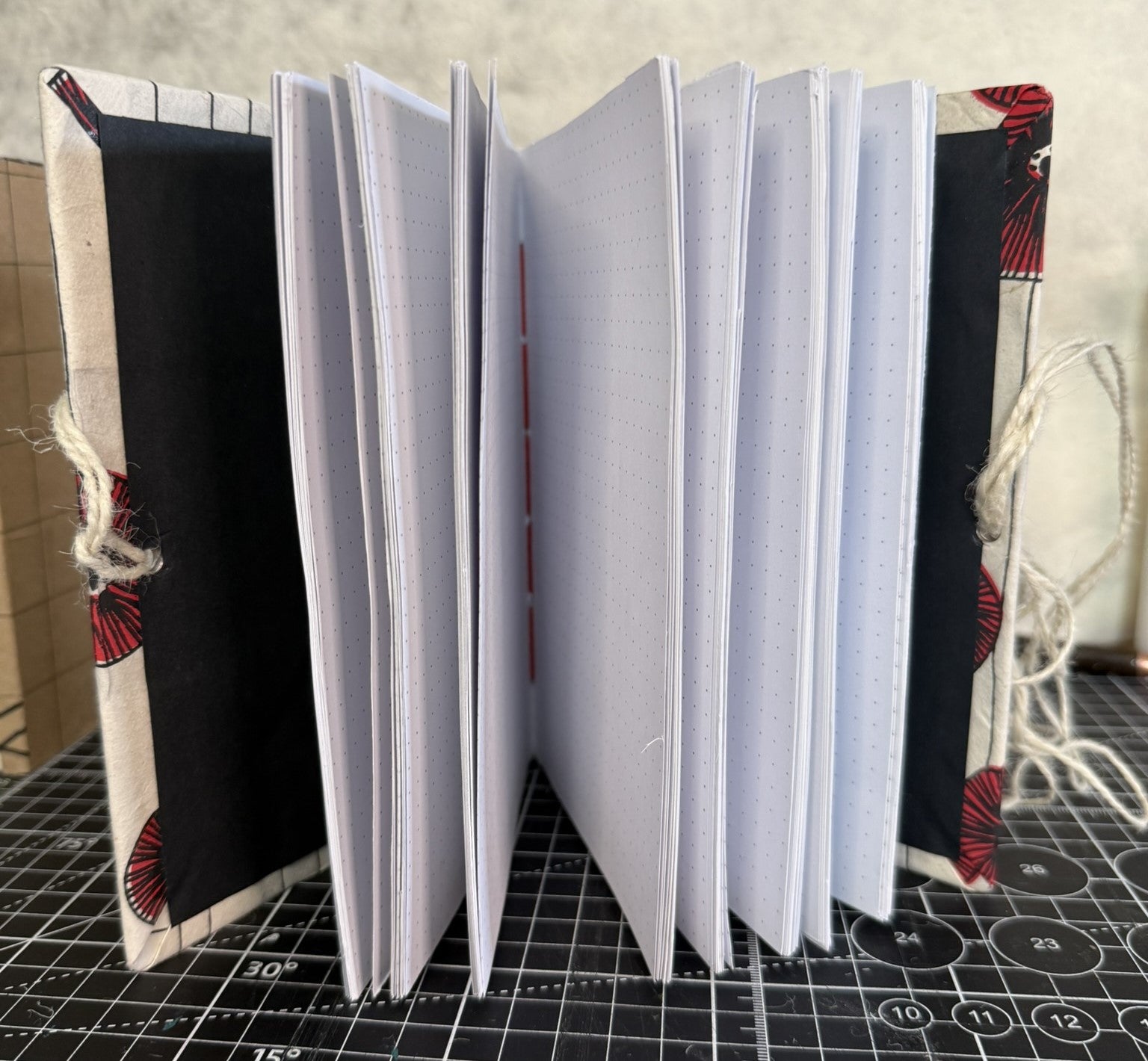 The pages — 96 of them, dot grid — are securely stitched to the spine. Reinforcement patches appear at the seams where the covers meet the spine, front and back. These visible mends are part of this journal’s story — a testament to care and reconsideration.