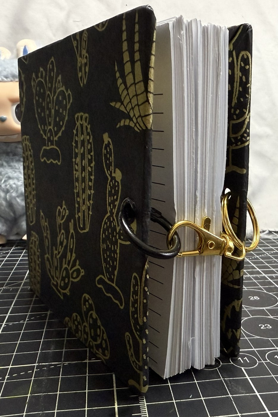 This 5" x 5" handmade journal is wrapped in a black lokta paper printed with different gold cacti, stitched with gradient white to black thread in a chain stitch.