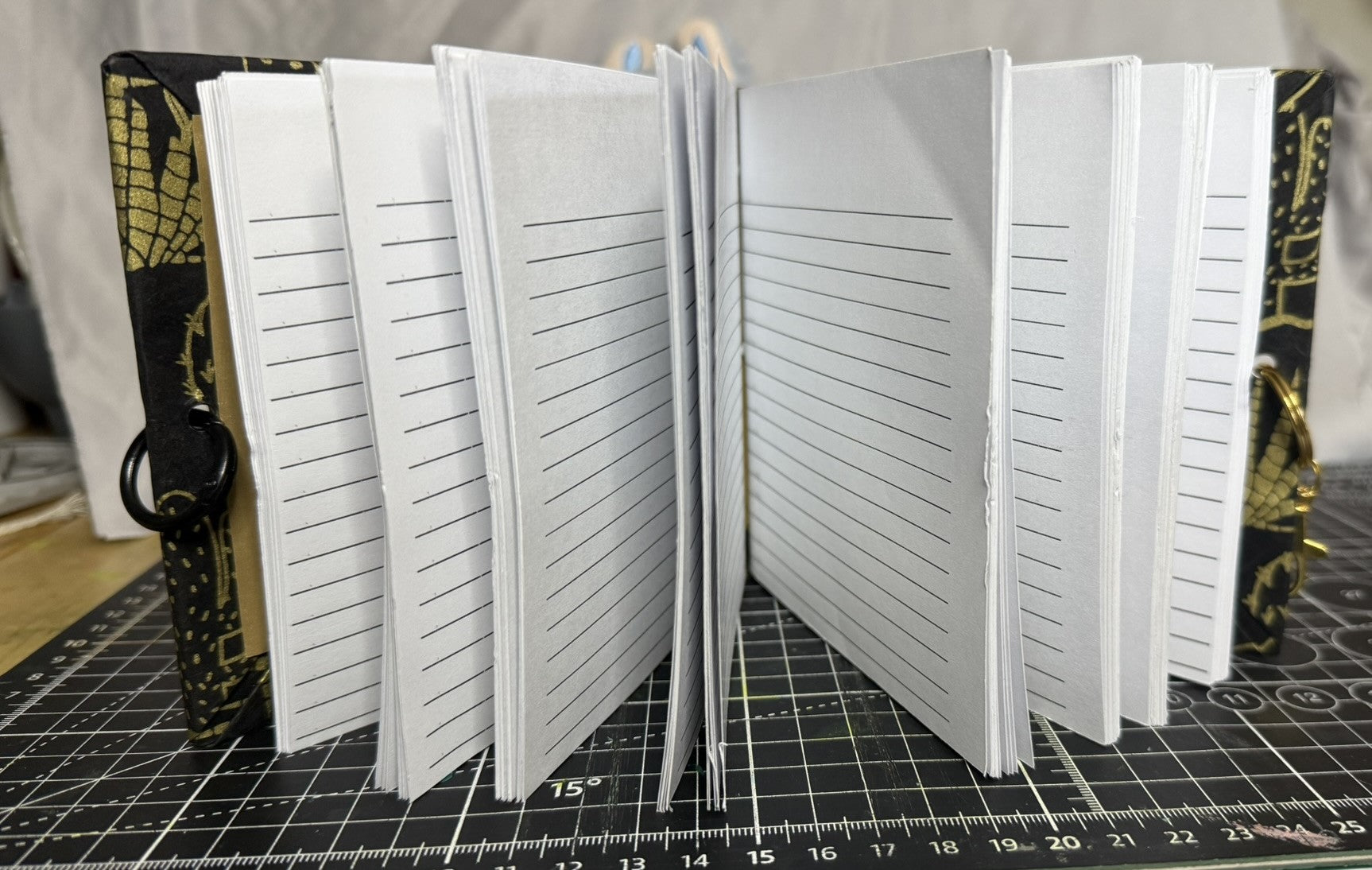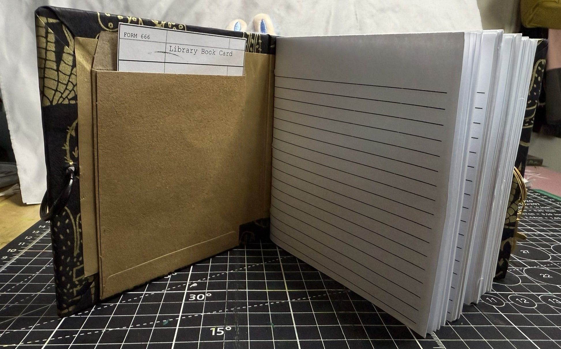 Two metal clasps, one black, and one gold clasp keeps everything secure, while inside, gold lokta paper lines the covers and 120 hand-printed, acid-free lined pages wait for your notes, sketches, or daily reflections. Finished with a stamped library card pocket marking the date this book was made.