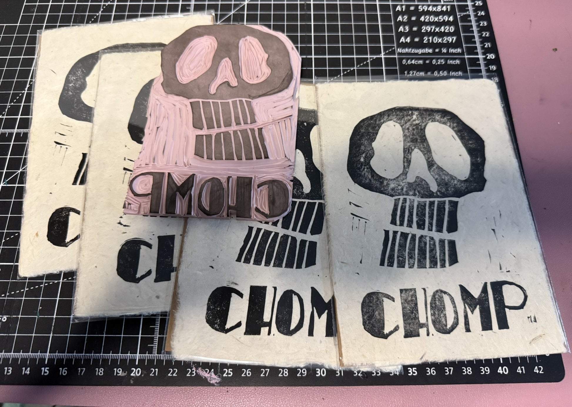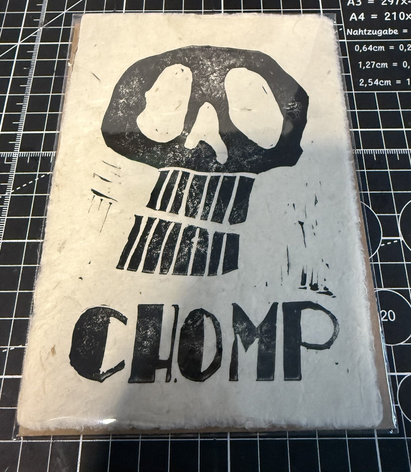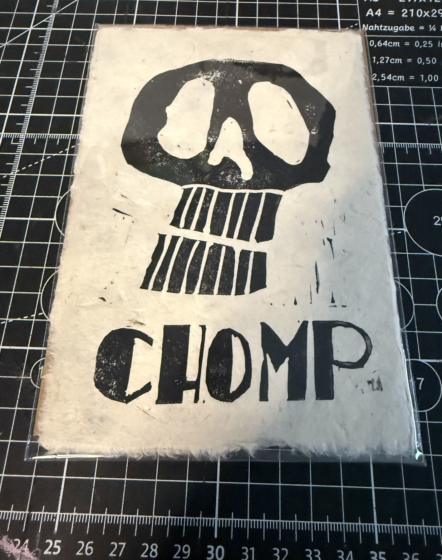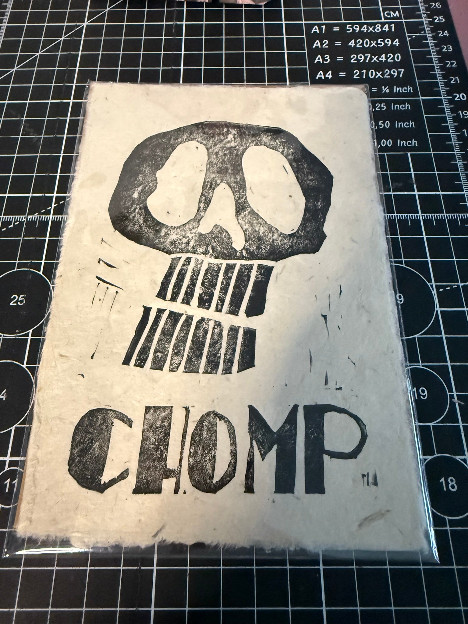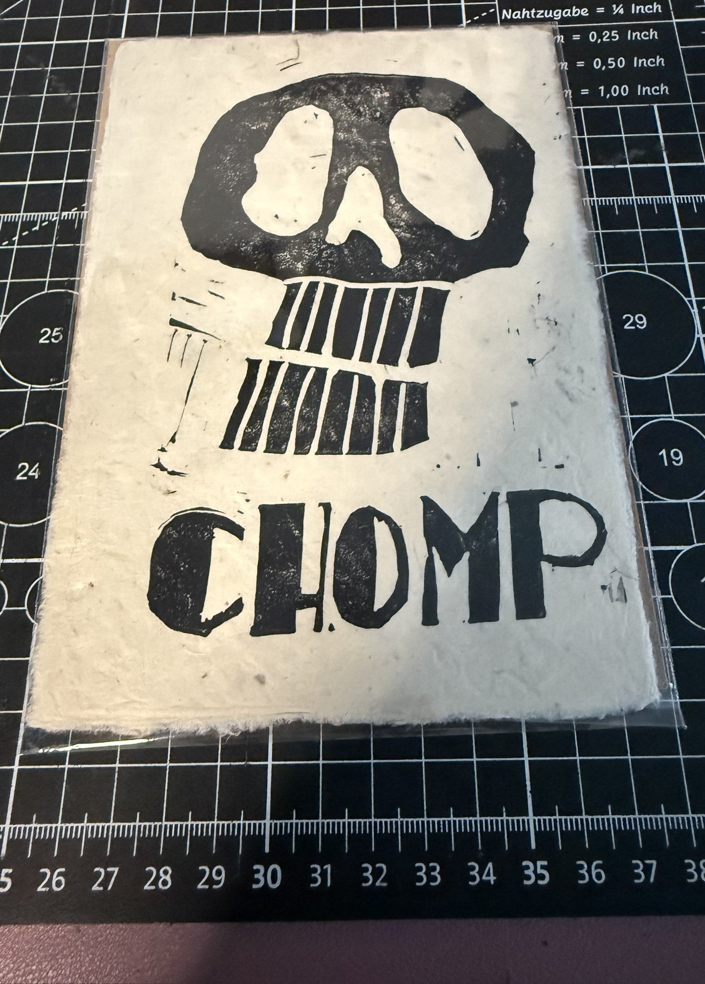 Because nothing says “done and dusted” like a grinning skull and the word CHOMP.