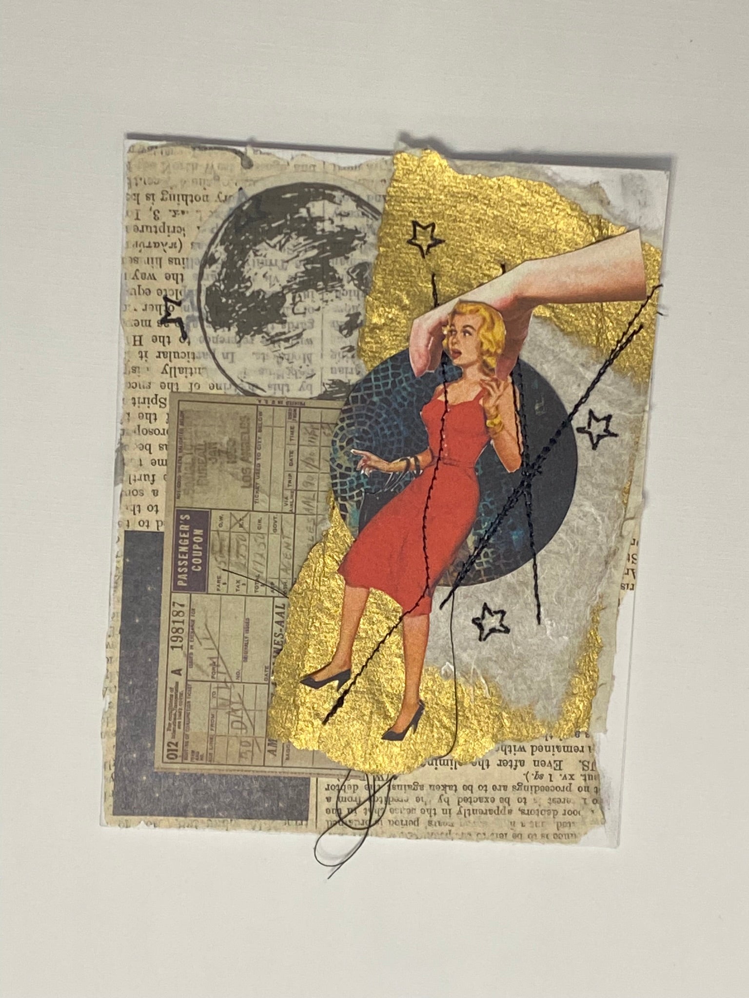 Card Materials: New and recycled papers, acetate, and thread. Includes papers recycled from a bible.