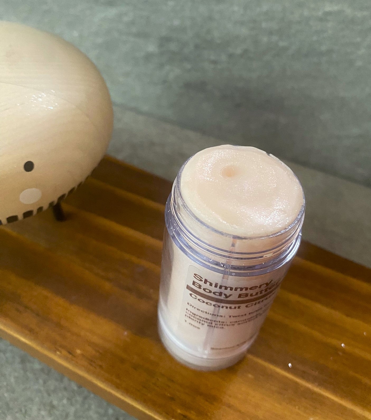 Ingredients: coco butter, tumeric shea butter, candelilla wax, squalane oil, pink mica, sparkle mica