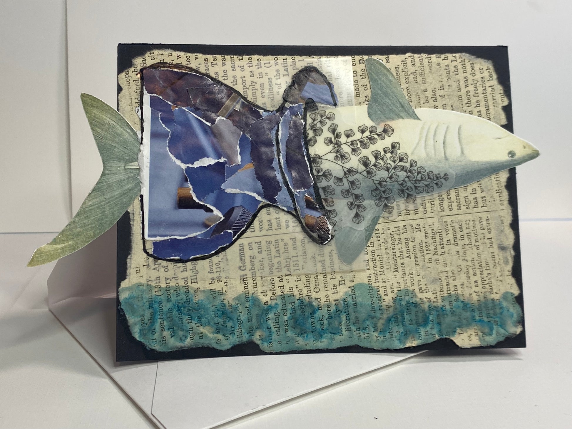 Card Materials: New and recycled papers, acetate, thickening grit paste, alcohol ink, and thread. Includes papers recycled from a bible.