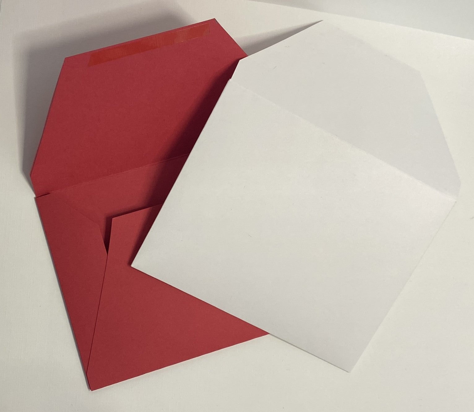 Envelopes are custom made to the size of the card and are available in white, black, or a complementing color. The complementing color will be left up to me, but will enhance the card experience. There is a strip of double sided tape along the top to seal the card before mailing.