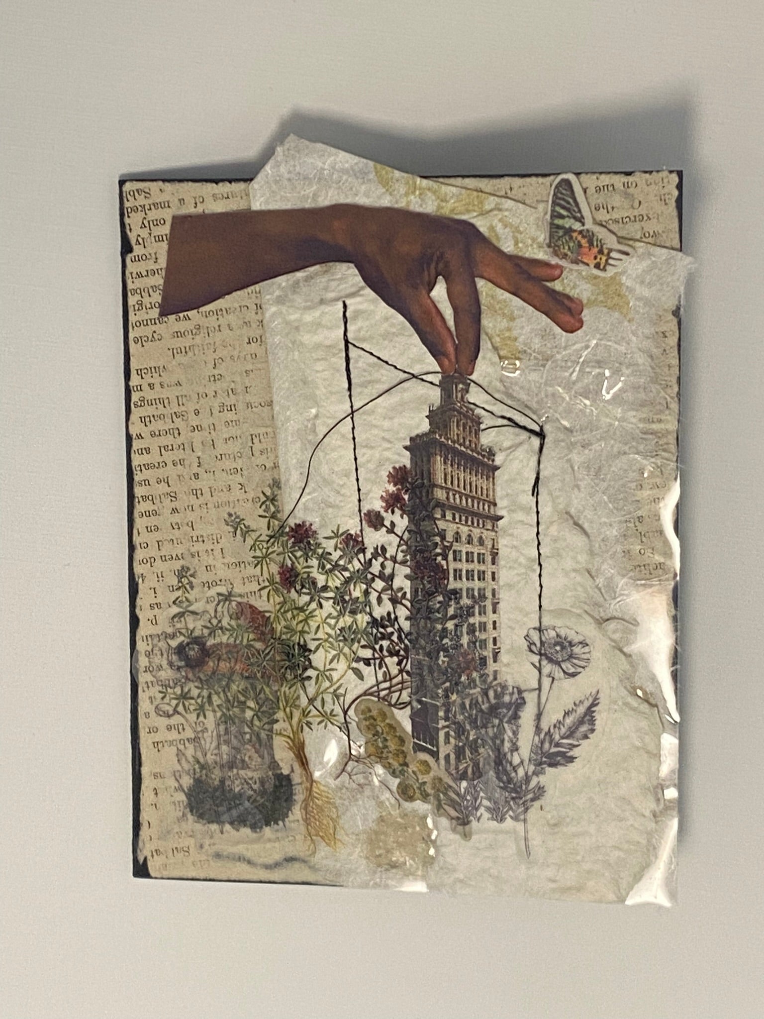 Card Materials: New and recycled papers, acetate, and thread. Includes papers recycled from a bible.