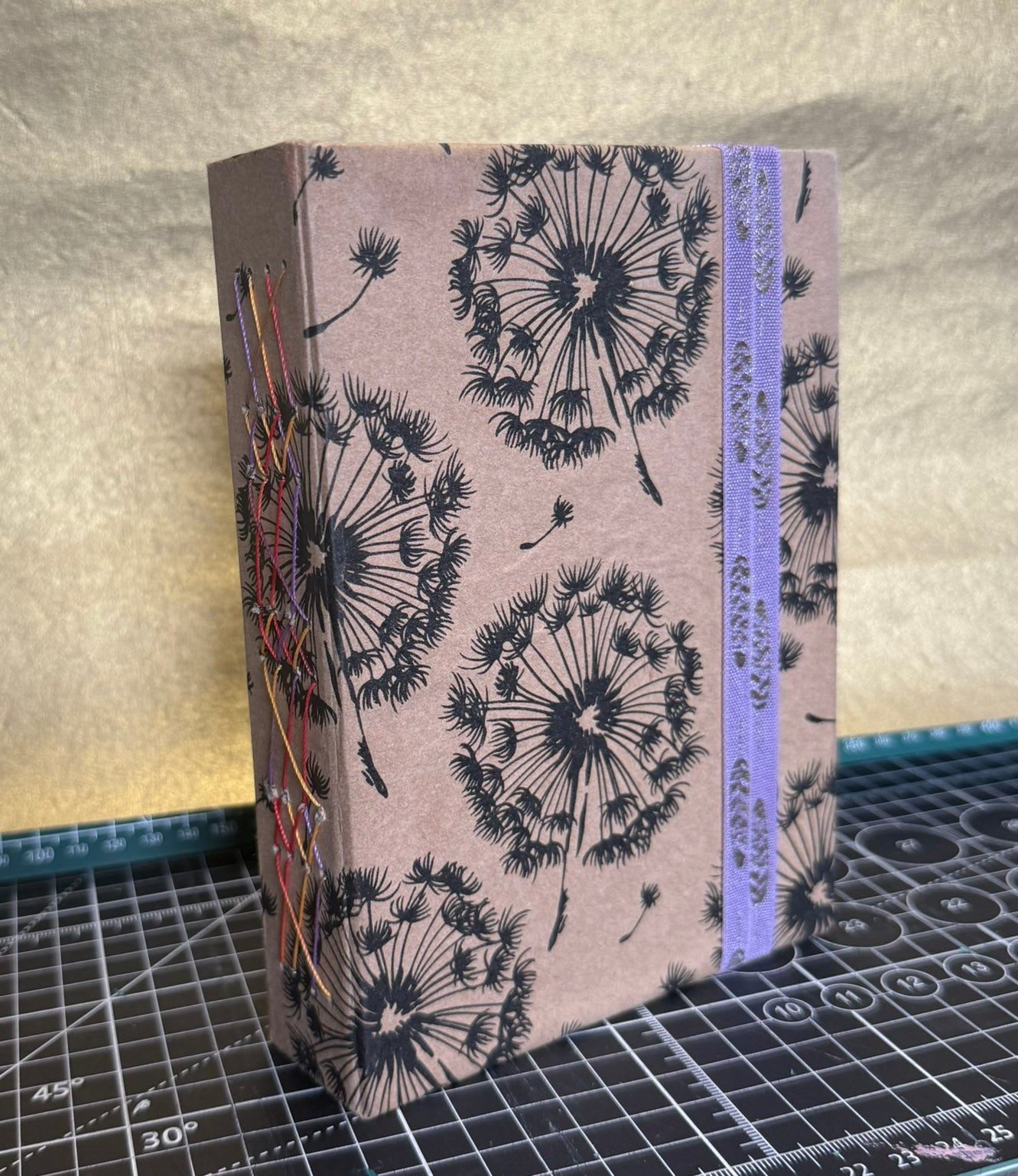 Closure: Purple feathered ribbon threaded through grommets, wraps securely around journal