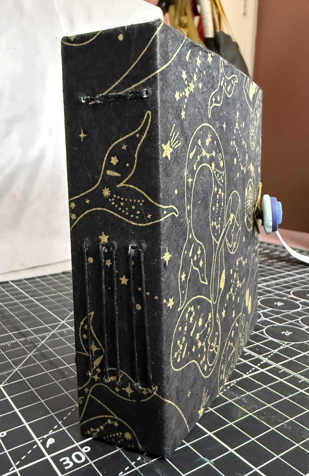 A handbound 5x5 journal wrapped in black lokta paper with shimmering gold mermaids and stars. Finished with three stacked resin buttons in shades of blue and a gold elastic closure. Inside: 120 lined pages, with black kraft paper lining.
