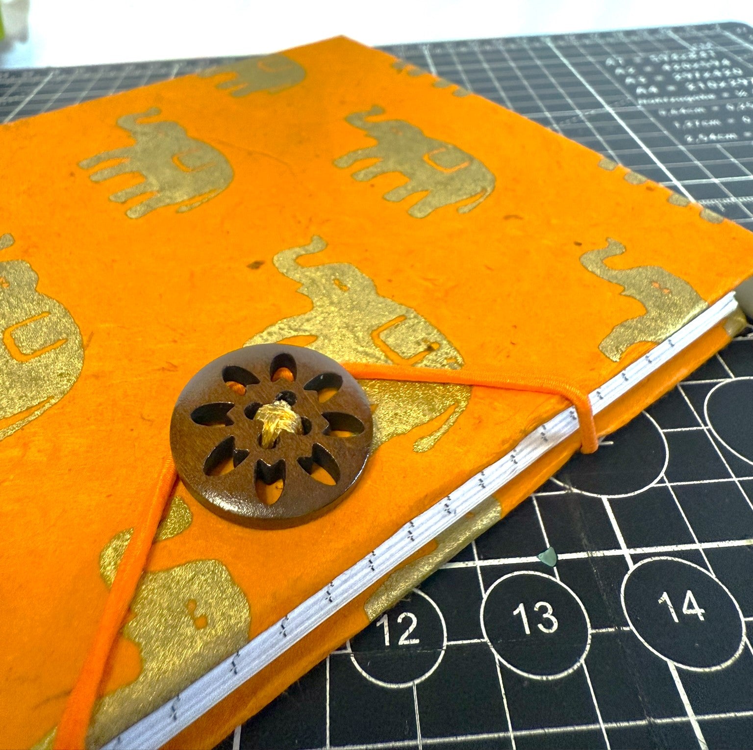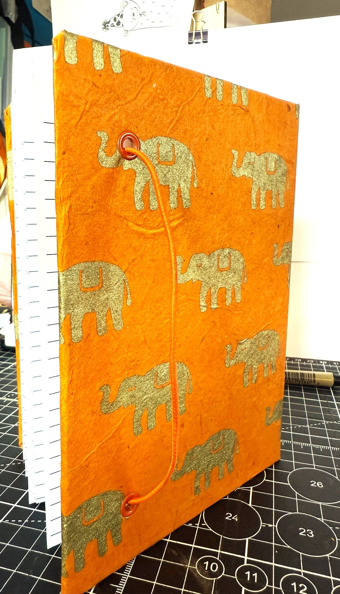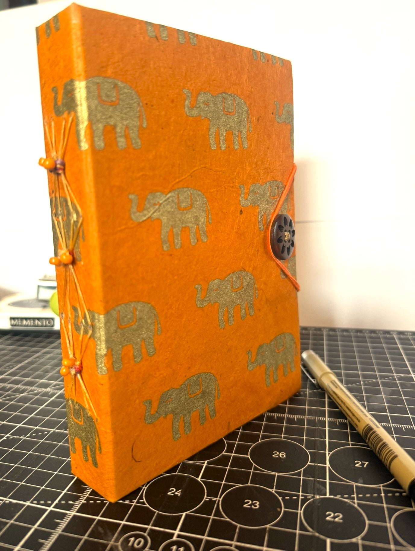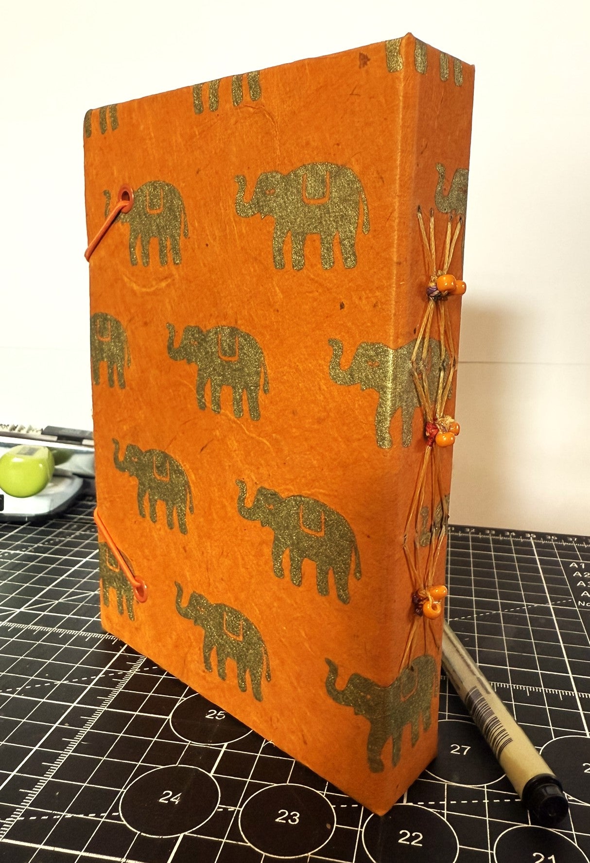 A warm, joyful little world in book form. The cover is bright orange lokta, adorned with gold-printed elephants that seem mid-stroll. Inside, soft orange kraft lines the cover, and 96 lined pages (hand-printed, of course) await your thoughts.