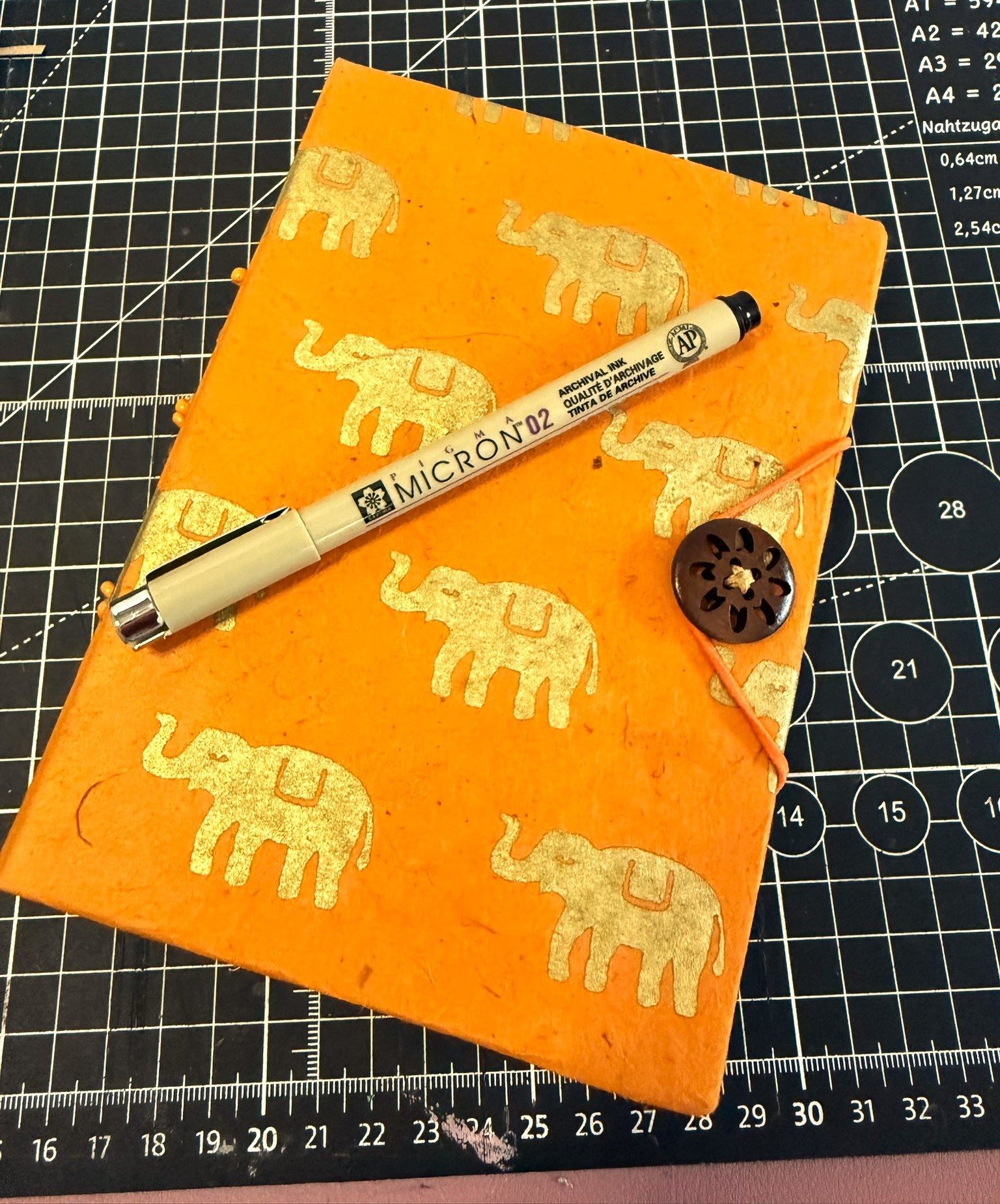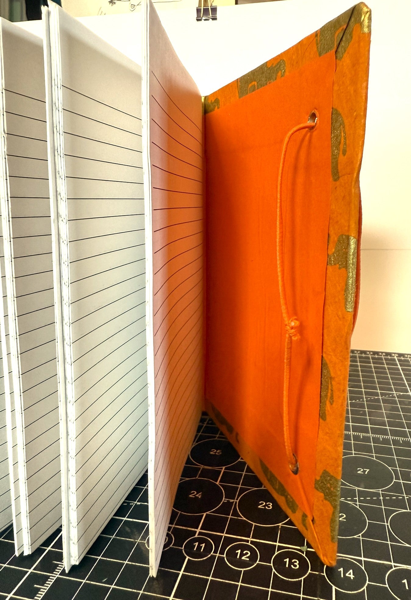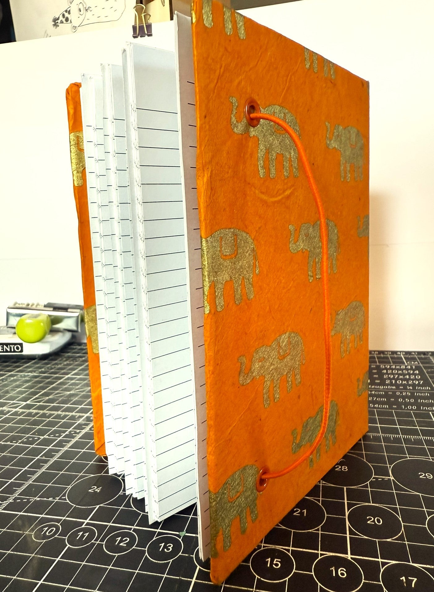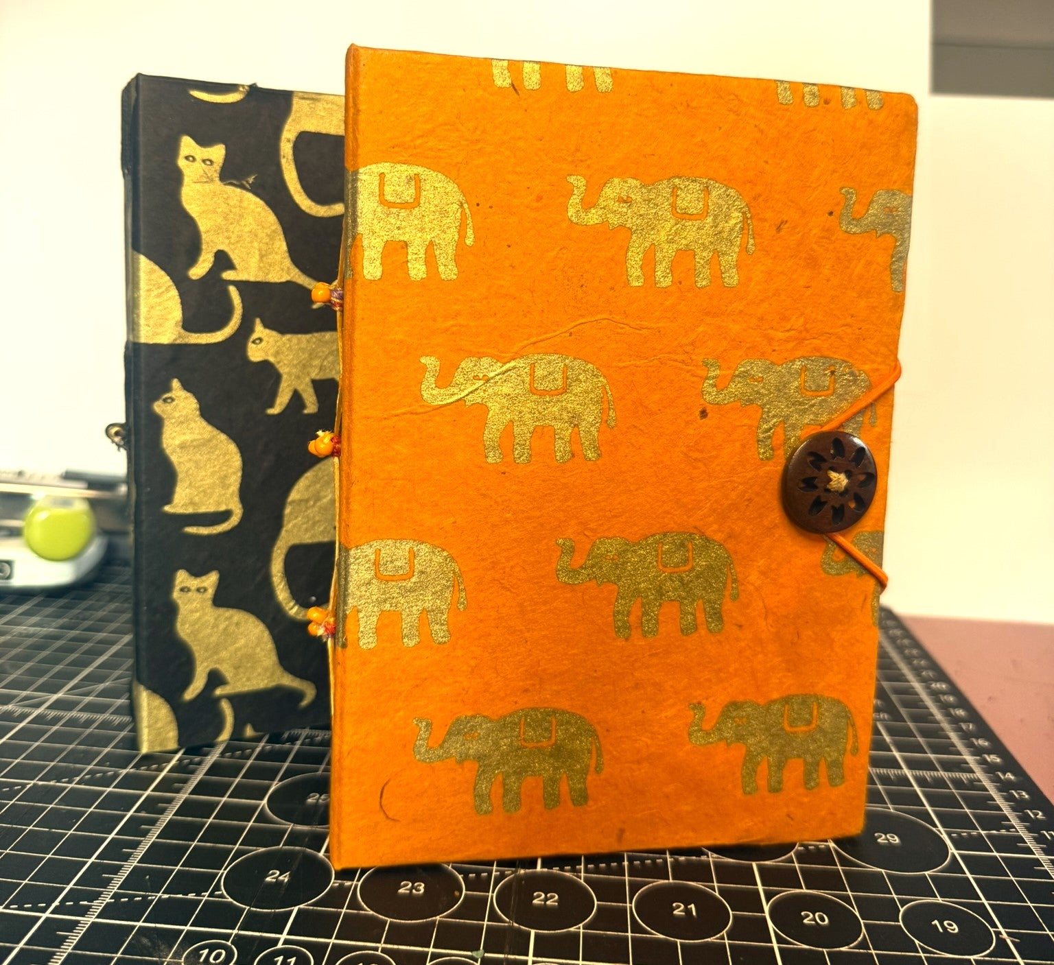 A warm, joyful little world in book form. The cover is bright orange lokta, adorned with gold-printed elephants that seem mid-stroll. Inside, soft orange kraft lines the cover, and 96 lined pages (hand-printed, of course) await your thoughts.