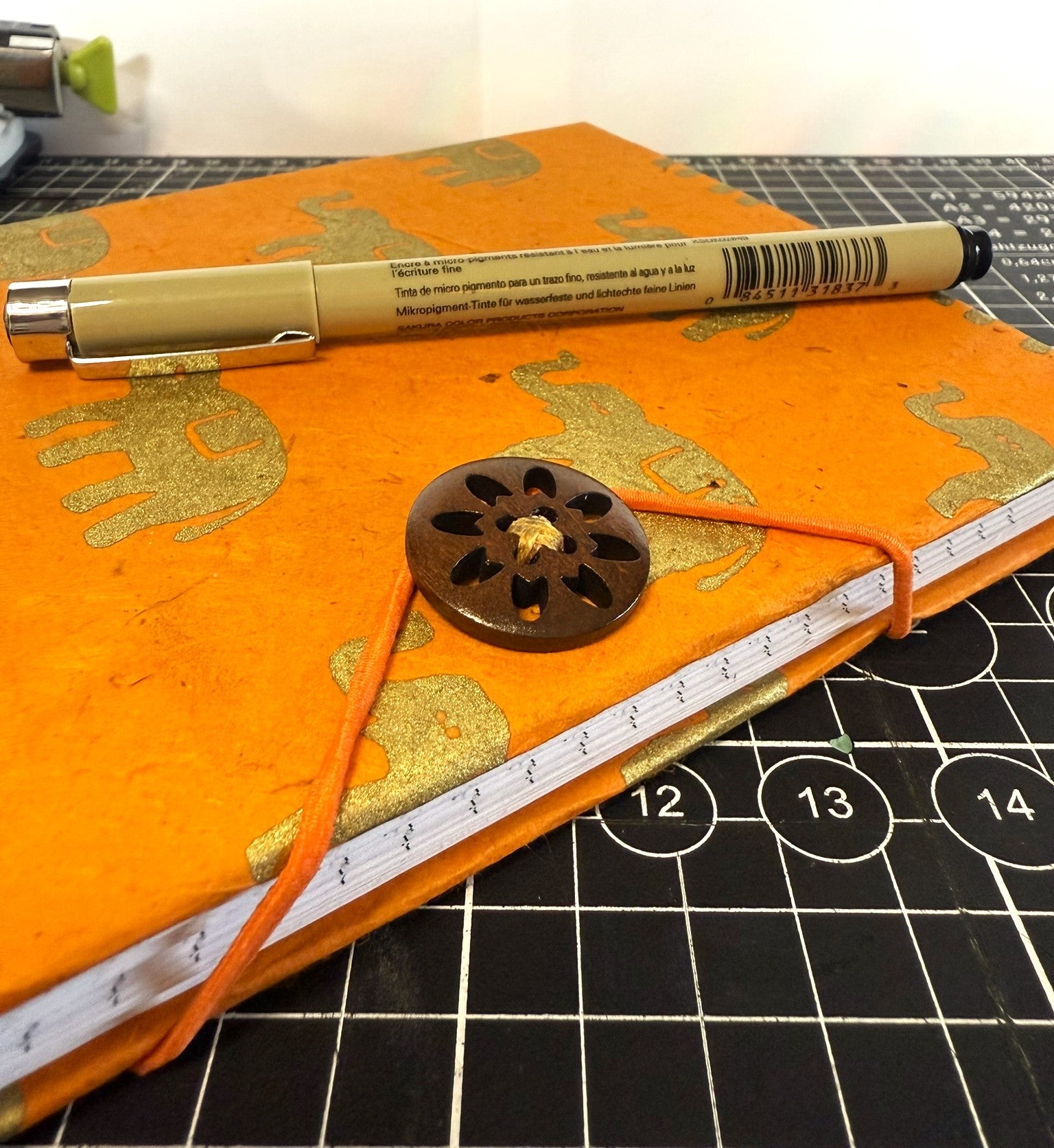 Hand-stitched with orange waxed thread and adorned with orange beads, the spine shows off a classic long stitch. A brown wood button etched with floral motifs graces the front, paired with orange elastic that threads through back grommets—you decide how to use it: loop it around the button to close the journal, or wrap it around pages to mark your place.