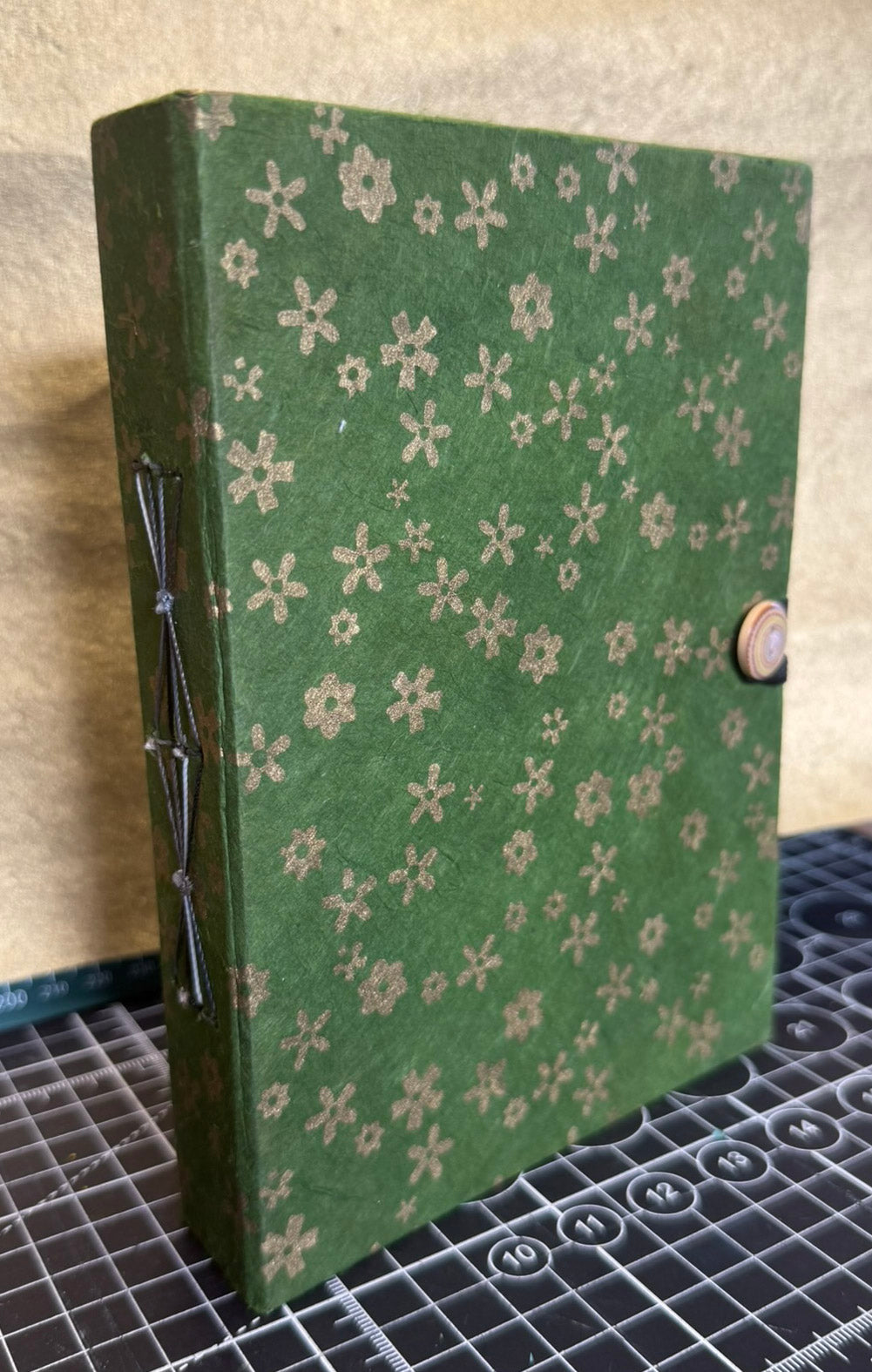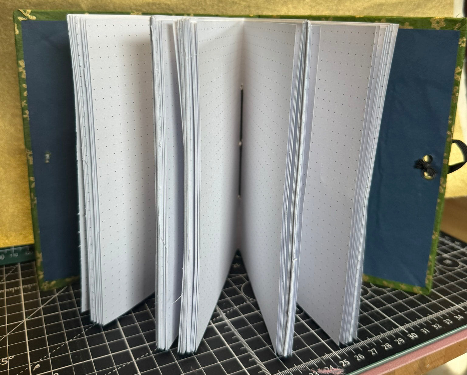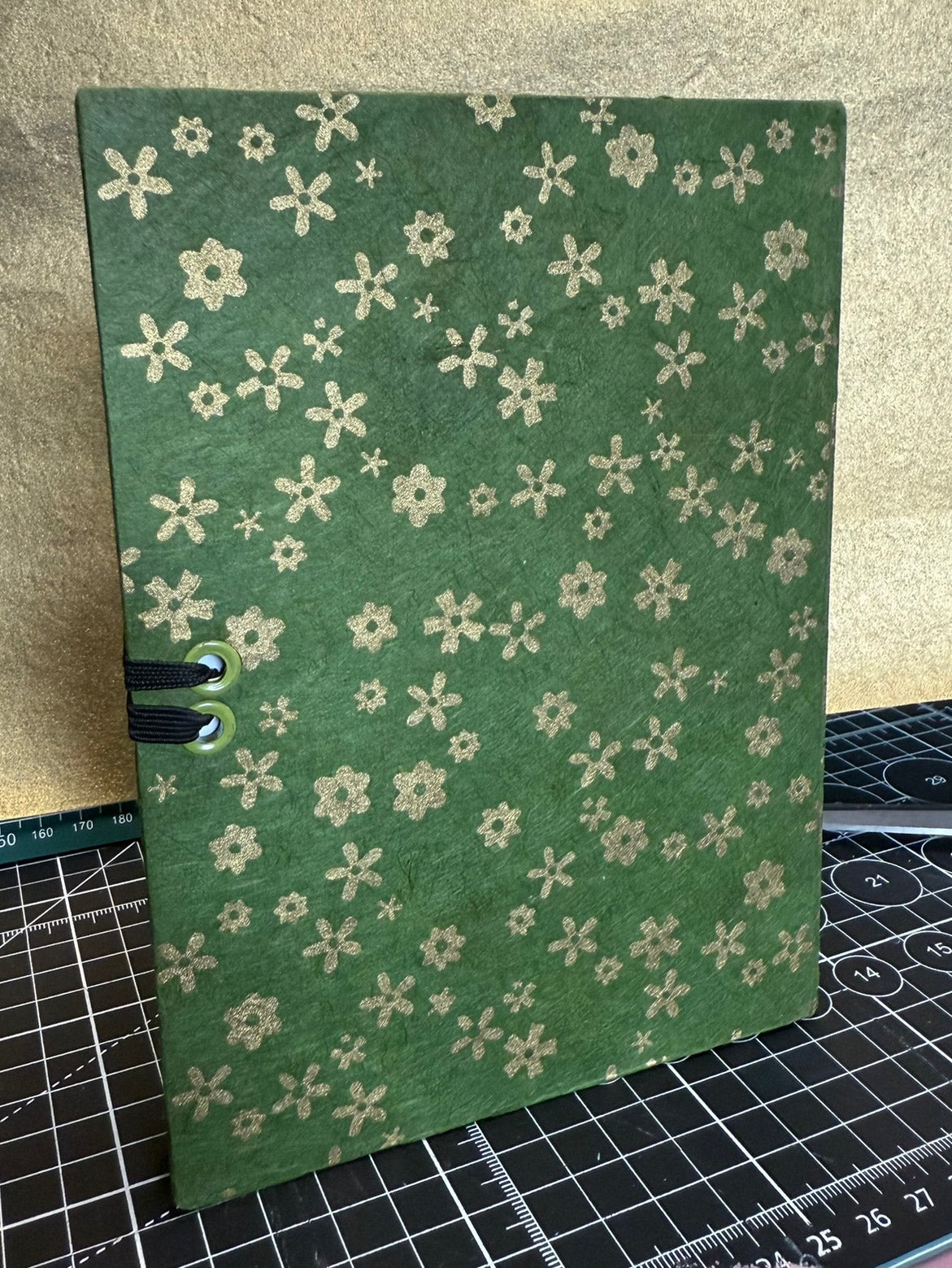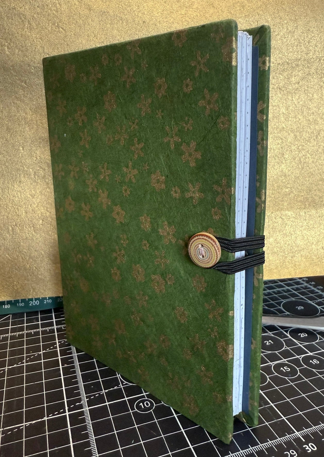 This 5x7 journal is wrapped in green lokta paper printed with small gold daisies. The spine features an intricate star motif formed from vertical threads wrapped in a white-to-black gradient. Inside, cool blue kraft paper lines the covers, and 96 dot grid pages are stitched in matching gradient waxed thread.