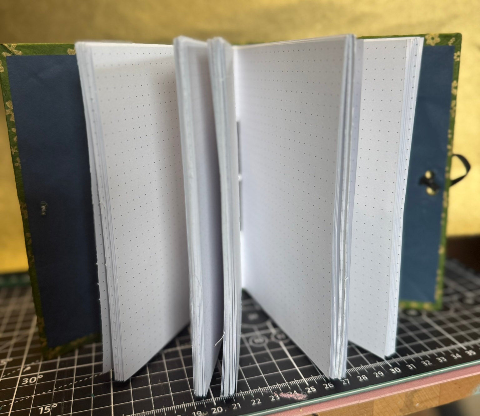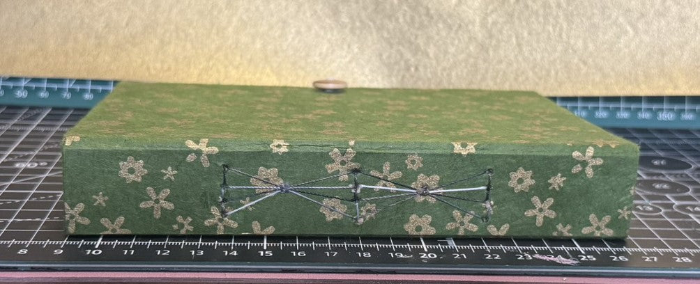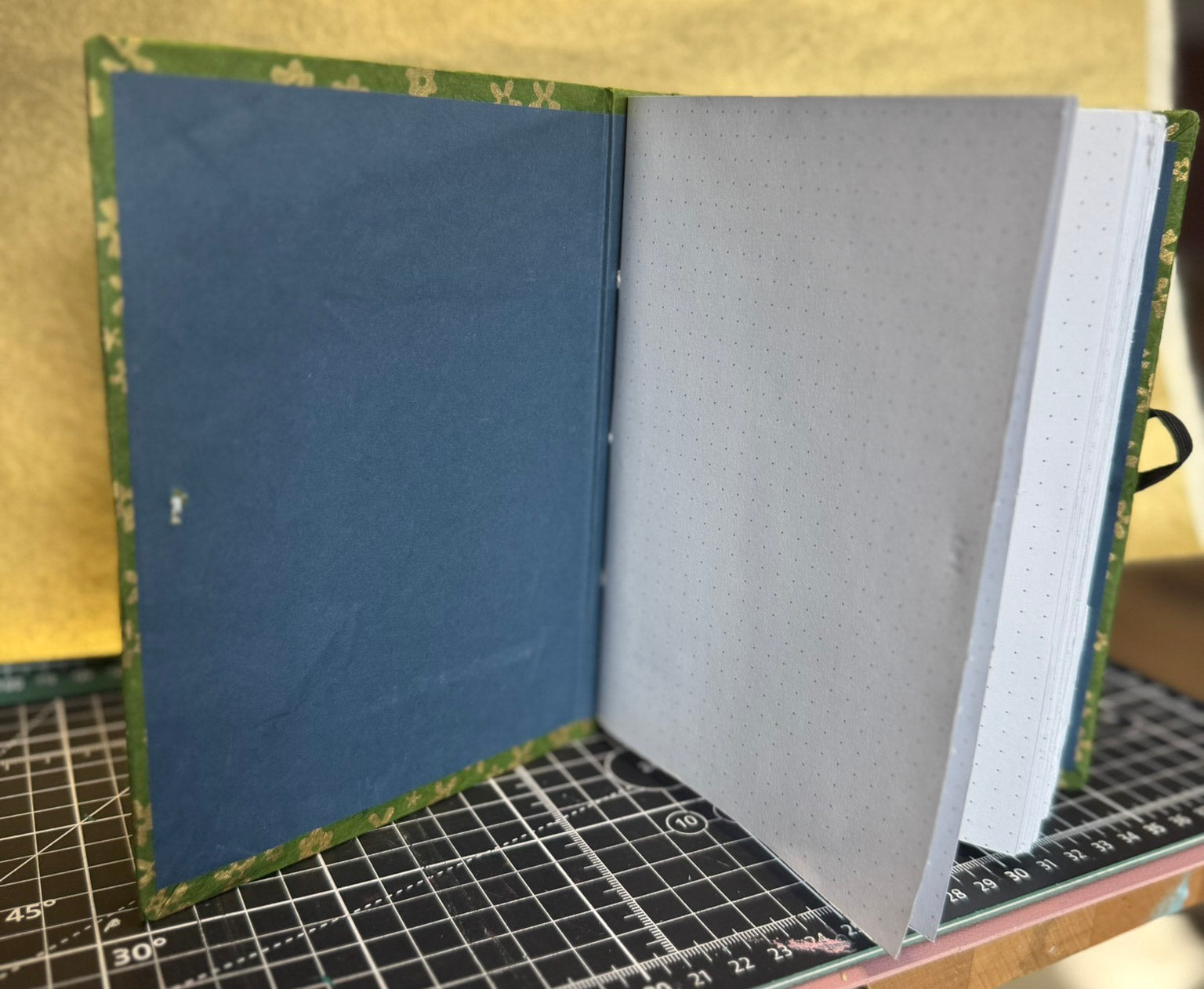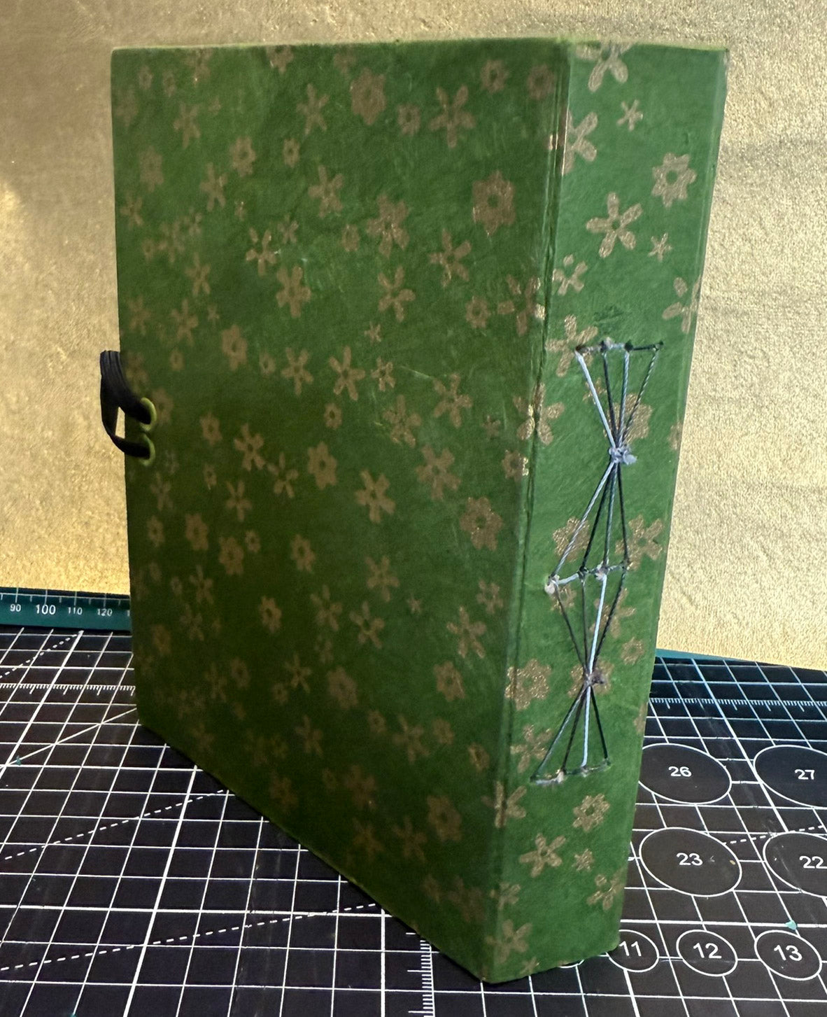 This 5x7 journal is wrapped in green lokta paper printed with small gold daisies. The spine features an intricate star motif formed from vertical threads wrapped in a white-to-black gradient. Inside, cool blue kraft paper lines the covers, and 96 dot grid pages are stitched in matching gradient waxed thread.